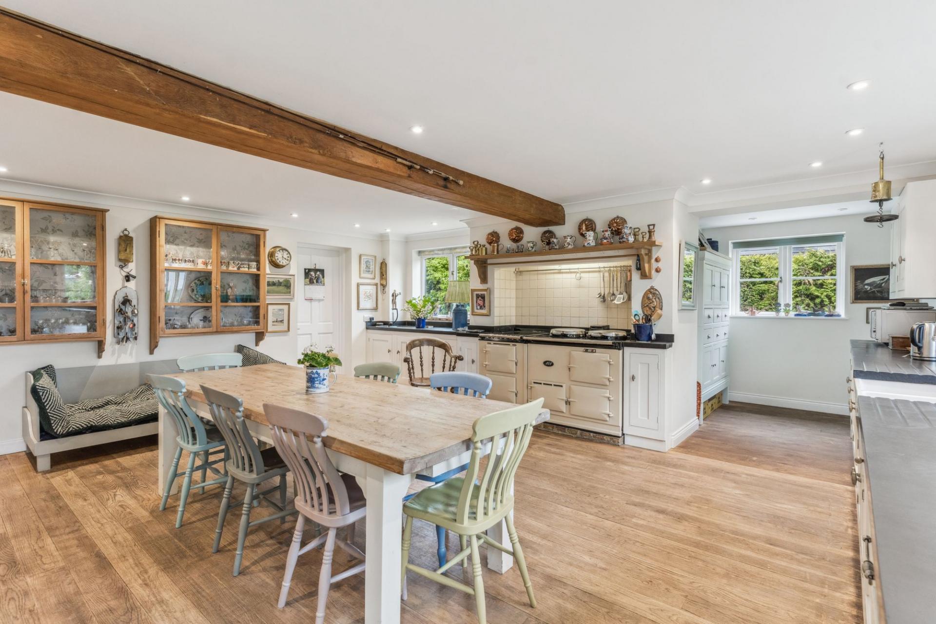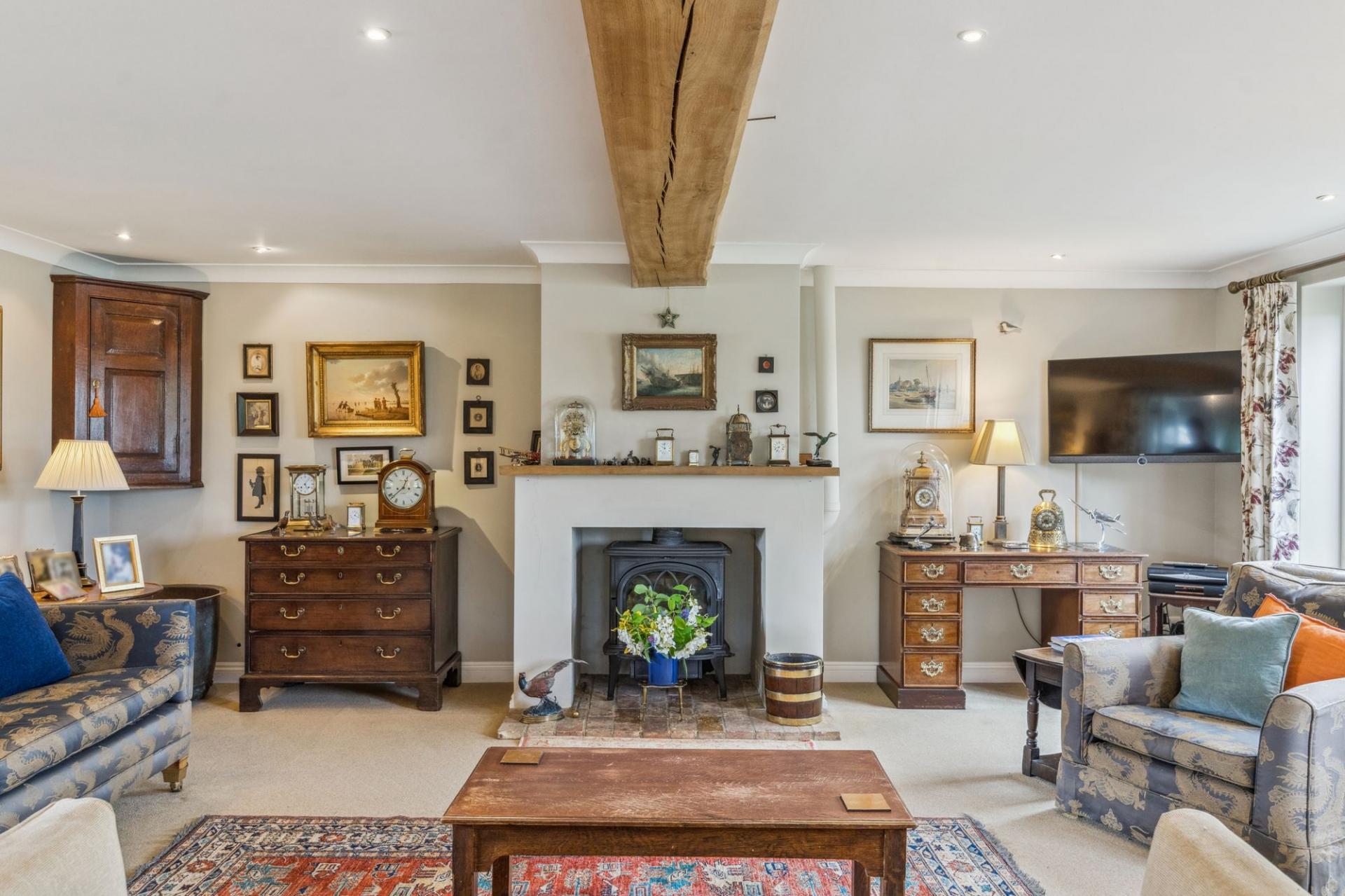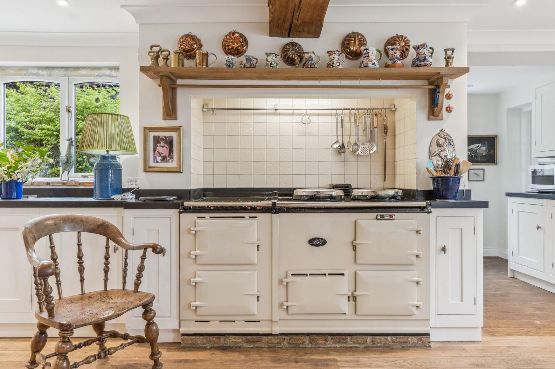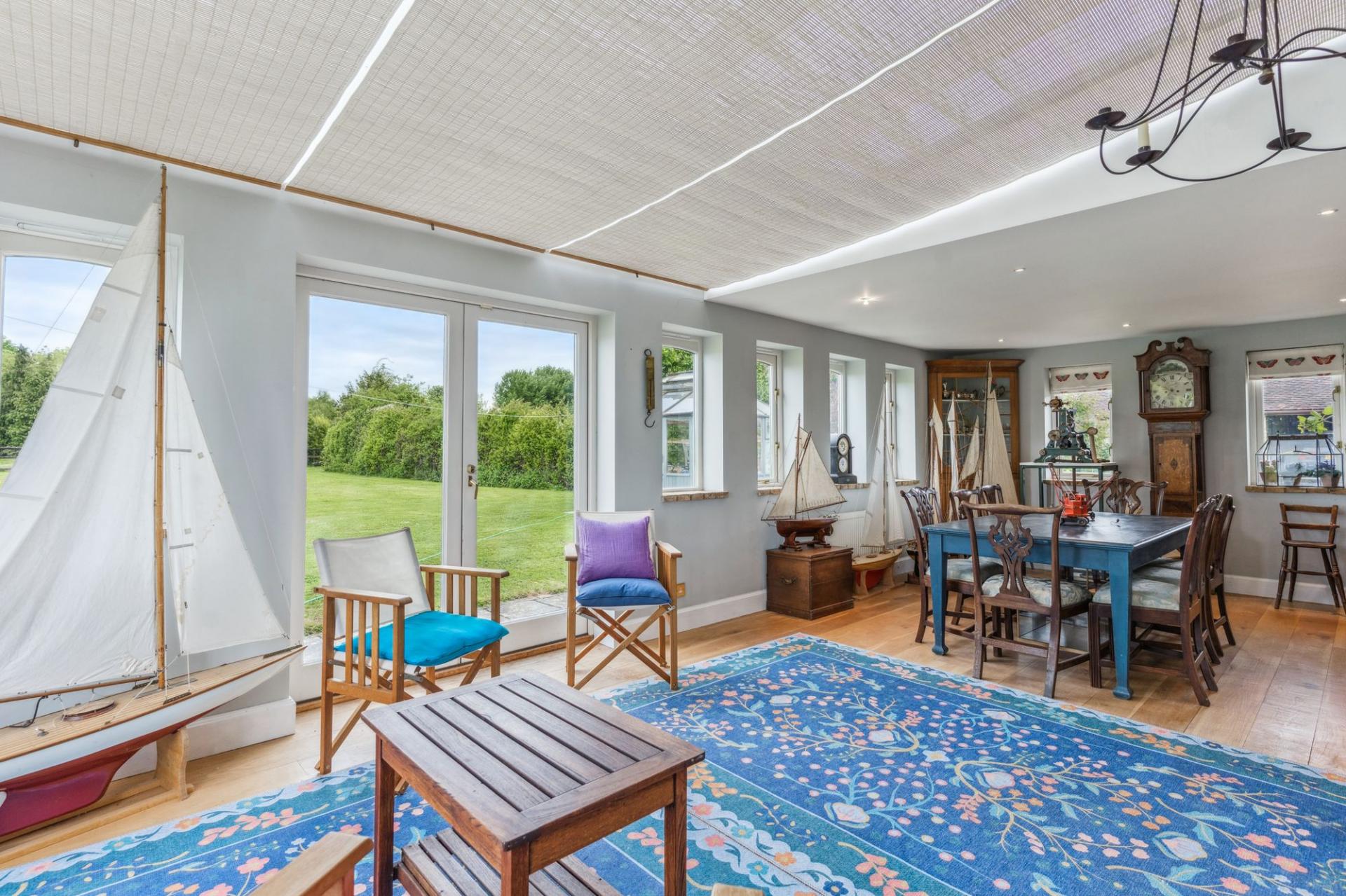 The main house is approached via electric gates leading to a spacious gravel driveway and formal entrance porch. Inside, the reception hall leads to five characterful reception rooms, each with its own sense of space and charm. The triple-aspect sitting room, complete with a wood-burning stove and garden views, flows into a beautifully glazed garden room that captures the changing light throughout the day. A second triple-aspect family room also enjoys a wood-burning stove, while the formal dining room—connected to the kitchen and family room—offers a flexible entertaining space for formal gatherings. The heart of the home is a character-rich kitchen/breakfast room with farmhouse cabinetry, a fitted Aga, double butler sink, granite worktops, and a large walk-in pantry with oak shelving. A stable door opens to the gardens, further connecting the interior with the stunning outdoor landscape. A cloakroom and utility room complete the ground floor accommodation.