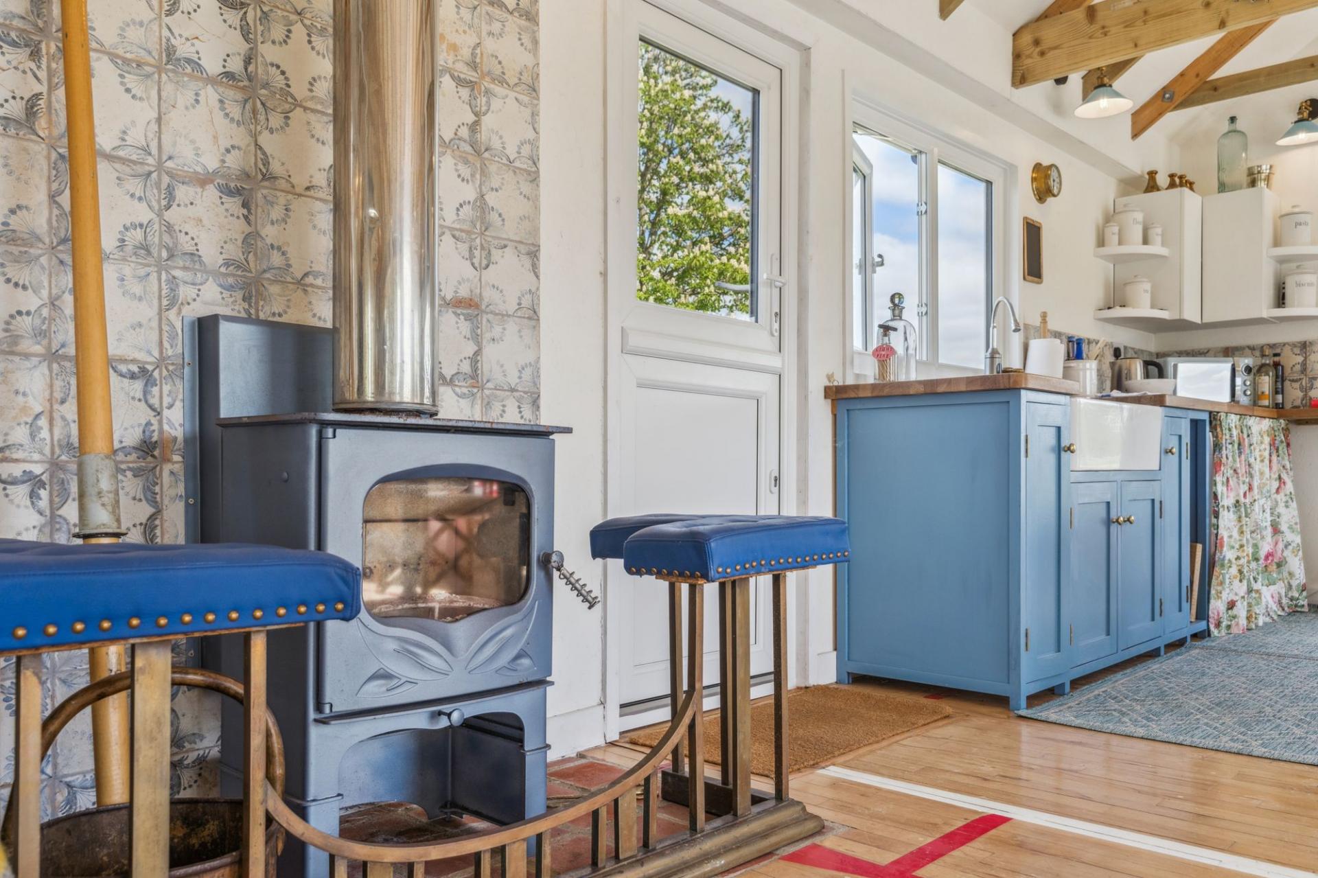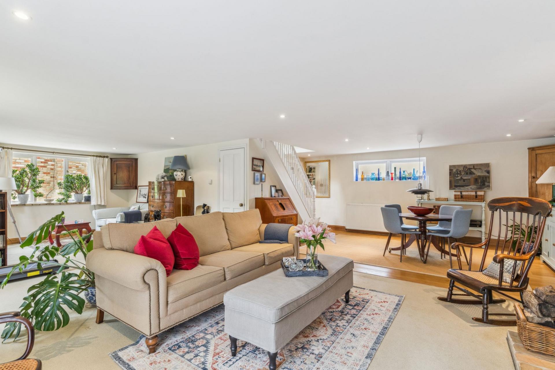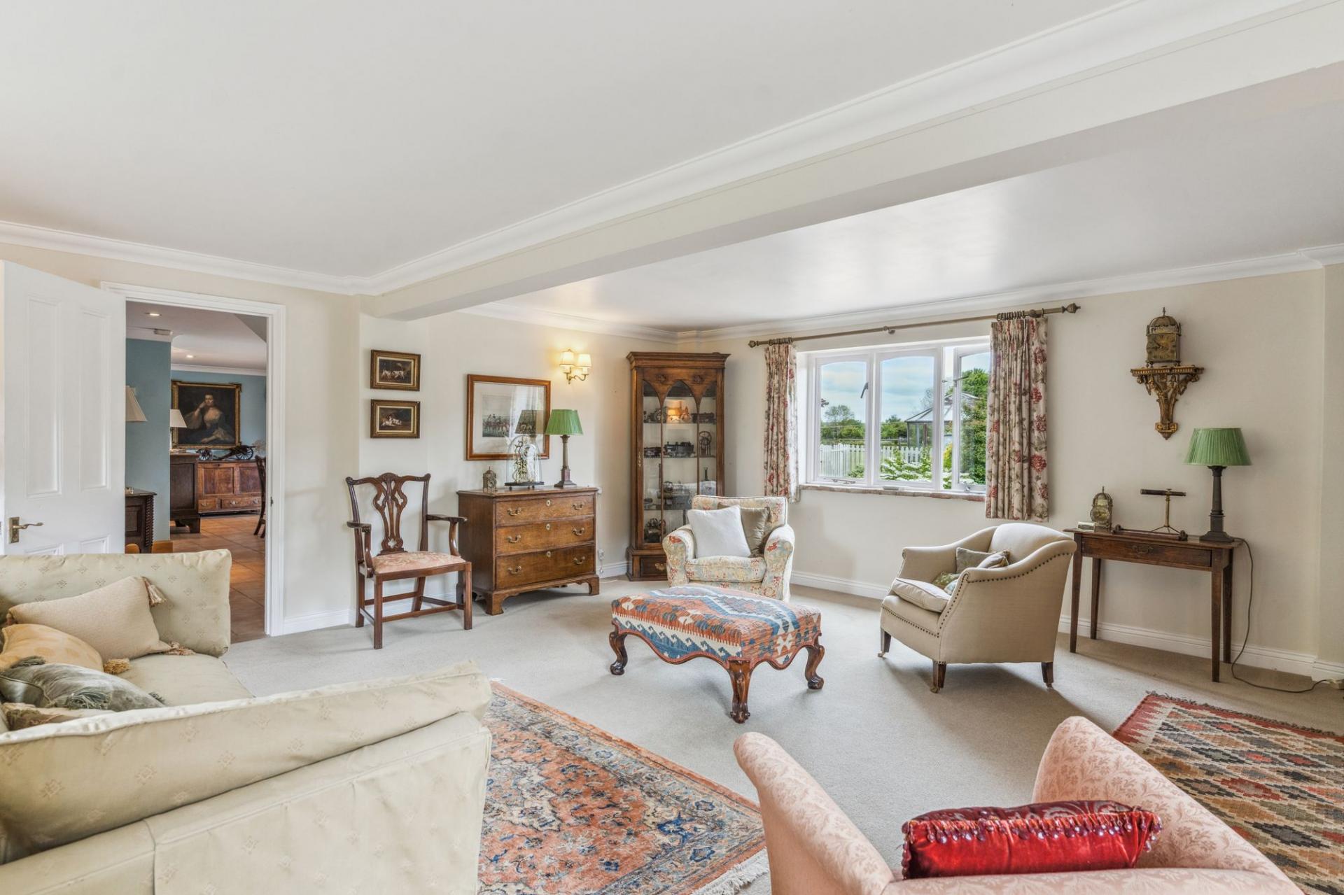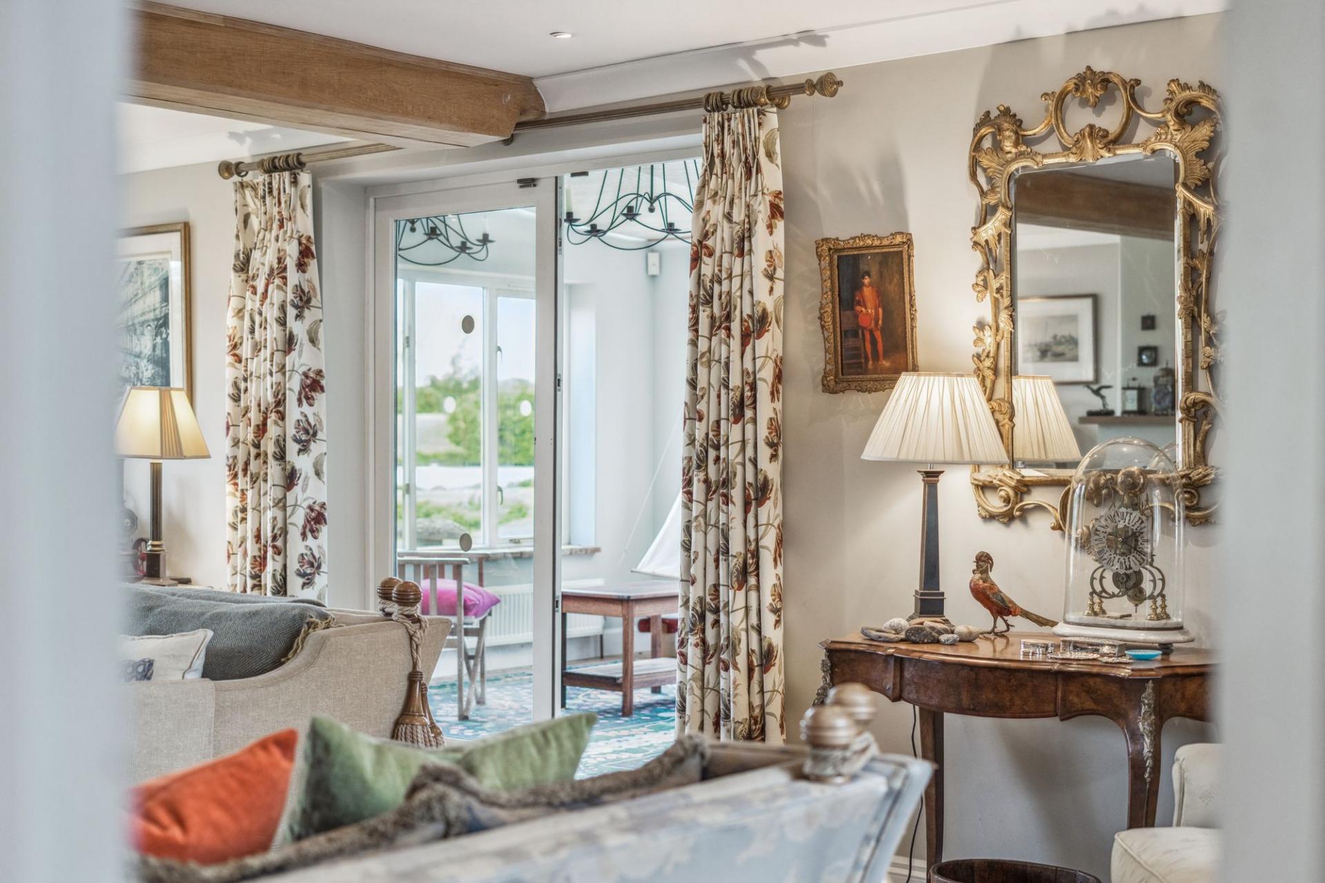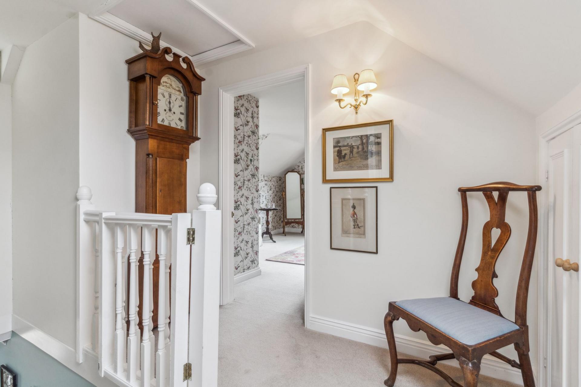 The main house is approached via electric gates leading to a spacious gravel driveway and formal entrance porch. Inside, the reception hall leads to five characterful reception rooms, each with its own sense of space and charm. The triple-aspect sitting room, complete with a wood-burning stove and garden views, flows into a beautifully glazed garden room that captures the changing light throughout the day. A second triple-aspect family room also enjoys a wood-burning stove, while the formal dining room—connected to the kitchen and family room—offers a flexible entertaining space for formal gatherings. The heart of the home is a character-rich kitchen/breakfast room with farmhouse cabinetry, a fitted Aga, double butler sink, granite worktops, and a large walk-in pantry with oak shelving. A stable door opens to the gardens, further connecting the interior with the stunning outdoor landscape. A cloakroom and utility room complete the ground floor accommodation.