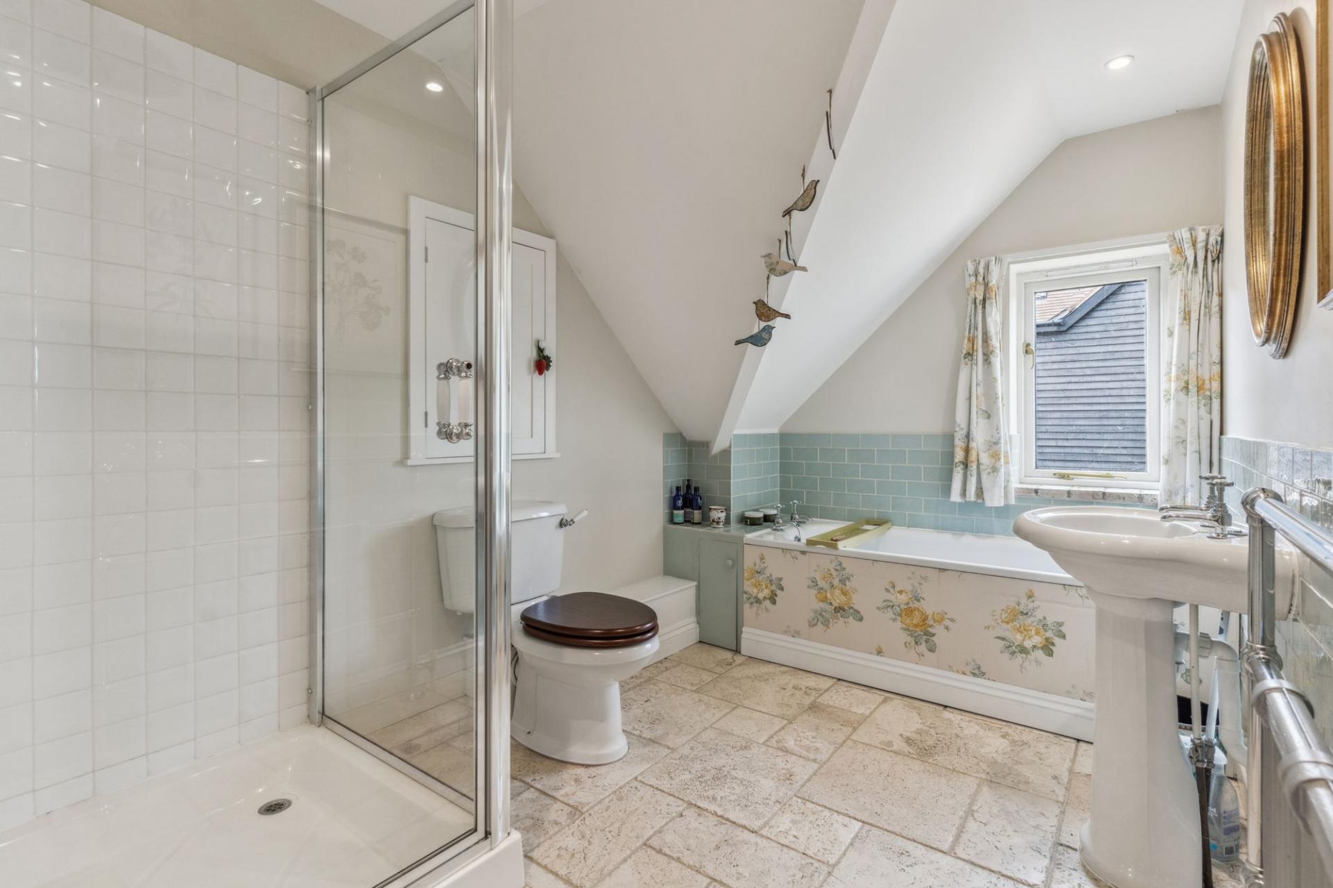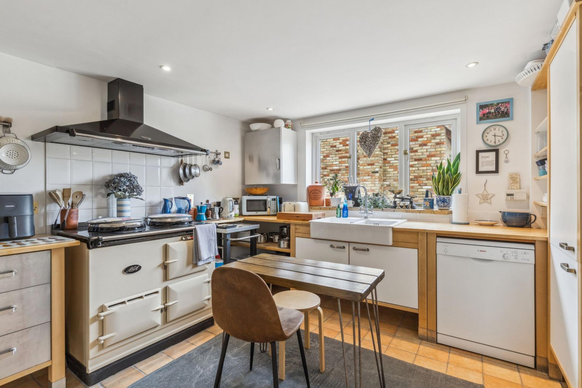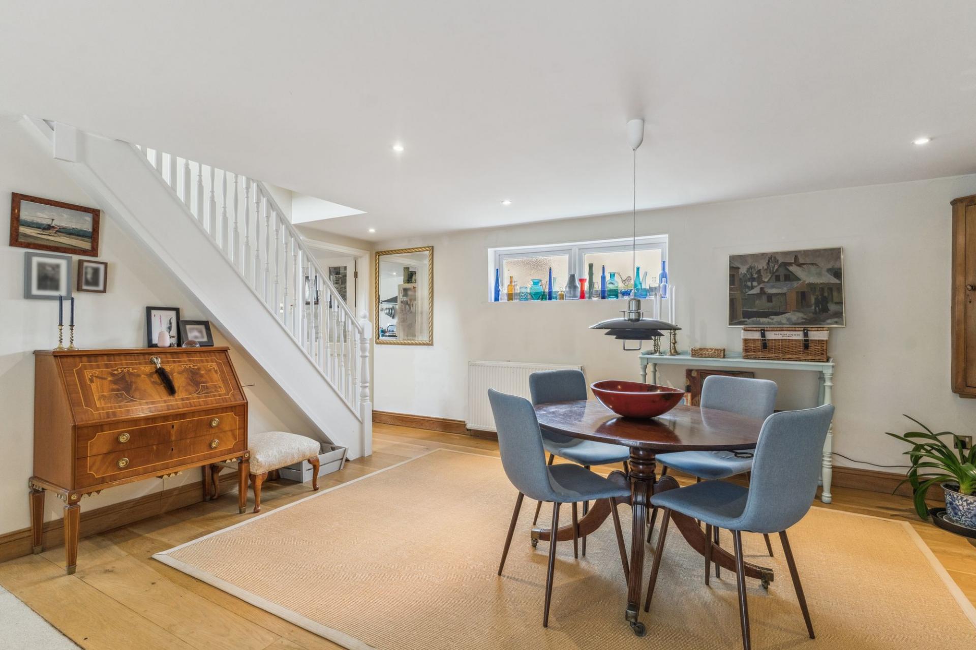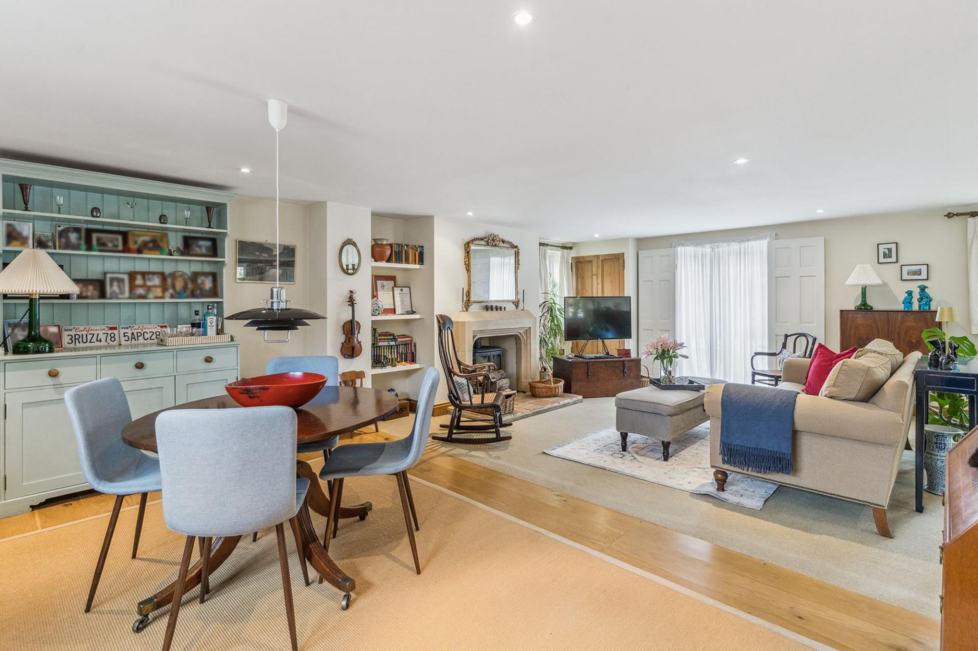 The main house is approached via electric gates leading to a spacious gravel driveway and formal entrance porch. Inside, the reception hall leads to five characterful reception rooms, each with its own sense of space and charm. The triple-aspect sitting room, complete with a wood-burning stove and garden views, flows into a beautifully glazed garden room that captures the changing light throughout the day. A second triple-aspect family room also enjoys a wood-burning stove, while the formal dining room—connected to the kitchen and family room—offers a flexible entertaining space for formal gatherings. The heart of the home is a character-rich kitchen/breakfast room with farmhouse cabinetry, a fitted Aga, double butler sink, granite worktops, and a large walk-in pantry with oak shelving. A stable door opens to the gardens, further connecting the interior with the stunning outdoor landscape. A cloakroom and utility room complete the ground floor accommodation.