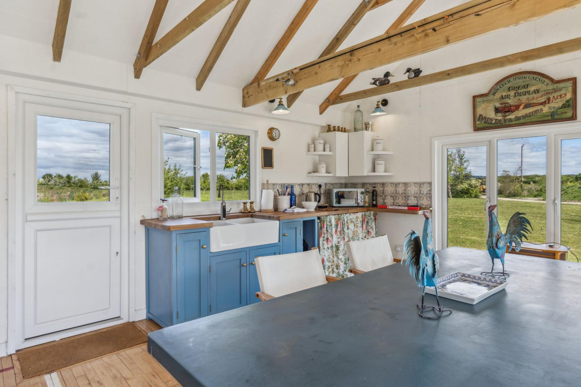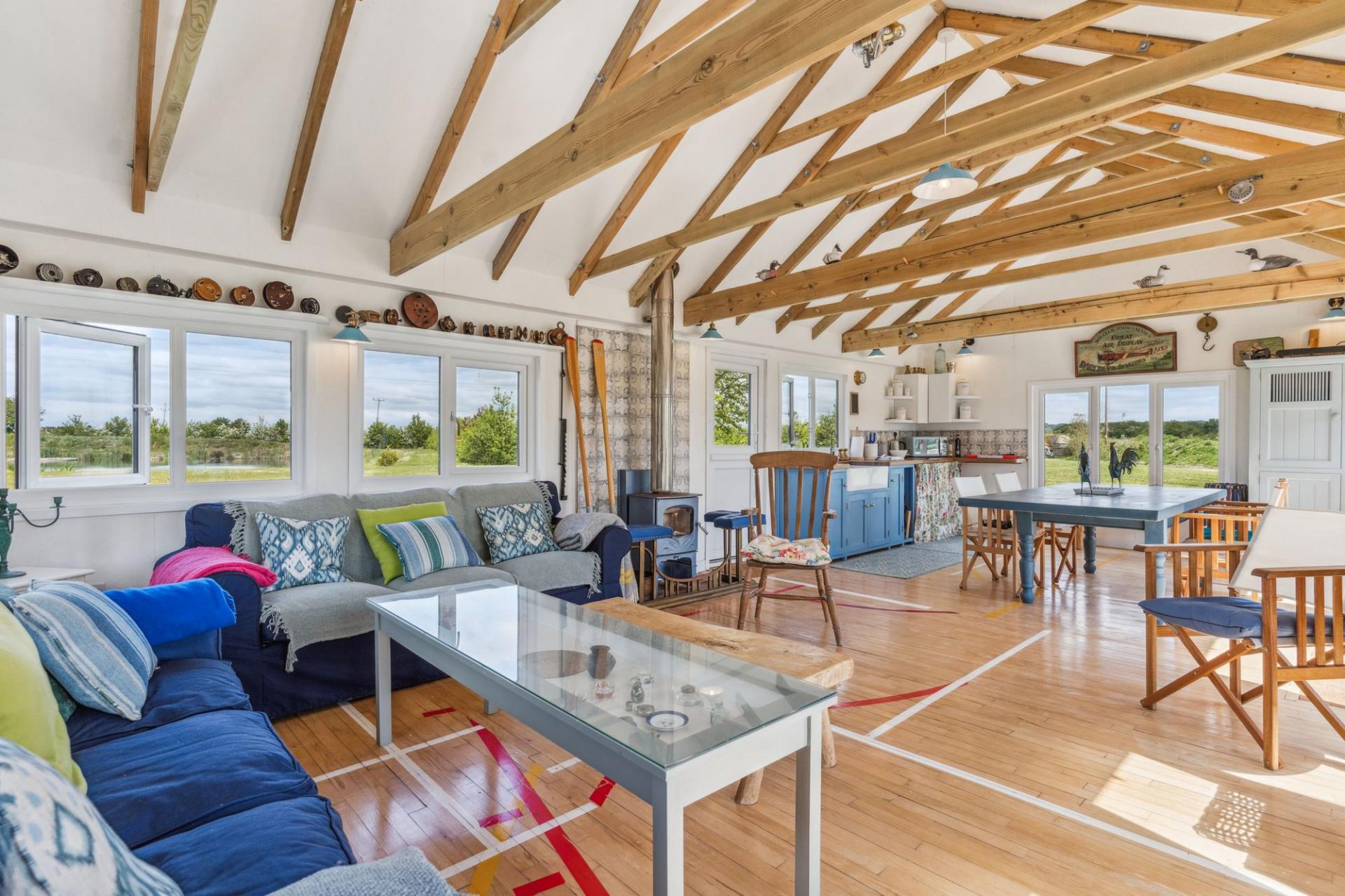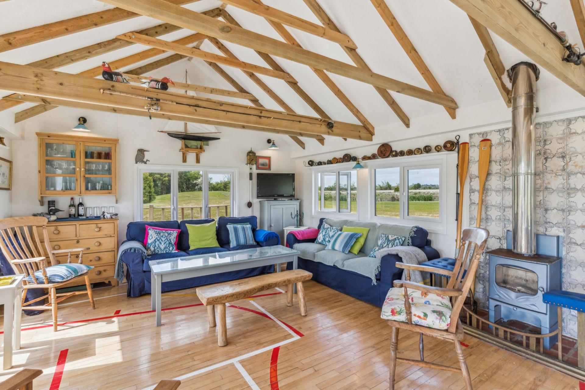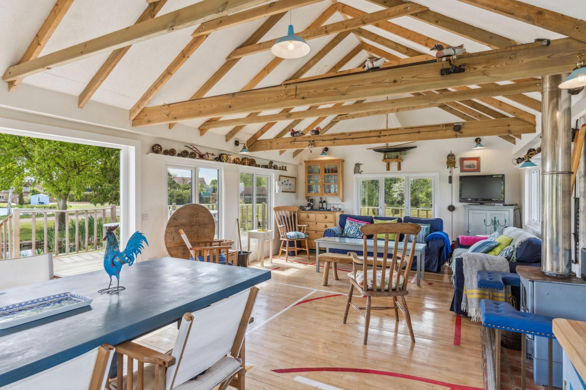 Within the grounds, a detached vaulted summer house adds further lifestyle value, offering a versatile studio or guest retreat. Featuring a fitted kitchen, wood-burning stove, plumbing for appliances, and double doors to a raised timber deck overlooking the lake, it is an enchanting space ideal for entertaining, working from home, or quiet reflection. Additional outbuildings include a large double garage, a double carport, a workshop with its own WC, a greenhouse, and a studio/workshop with power and light connected off the kitchen/breakfast room. The kitchen garden is partially walled and includes raised concrete beds, fig trees, and established planting.