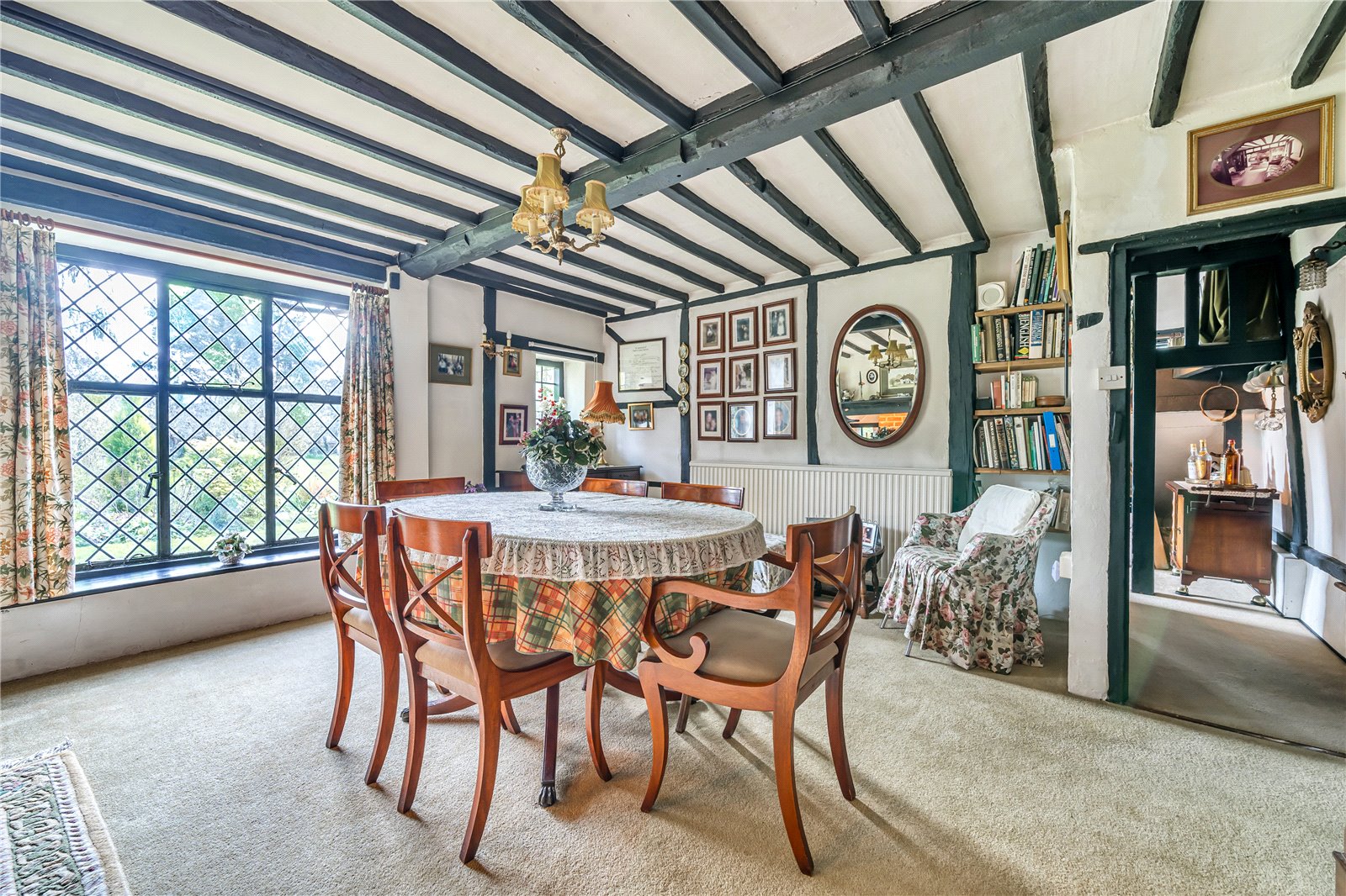 The inviting dining room showcases an impressive inglenook fireplace and picturesque views over the lawns and orchard.