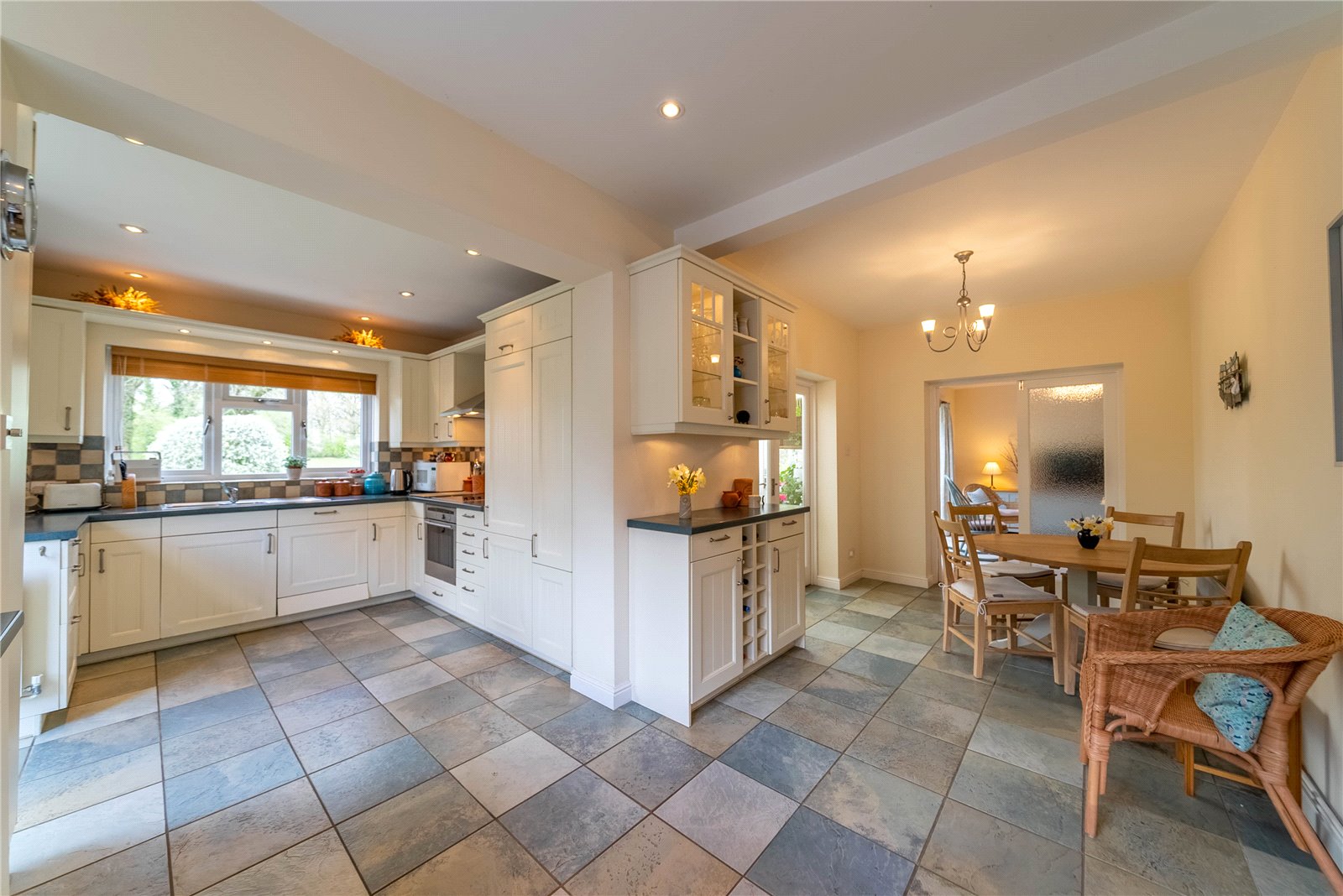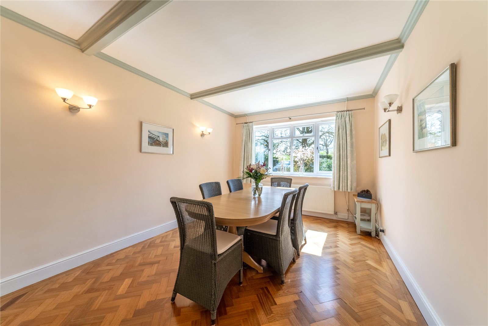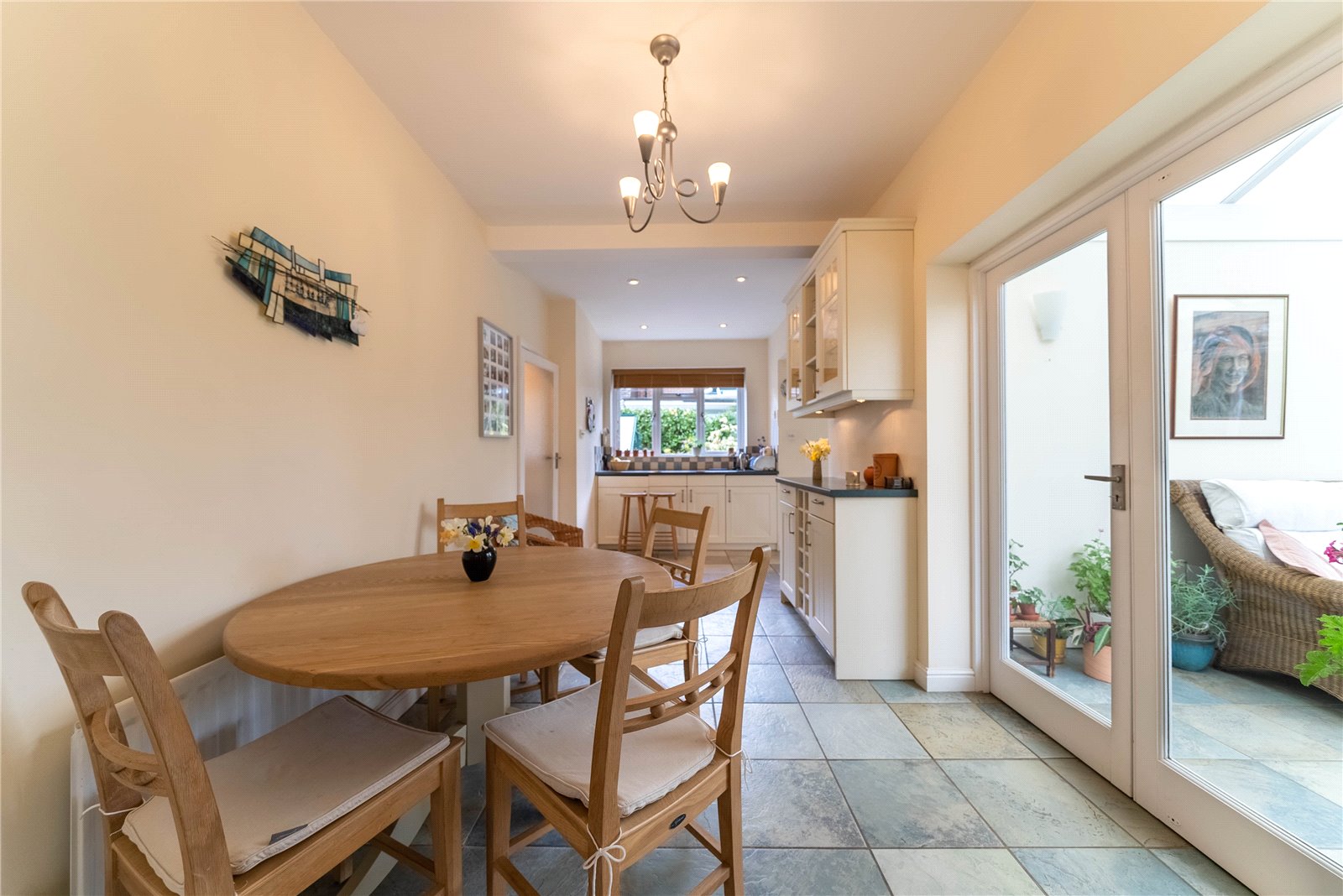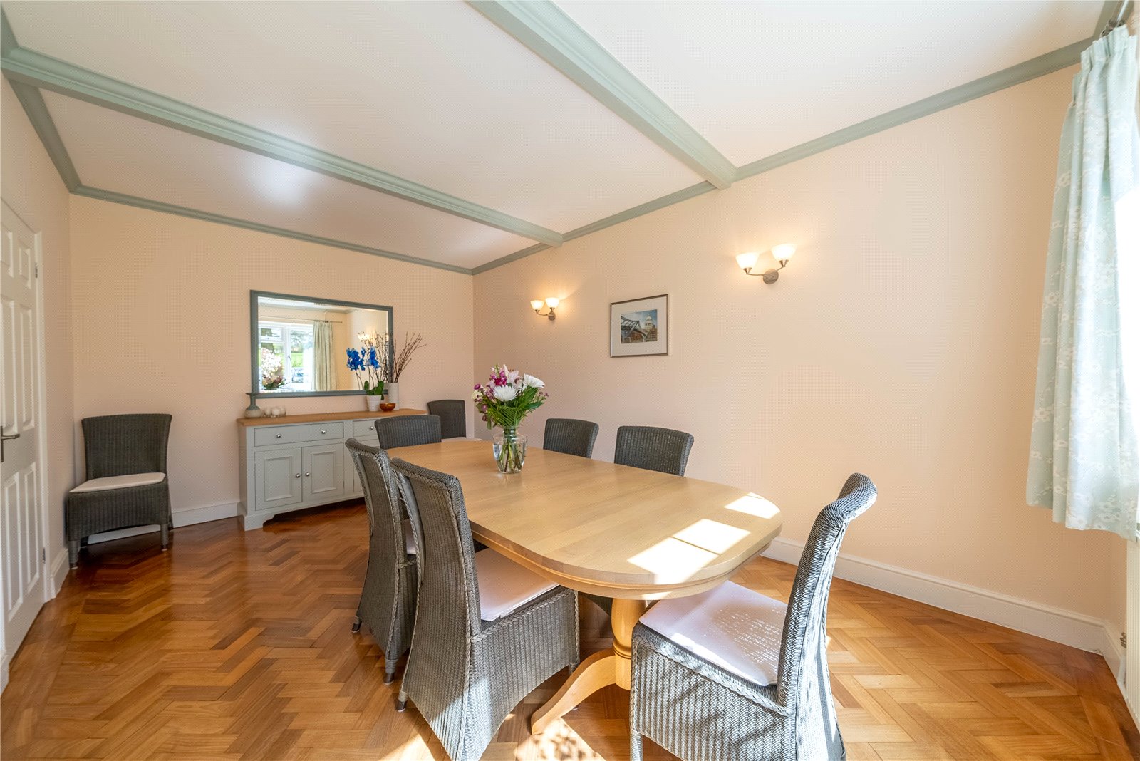 A bright, welcoming reception hall with a ground floor cloakroom leads to a spacious front aspect dining room with wood floor and a lovely outlook over the front garden and across to fields beyond.