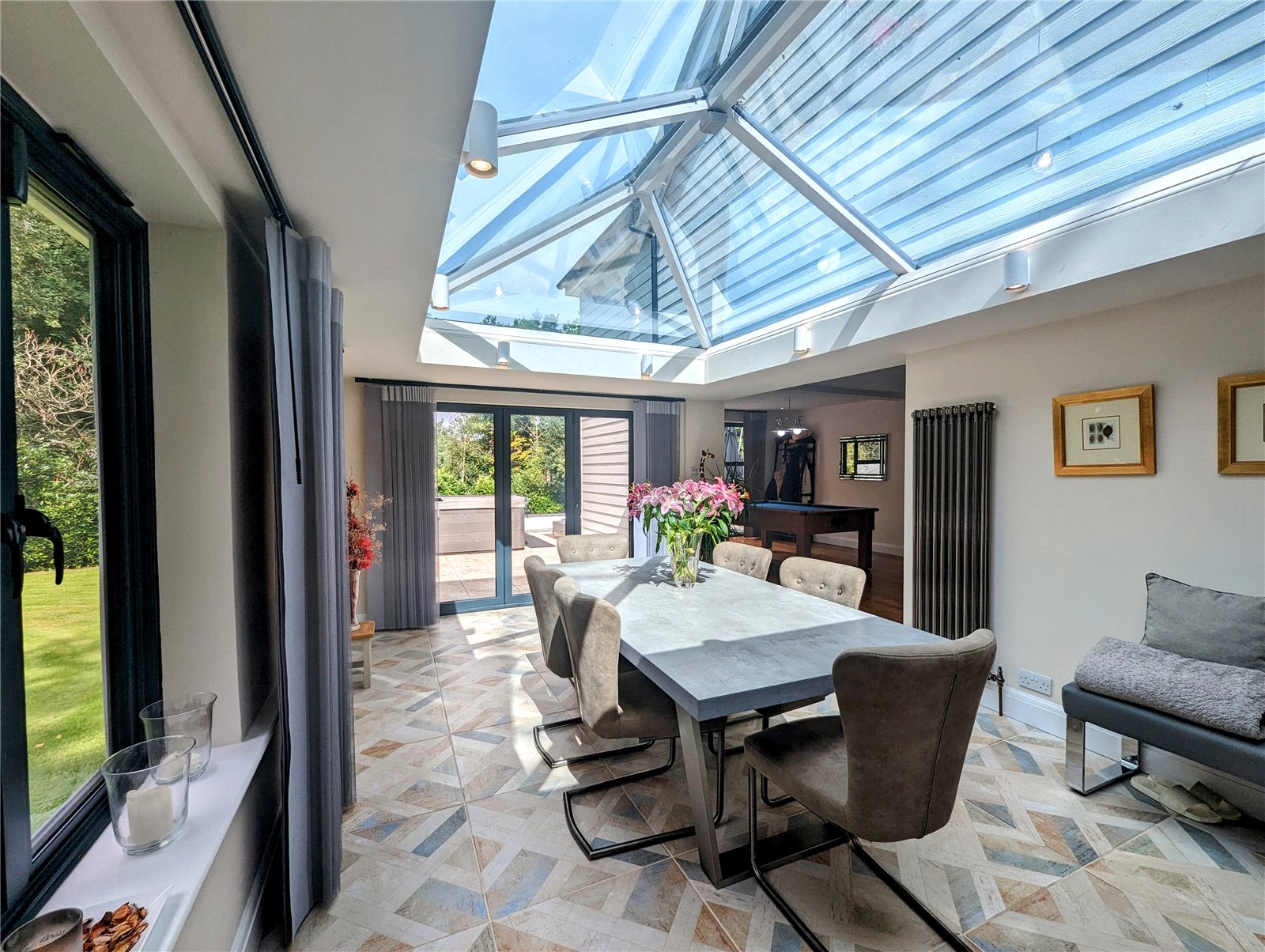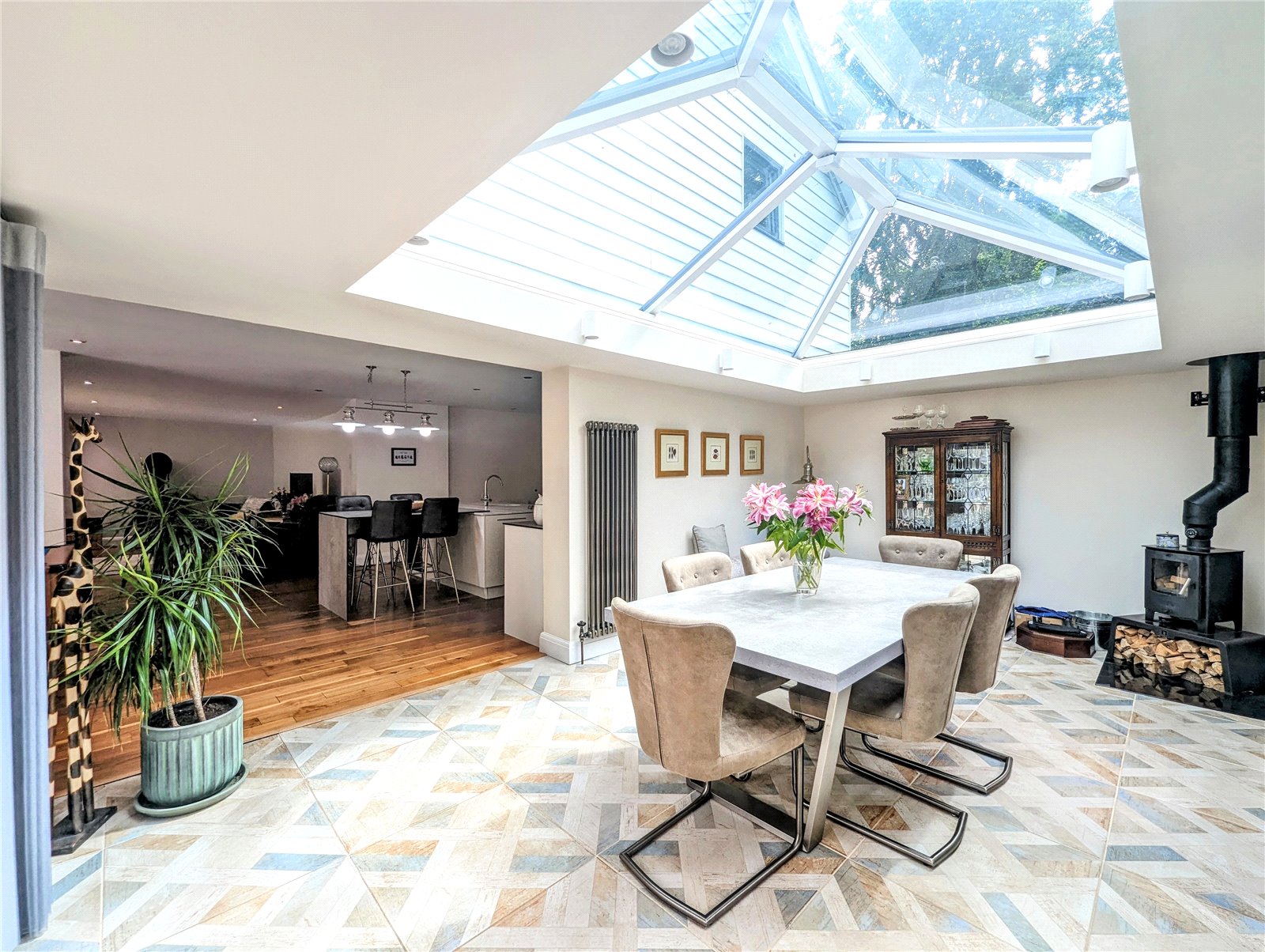 Adjacent to the kitchen is a dual-aspect dining room, enhanced by a vaulted skylight that bathes the space in natural radiance. Sliding doors open onto the patio and rear garden, creating an enchanting setting for entertaining or quiet al fresco dinners.