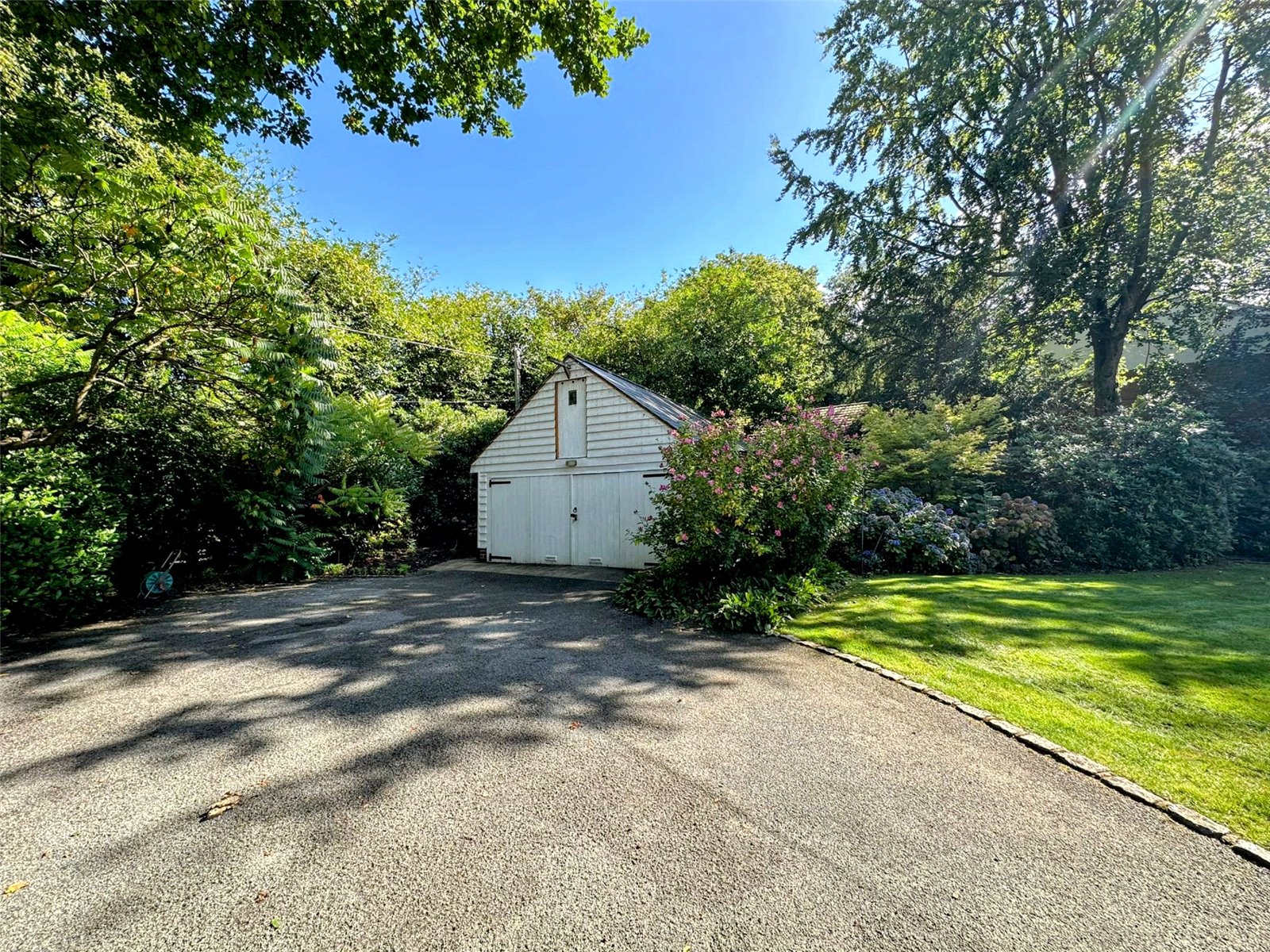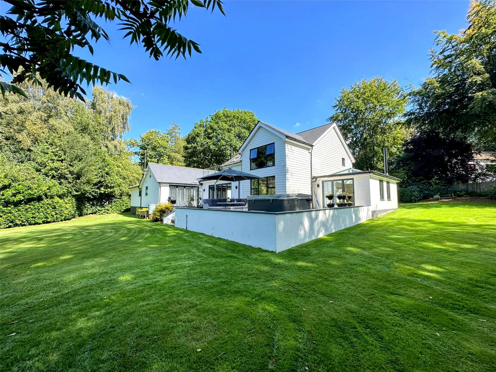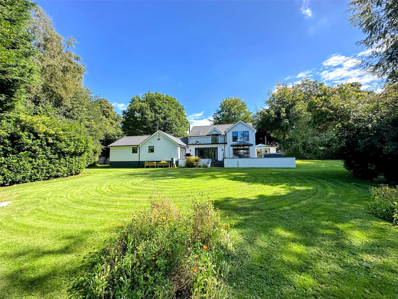 A splendid roof terrace, accessible from two first-floor bedrooms, is a private retreat offering a serene vantage point from which to enjoy the surrounding beauty of the mature garden. For those who work from home, a spacious study provides a tranquil environment for focus and productivity.
