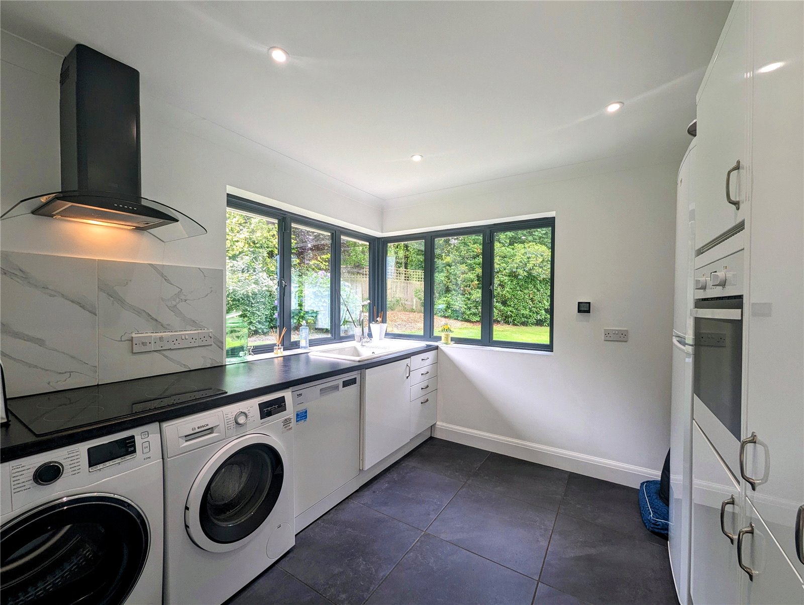 Practicality meets style in the utility room, complete with garden views and a separate side entrance. This thoughtful addition is perfect for returning from muddy dog walks or unloading groceries.