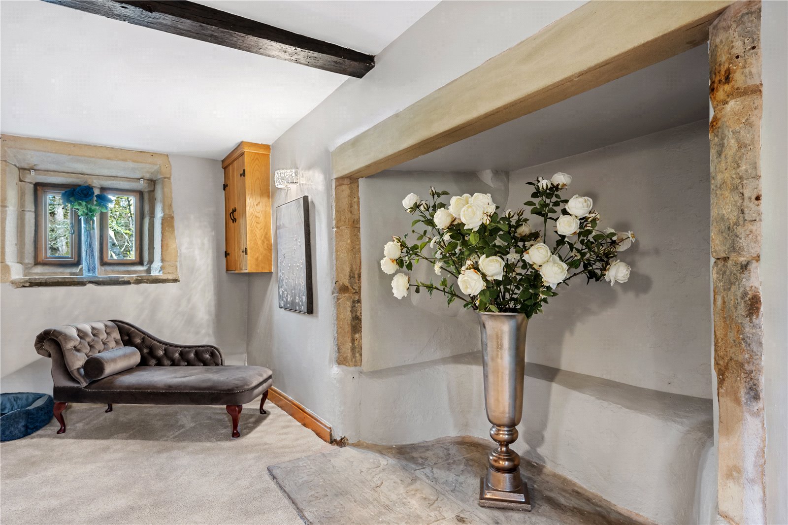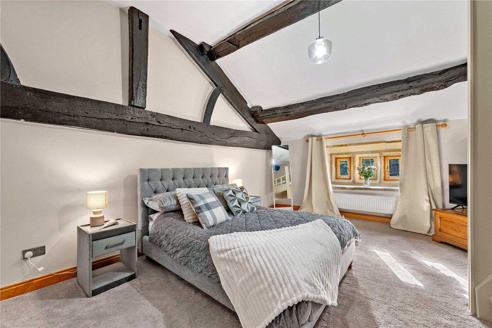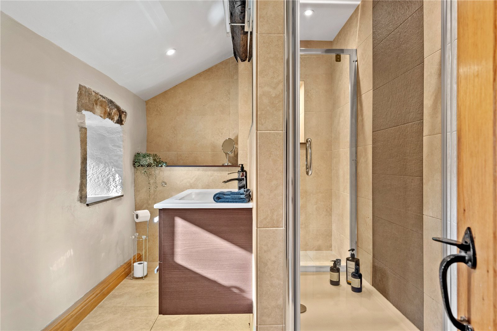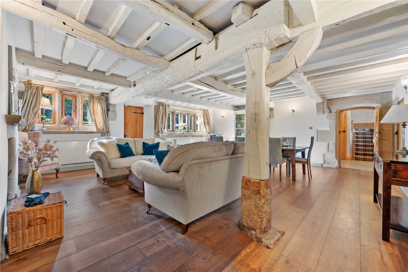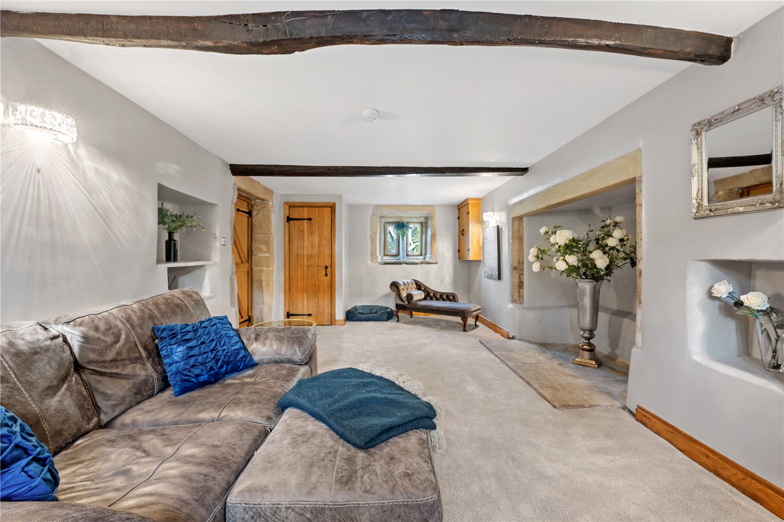 Upstairs, the home’s heritage shines through with exposed beams and original stonework. The principal suite boasts a stunning modern en-suite shower room, while the additional two double bedrooms are equally generous in size. The house bathroom, recently designed and installed, is a masterpiece of elegance, featuring bespoke fittings that perfectly complement the home’s historic charm.