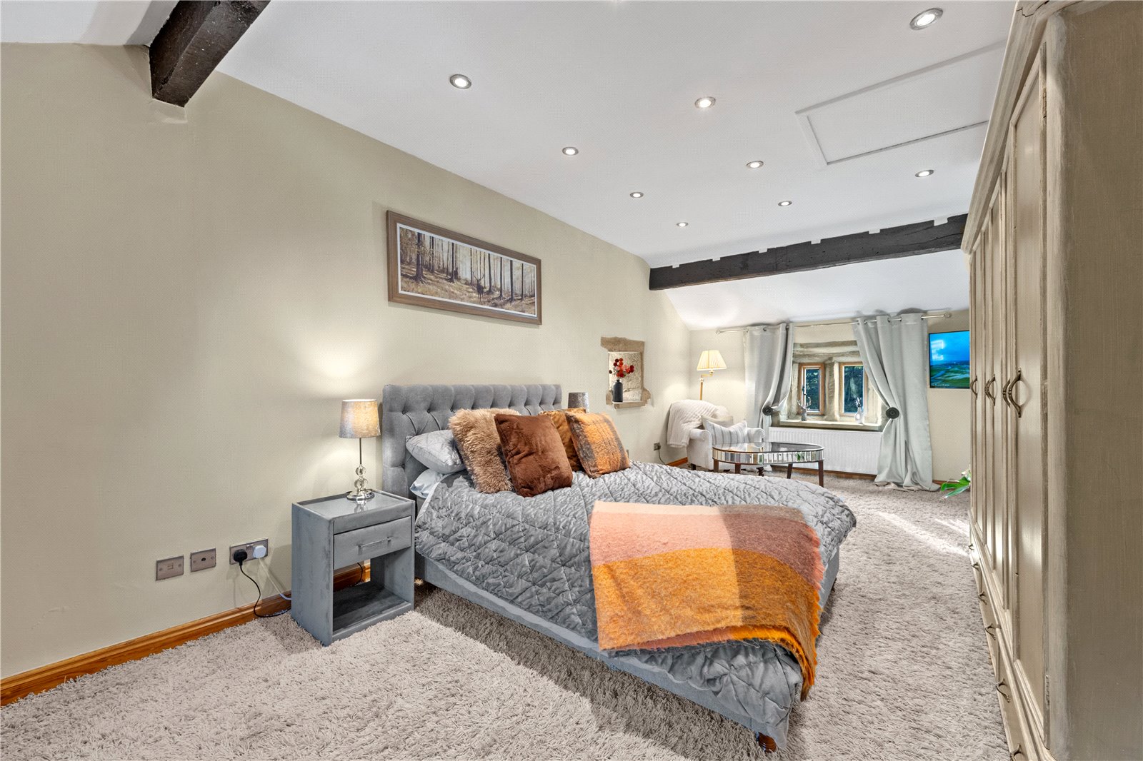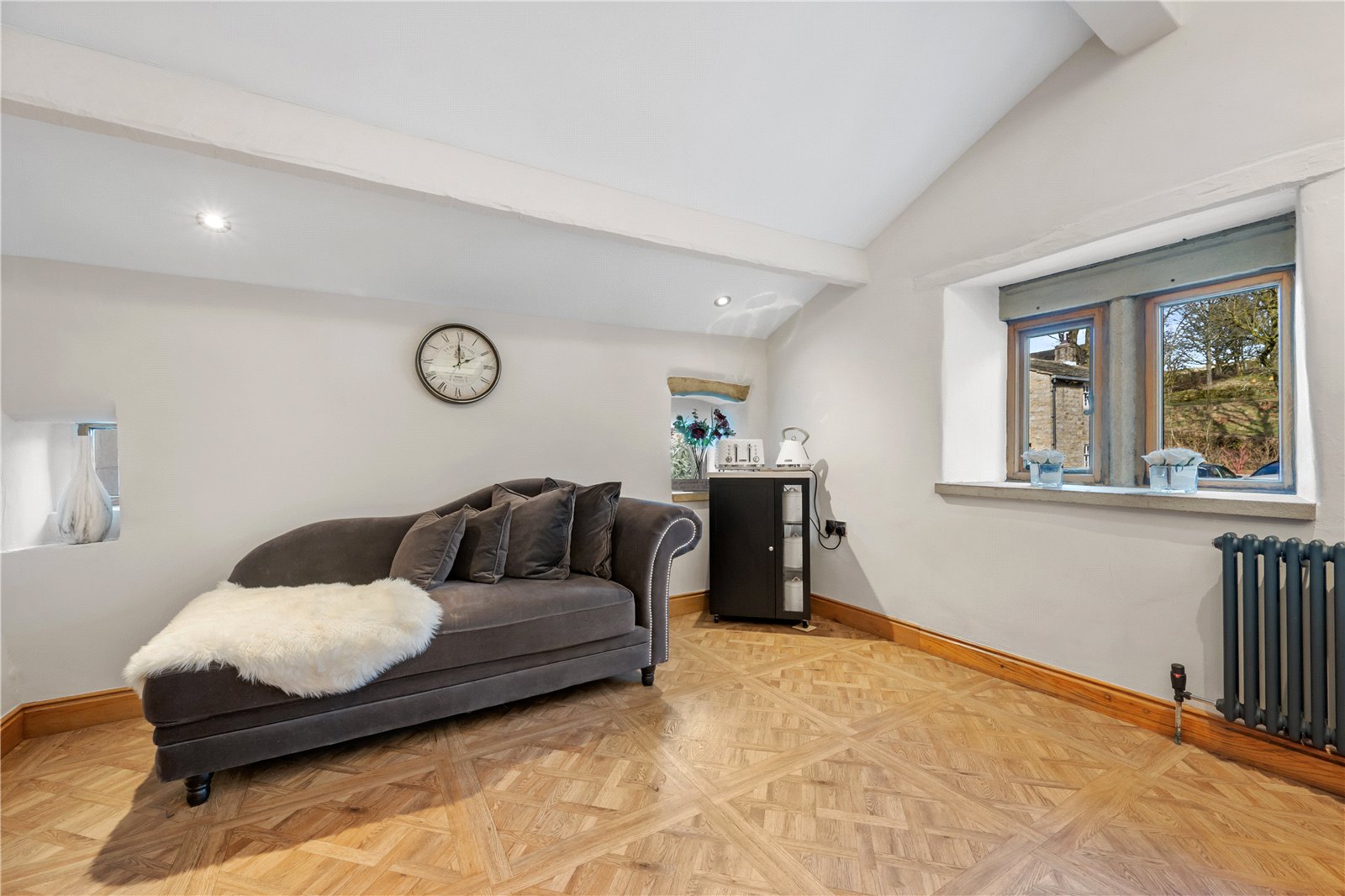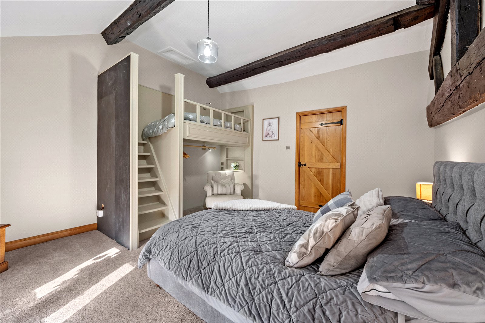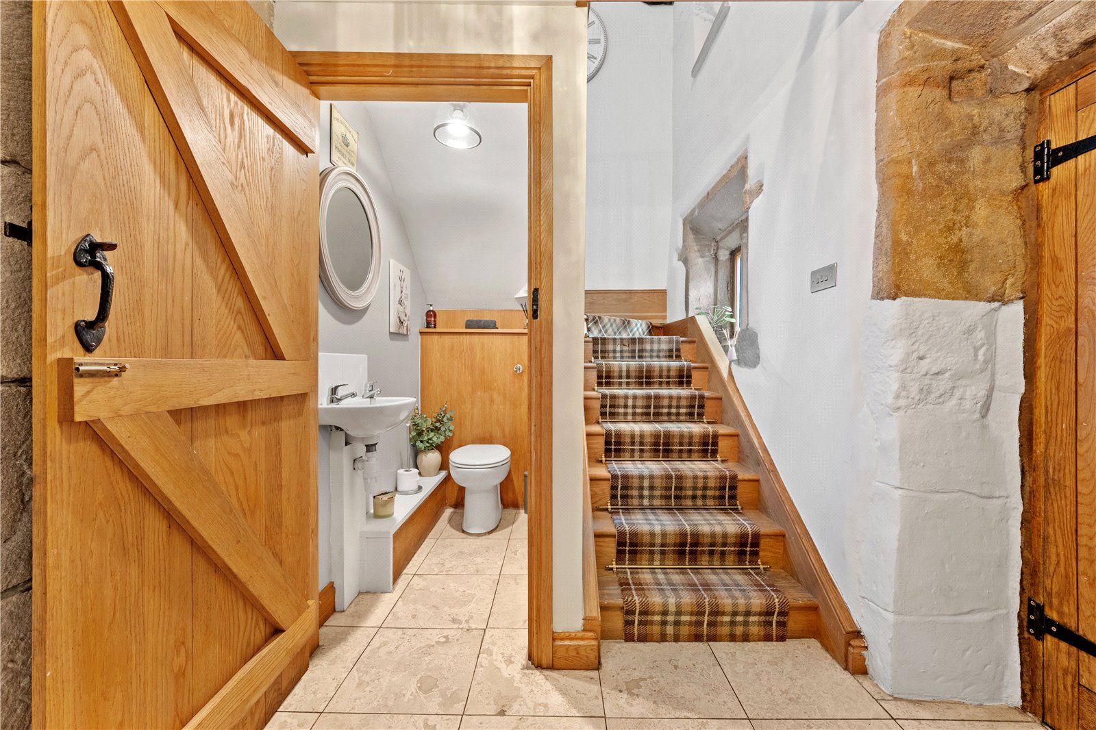 Upstairs, the home’s heritage shines through with exposed beams and original stonework. The principal suite boasts a stunning modern en-suite shower room, while the additional two double bedrooms are equally generous in size. The house bathroom, recently designed and installed, is a masterpiece of elegance, featuring bespoke fittings that perfectly complement the home’s historic charm.