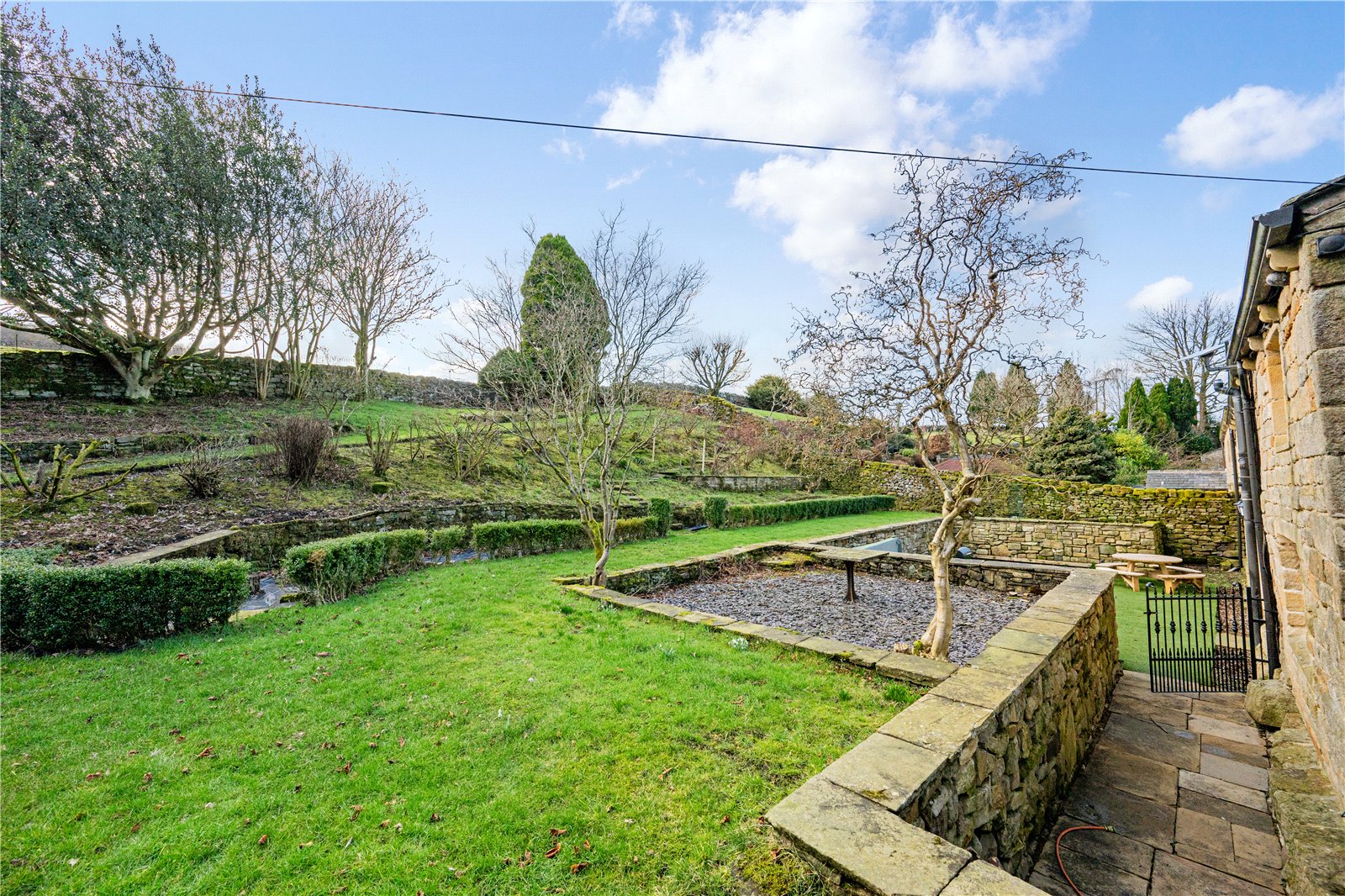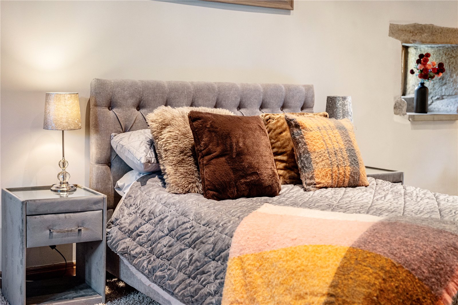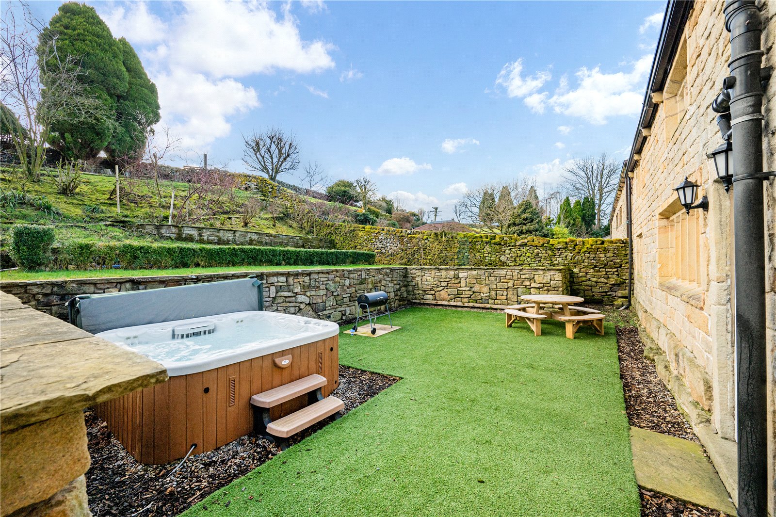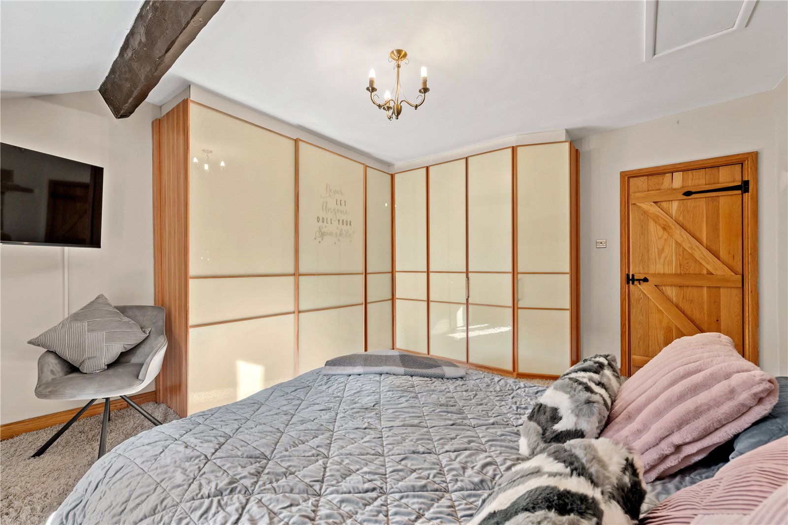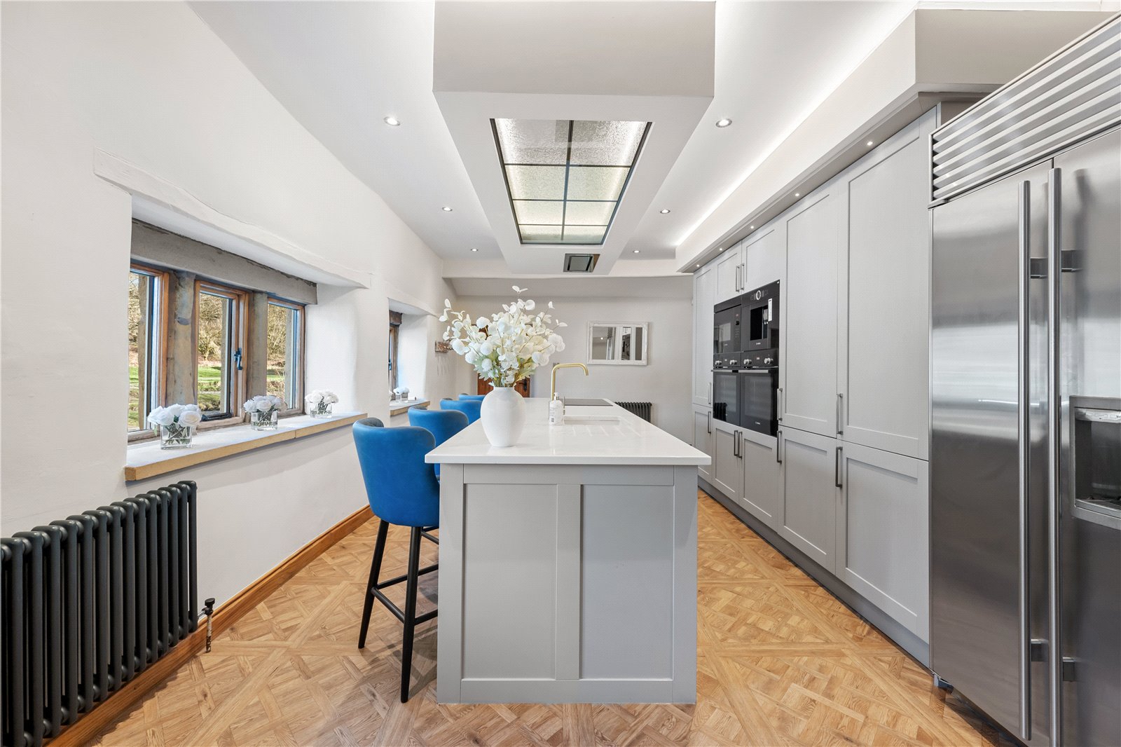 Upstairs, the home’s heritage shines through with exposed beams and original stonework. The principal suite boasts a stunning modern en-suite shower room, while the additional two double bedrooms are equally generous in size. The house bathroom, recently designed and installed, is a masterpiece of elegance, featuring bespoke fittings that perfectly complement the home’s historic charm.