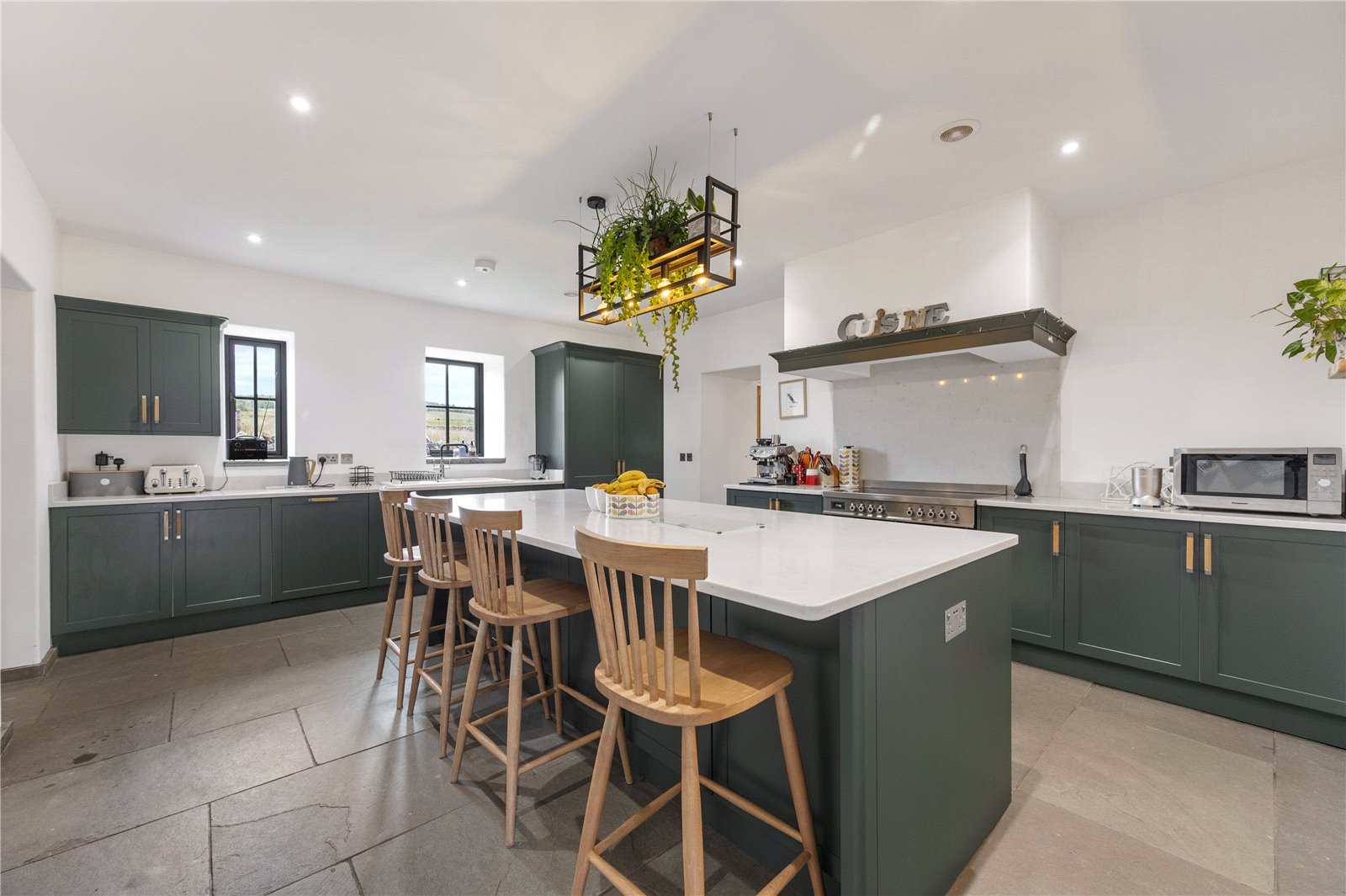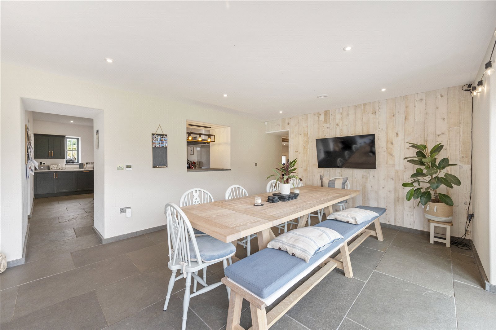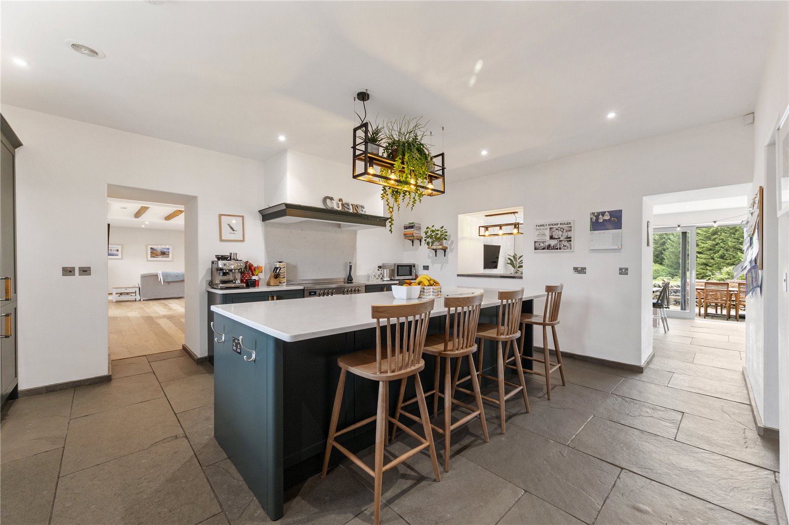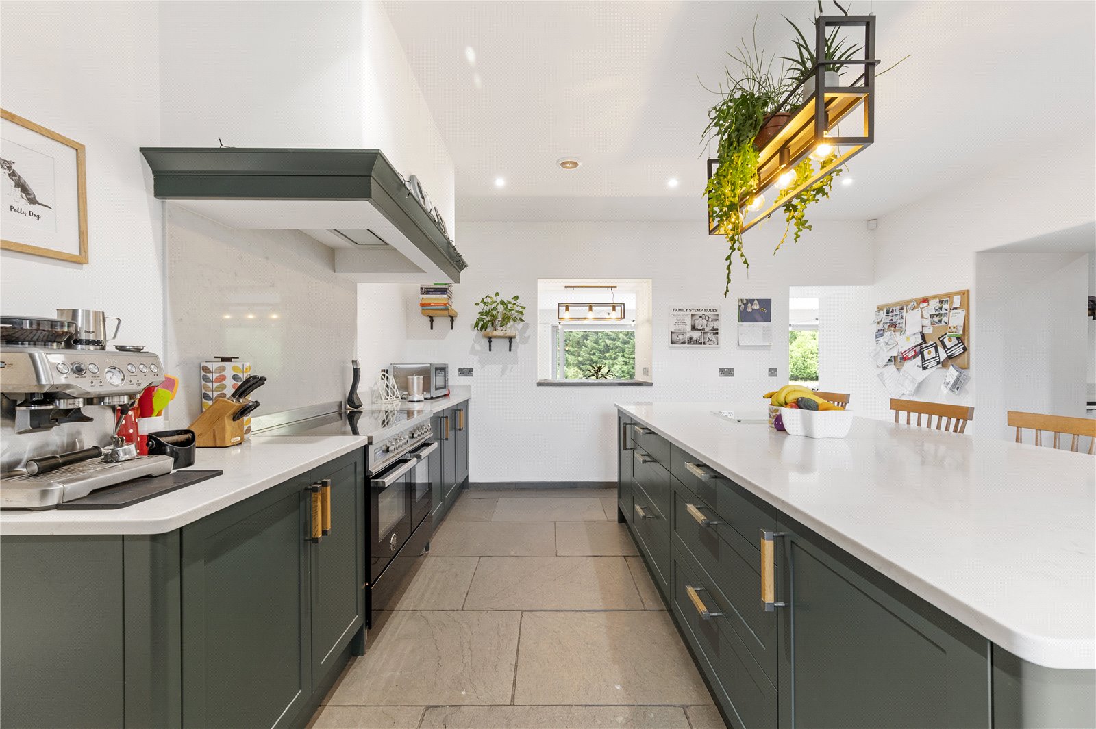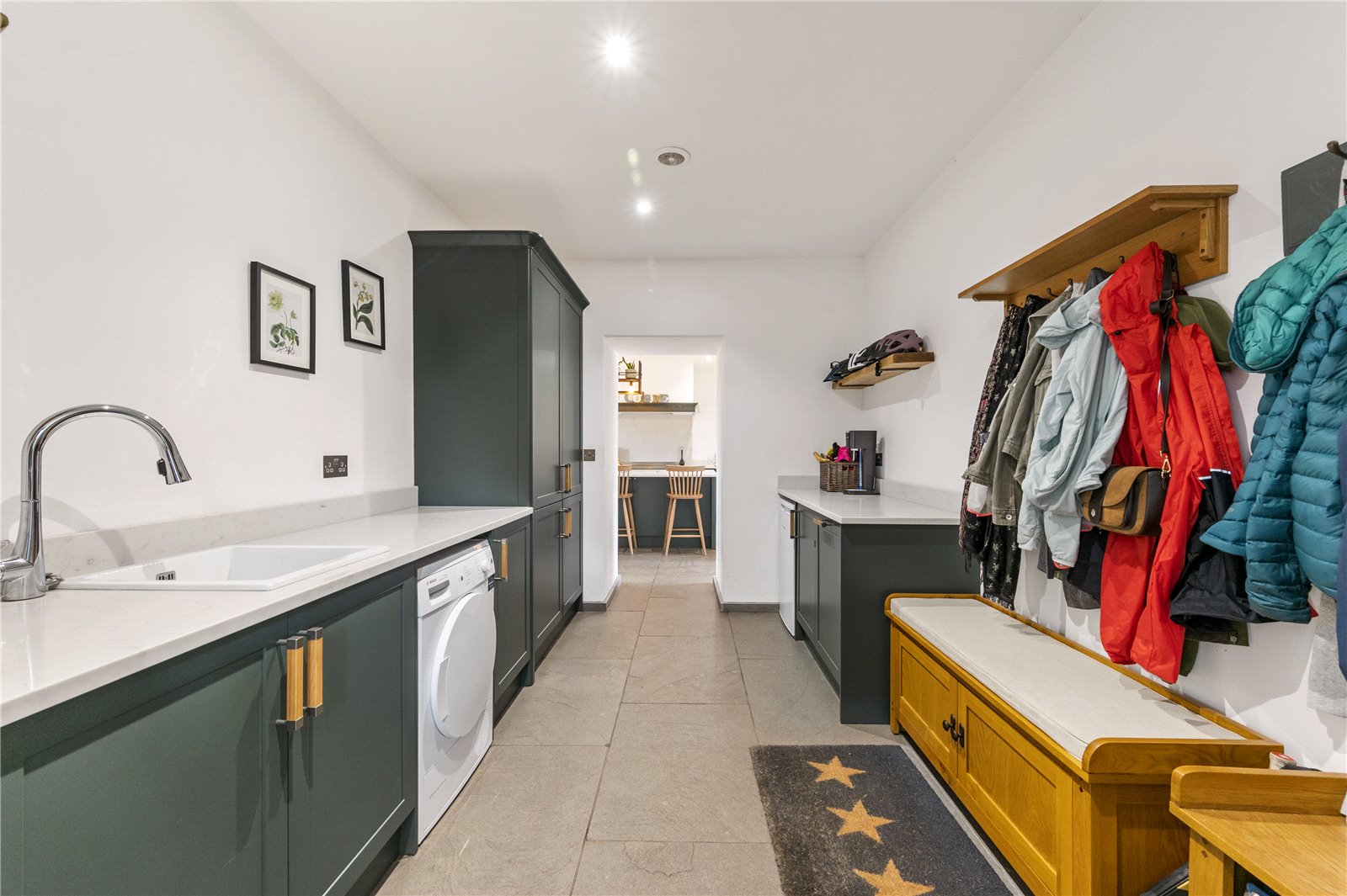 The kitchen is a heartwarming, family-friendly space. A generous central island draws people together with deep teal cabinetry concealing excellent storage, with integrated appliances seamlessly included and room for a focal Rangemaster cooker. The adjoining utility room, offers yet more storage and access to the side of the house.