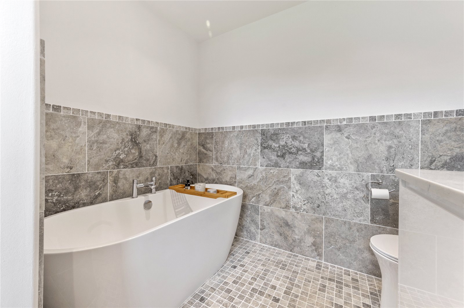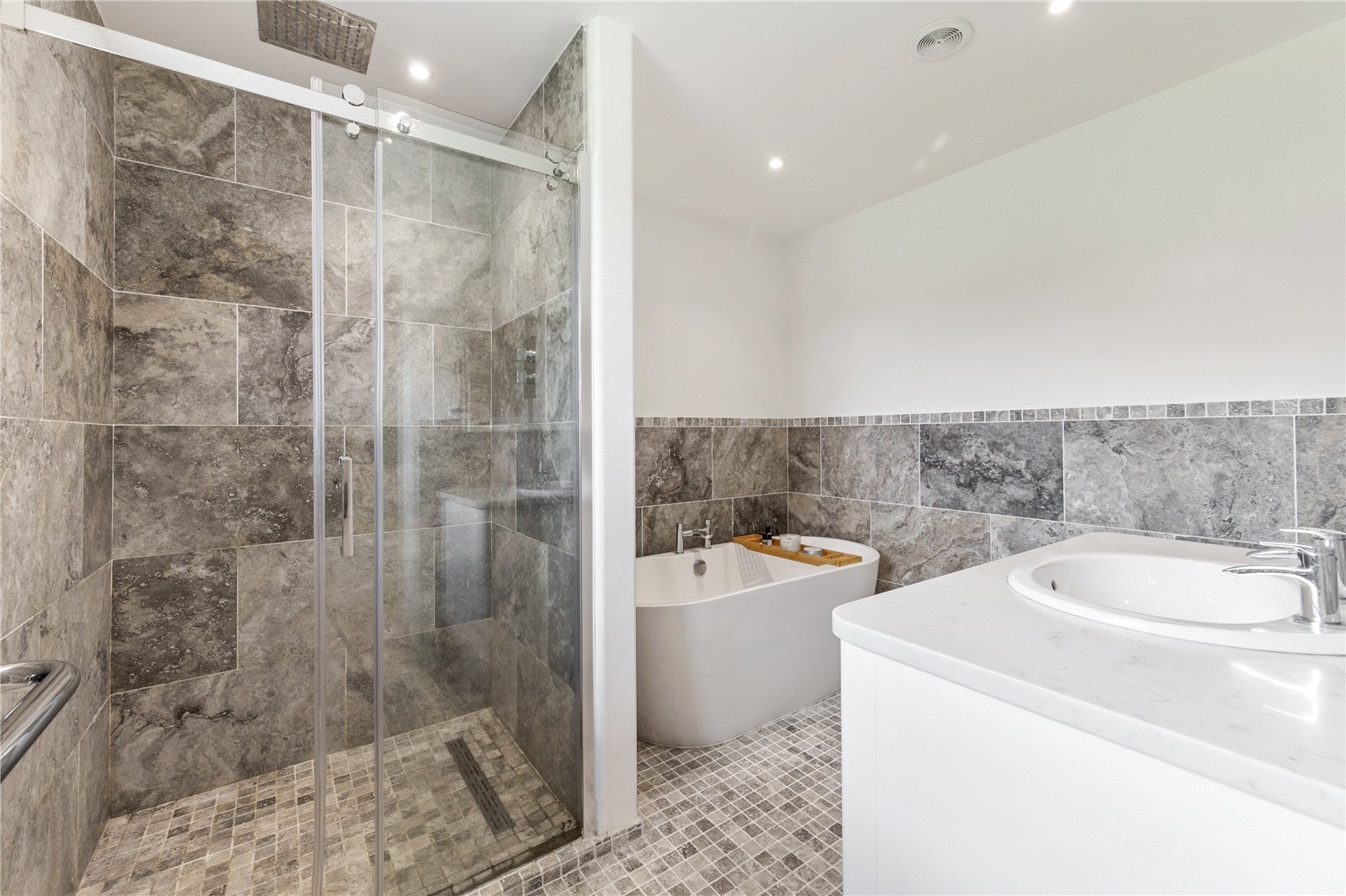 Upstairs, the landing leads to the principal suite -an elegant bedroom retreat with its own dressing room and a luxurious en suite finished in warm, natural tones. A freestanding bath beckons for a long soak, while the large walk-in shower, vanity, and additional storage make daily life feel effortless.