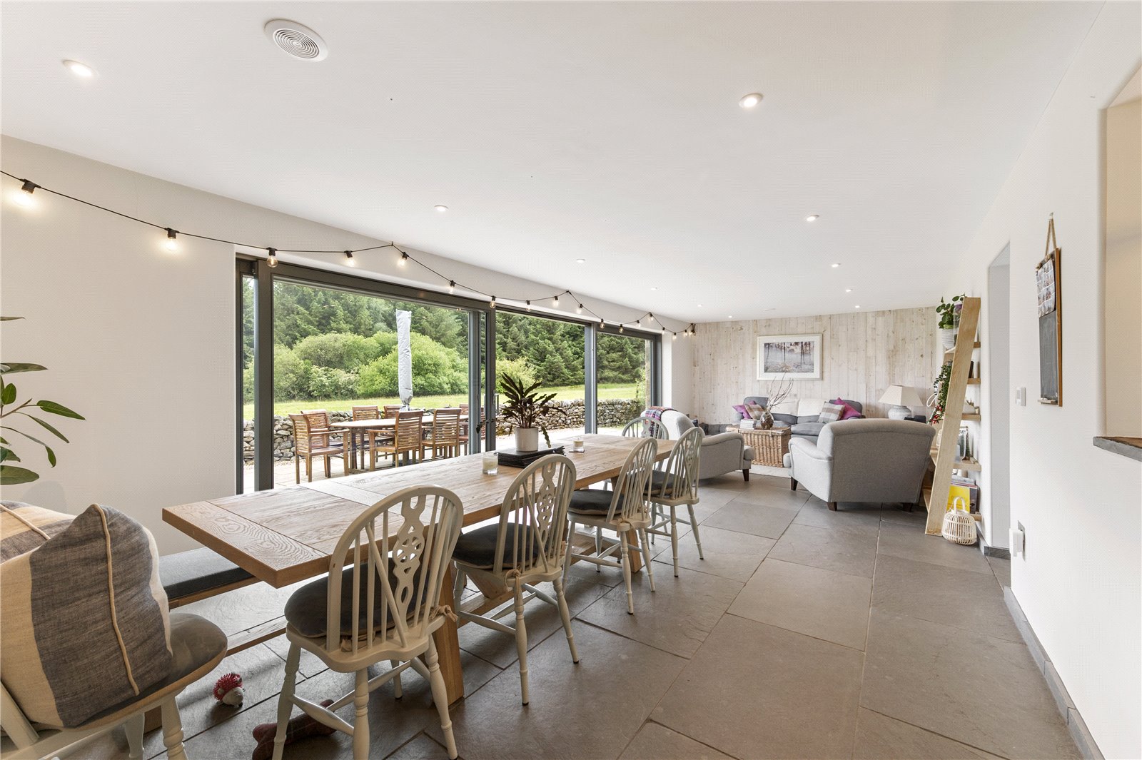 Flagstone floors lead through to the sunroom that is bathed in natural light and split into a snug at one end and dining space at the other. A wall of sliding glass frames uninterrupted views across the changing landscape and links this room effortlessly with the paved terrace beyond. It’s a room for all seasons, inviting you to host, relax, or simply watch the light move across the hills.