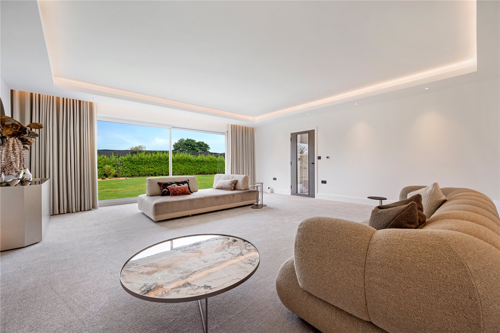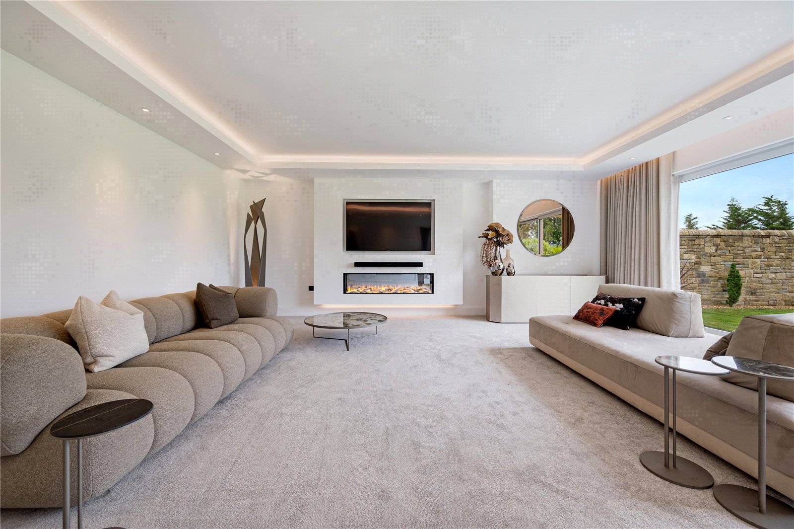 The large living room exudes modern elegance, featuring a sophisticated media wall with a built-in electric fire, ambient LED lighting, and sleek sliding patio doors that open to the tranquil rear garden.