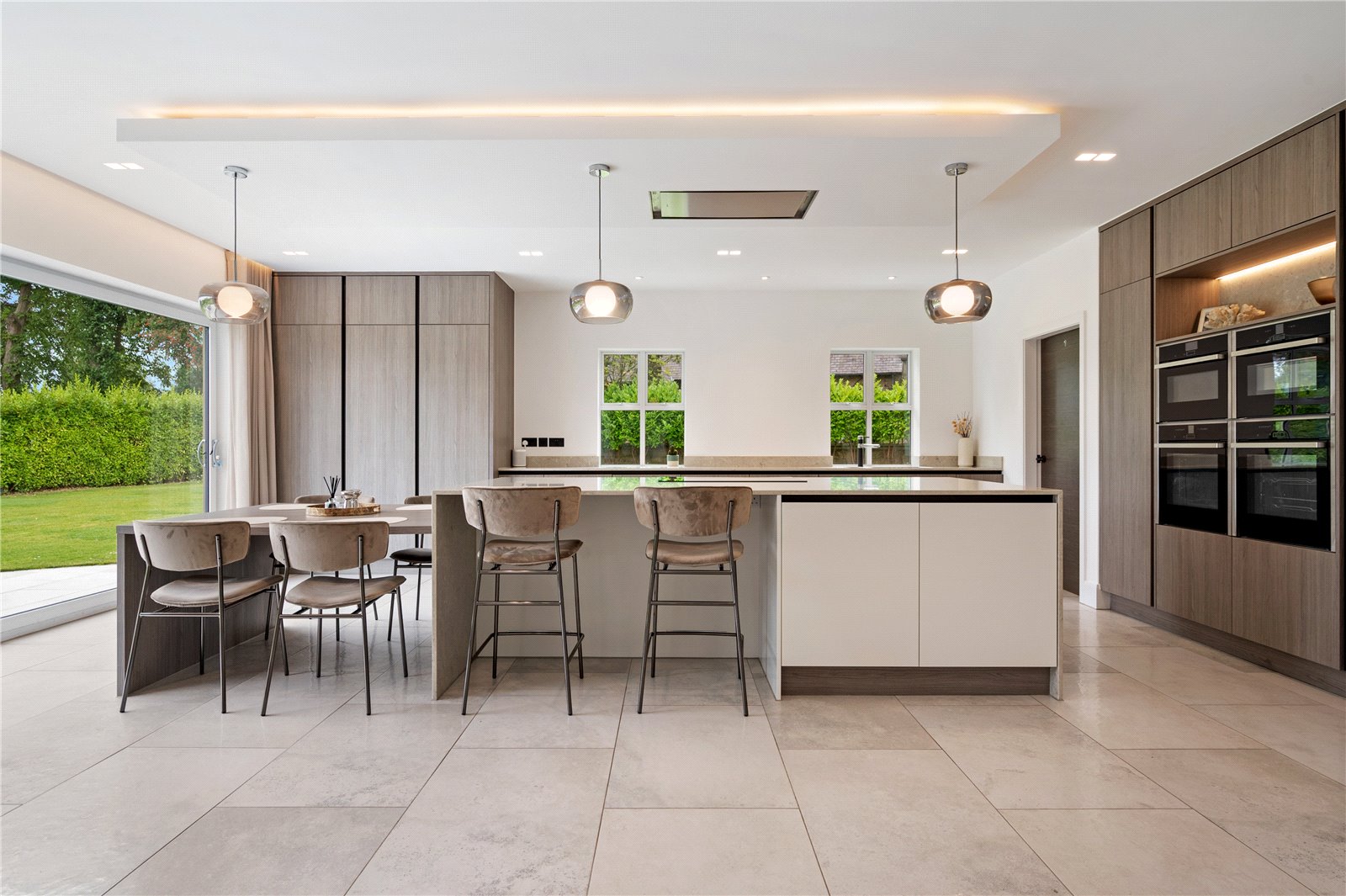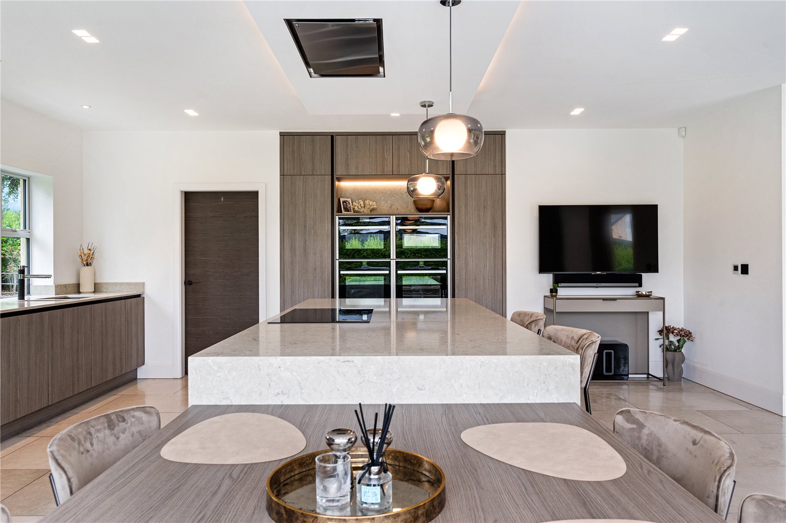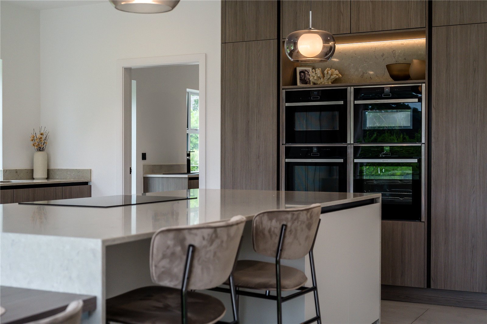 The tiled kitchen and dining area is open and light. The central bi-folding, and large sliding doors, both with concealed, backlit openings bring the outdoors in whilst the quartz kitchen island, hidden bar, and wine cooler is perfect for entertaining guests or cosy nights in. Integrated, full-size fridge, freezer and dishwasher are neatly hidden and accessible, whilst the range of four Neff ovens and hob provide a great platform for cooking enthusiasts to master their culinary delights. Attached to the island, the small dining area is perfect for casual dining, lunch or family meals.