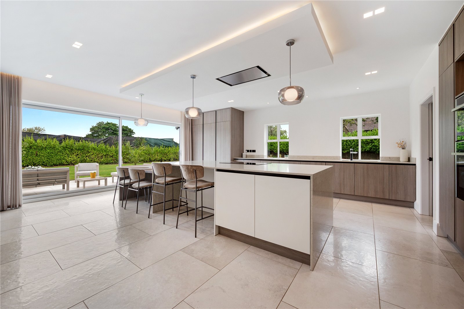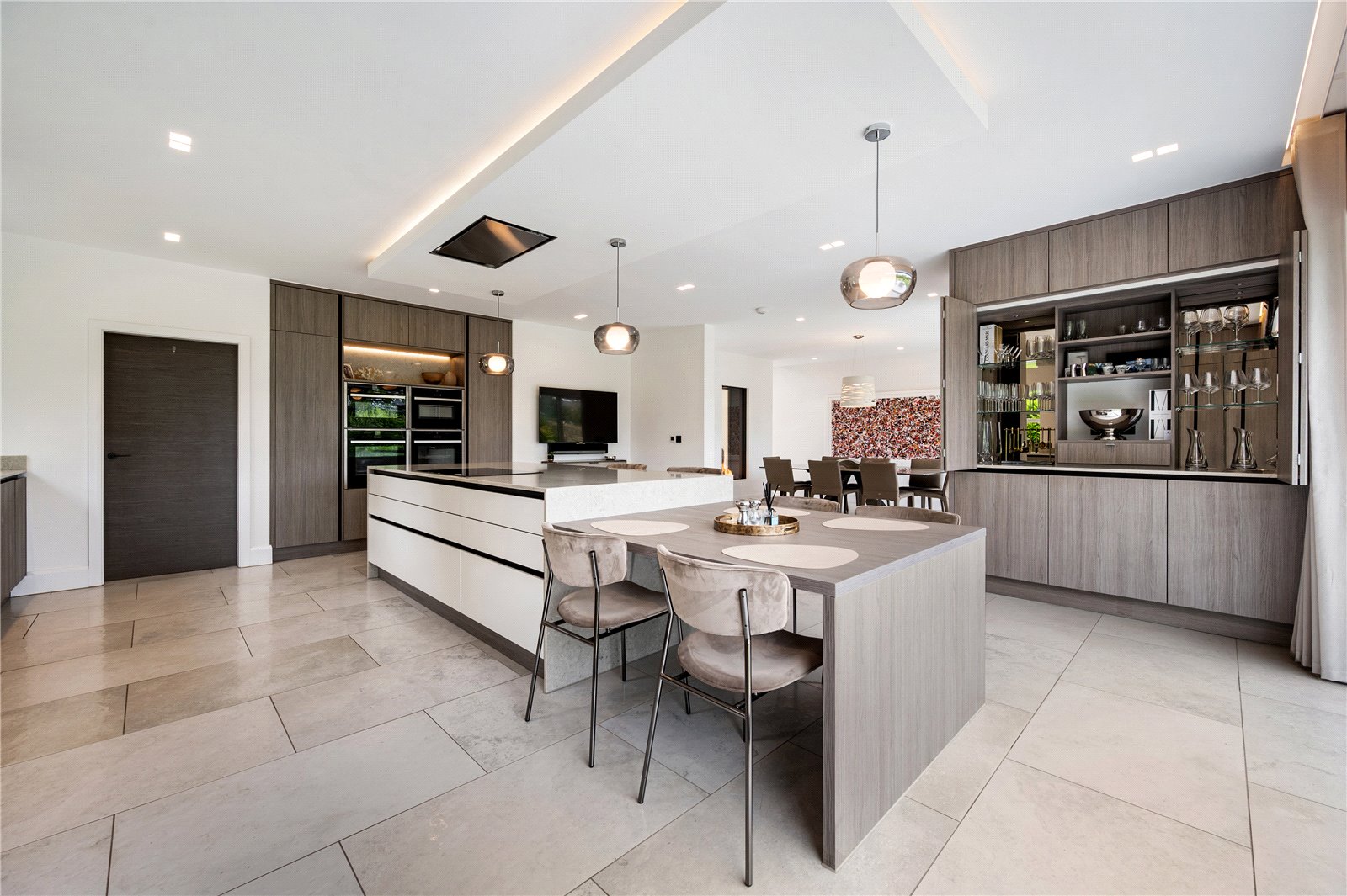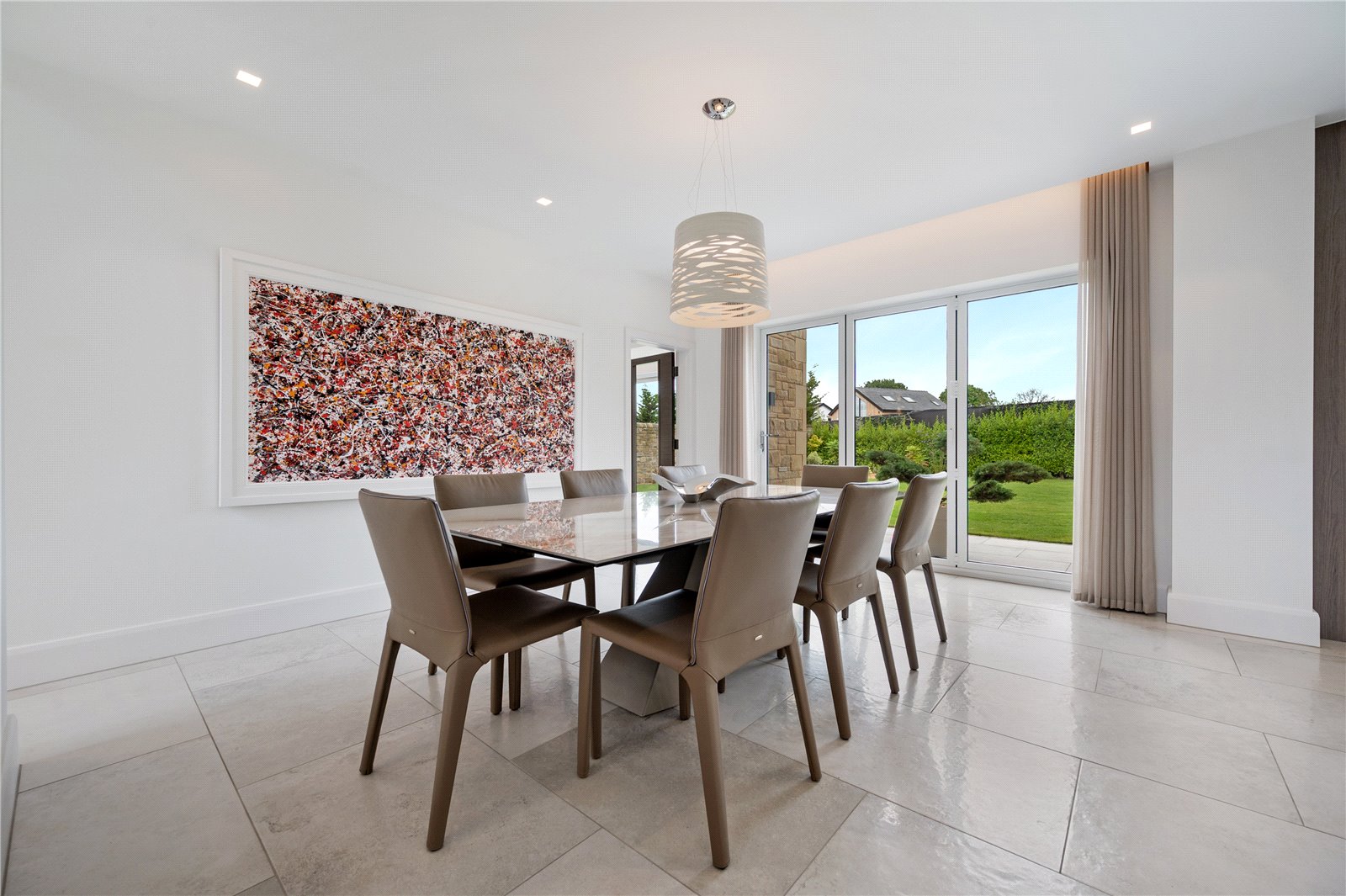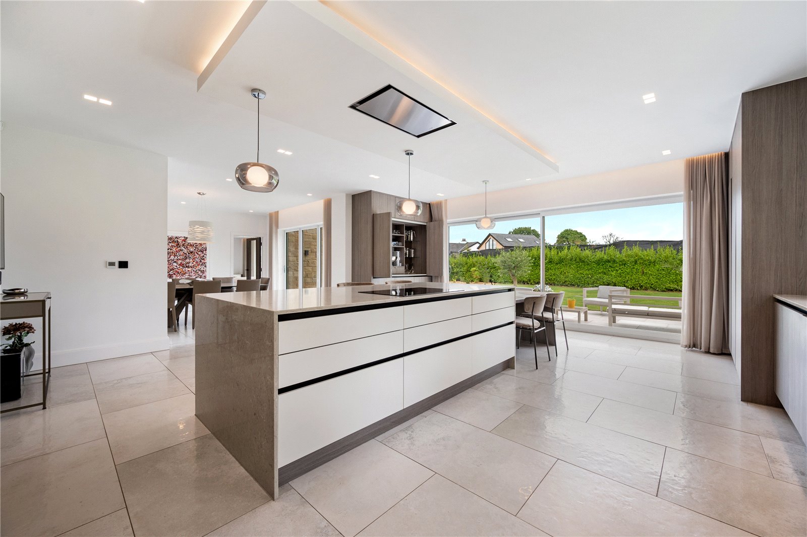 The tiled kitchen and dining area is open and light. The central bi-folding, and large sliding doors, both with concealed, backlit openings bring the outdoors in whilst the quartz kitchen island, hidden bar, and wine cooler is perfect for entertaining guests or cosy nights in. Integrated, full-size fridge, freezer and dishwasher are neatly hidden and accessible, whilst the range of four Neff ovens and hob provide a great platform for cooking enthusiasts to master their culinary delights. Attached to the island, the small dining area is perfect for casual dining, lunch or family meals.
