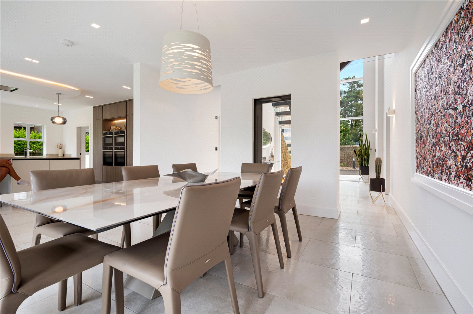 Located at the heart of the property, the dining area will wow your dinner party guests as they look through into the incredible, vaulted-ceiling hallway and tunnel fire on one side and extensive garden greenery opposite.