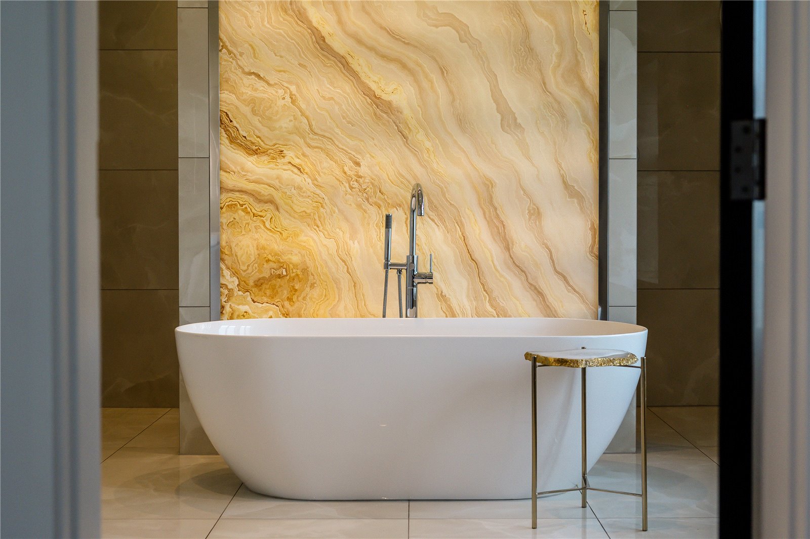 The Main Bedroom boasts French doors that open onto a stunning balcony, complete with a stylish tiled floor and an infinity glass screen, perfect for morning coffee, or evening relaxation. Back inside double doors lead into a lavish walk-in wardrobe, meticulously designed with ample hanging space, bespoke shelving, and custom drawers; the luxury en-suite bathroom is a masterpiece, offering a freestanding bath with a chic shower attachment. Neatly tucked away behind the feature wall, a walk-in shower features an overhead rainfall shower and an additional side attachment. The elegant his and her wash basins, a low suite WC, and beautifully tiled walls and floor, exude a spa-like ambiance.