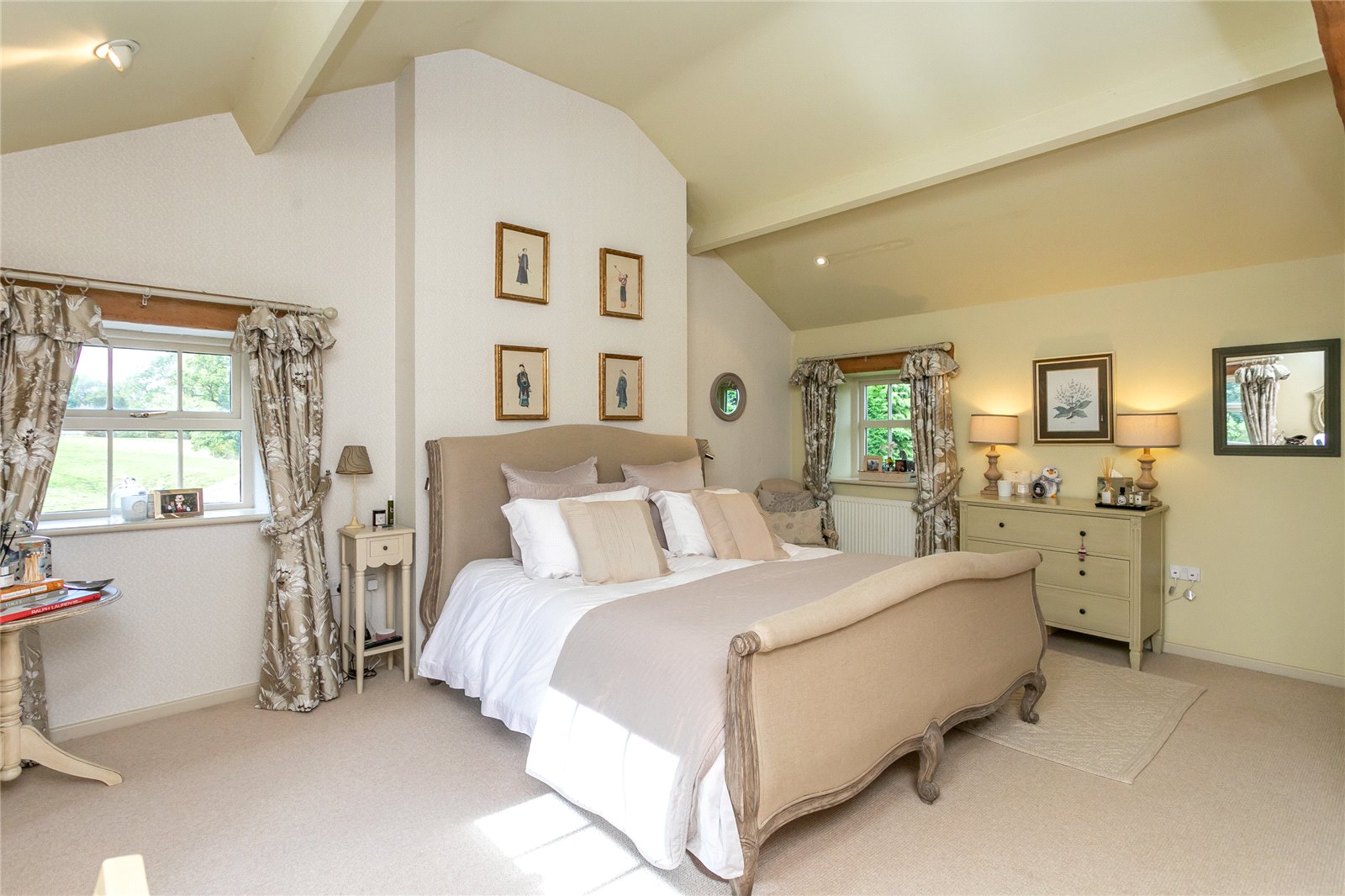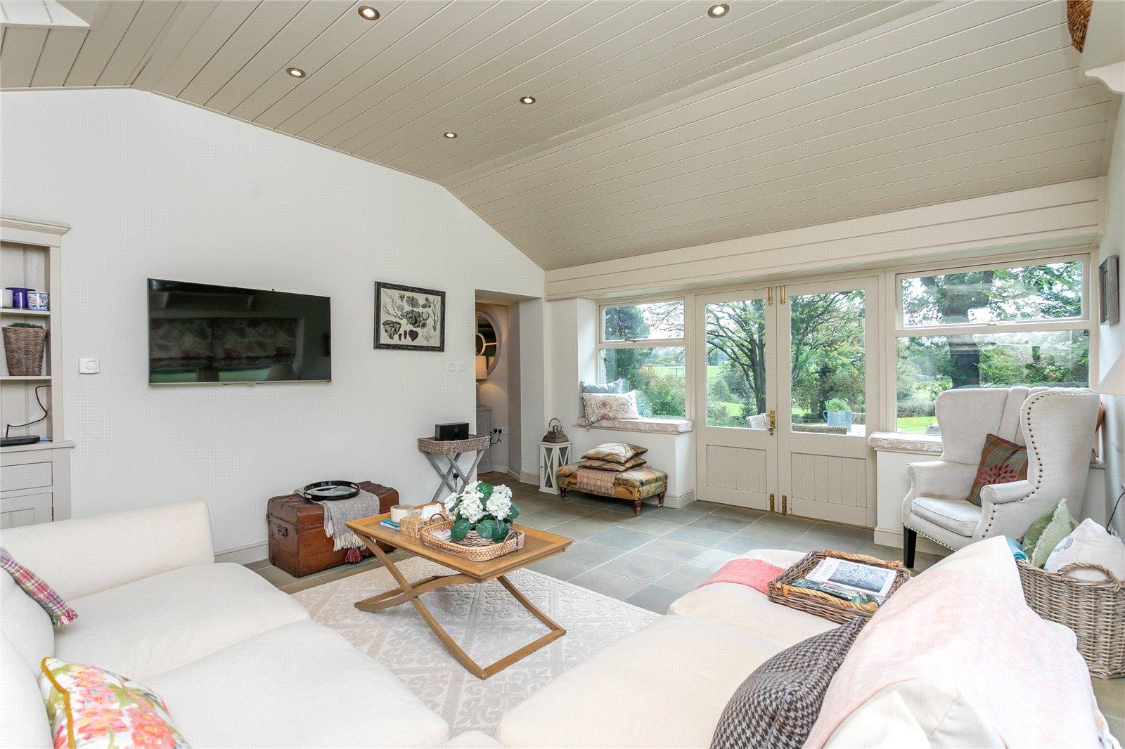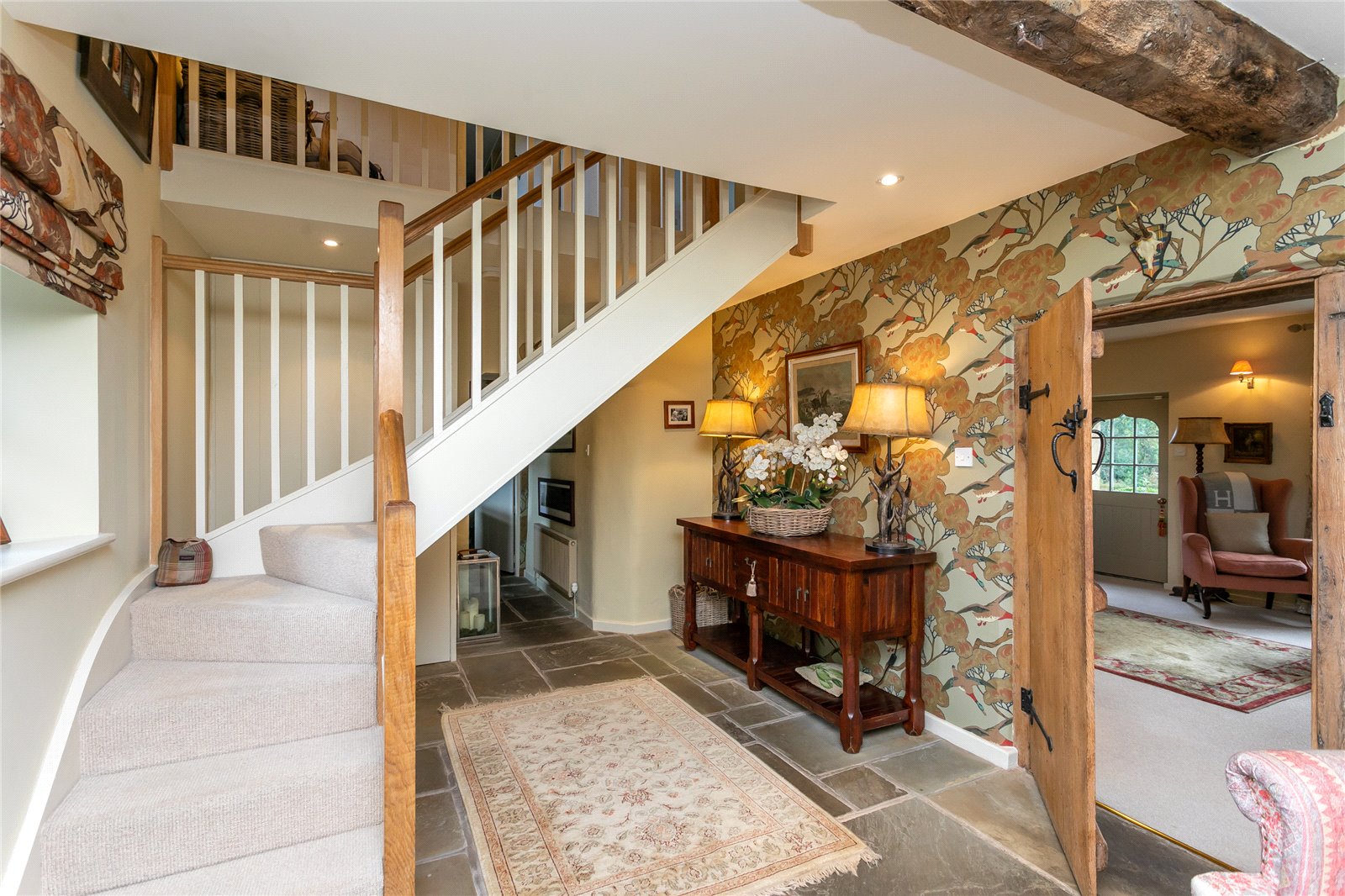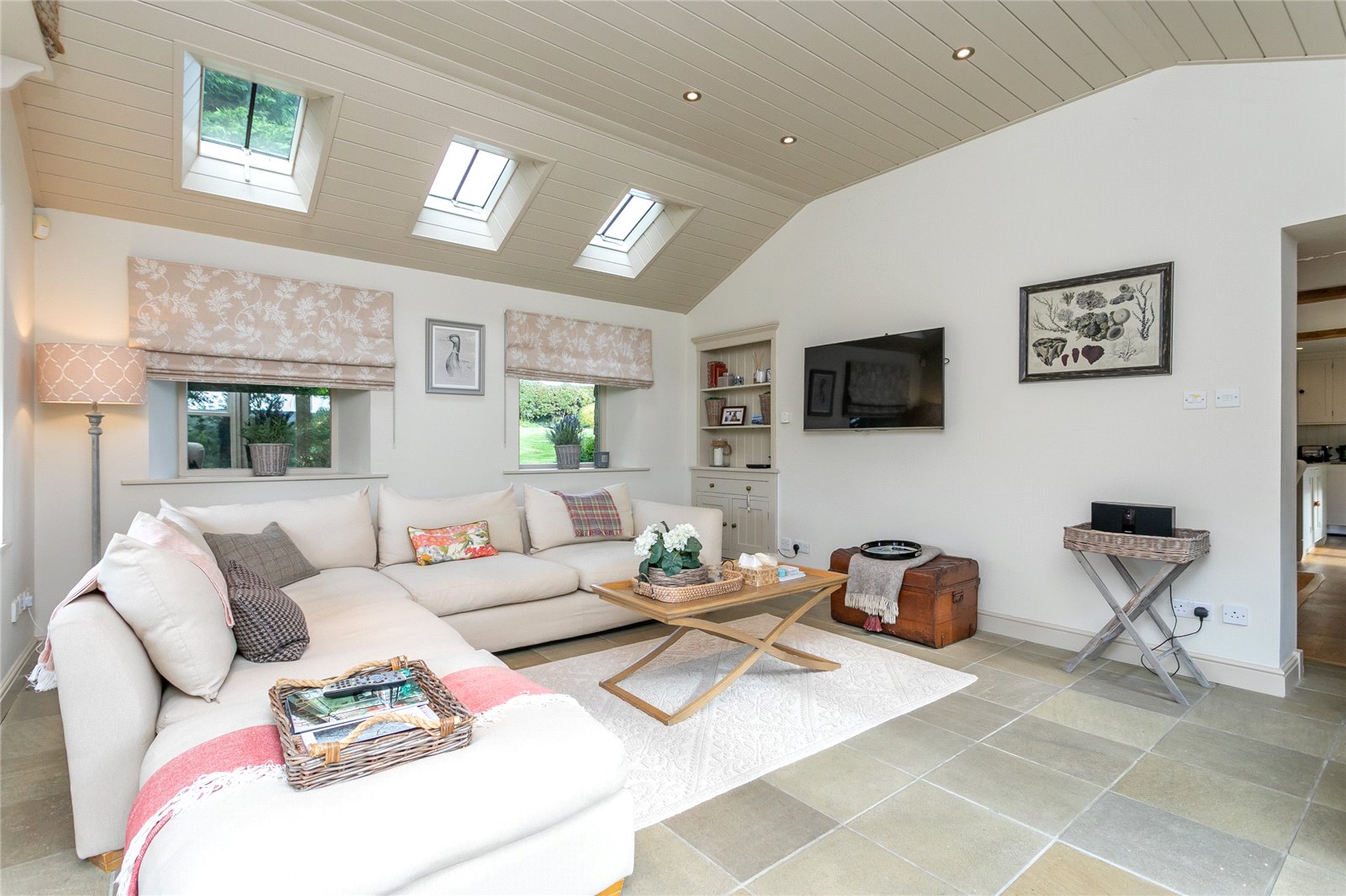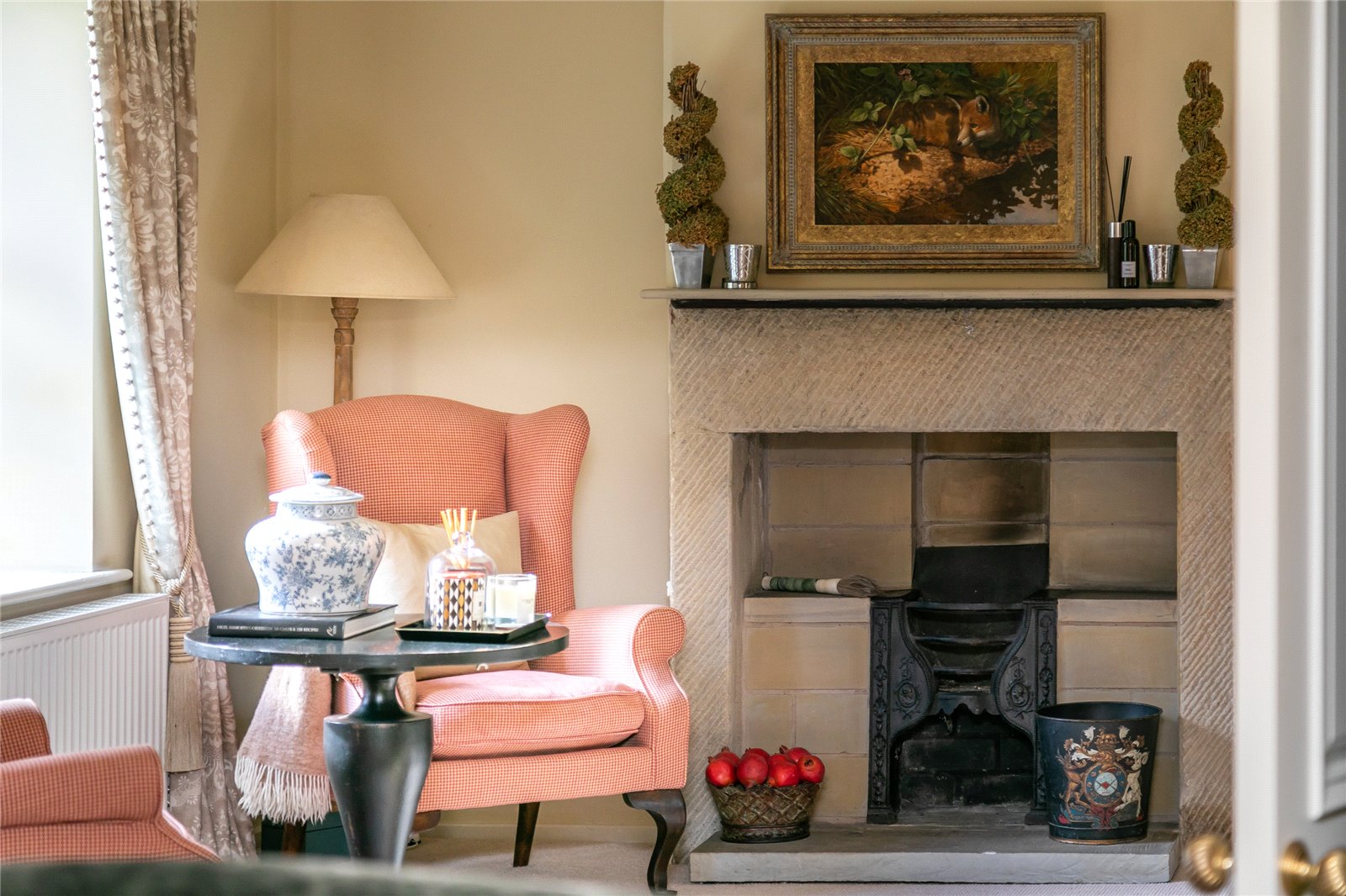 Stepping inside, a welcoming reception hallway sets the tone, with exposed timber panelling, striking trusses, and a stone-flagged floor leading into an exquisite sequence of inviting living spaces. The day room, with its beamed ceiling and dressed stone fireplace, flows effortlessly into a spacious sitting room, where a log-burning stove is nestled within a beautifully crafted brick hearth. The farmhouse kitchen is a showpiece of bespoke carpentry, featuring hand-painted cabinetry, solid marble work surfaces, and a central island, all complemented by a Falcon range oven and French doors that open onto the gardens. A stunning garden room, bathed in natural light, extends the living space, framed by stone mullioned windows and a vaulted ceiling, with direct access to a sun-drenched patio. Off the hallway, a stylish two-piece cloakroom and a highly practical utility room complete the ground floor accommodation.