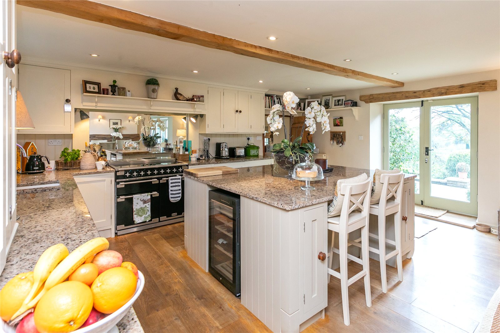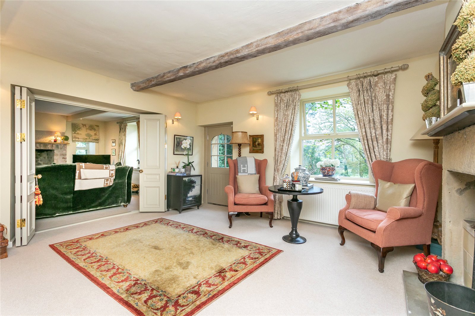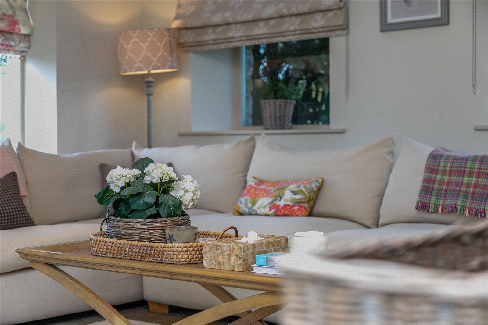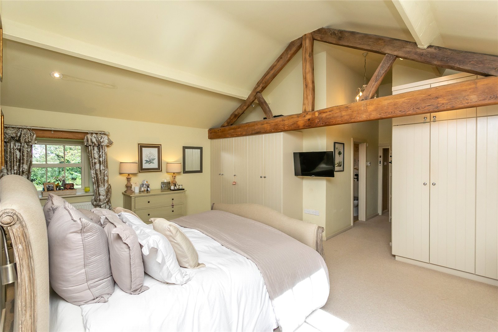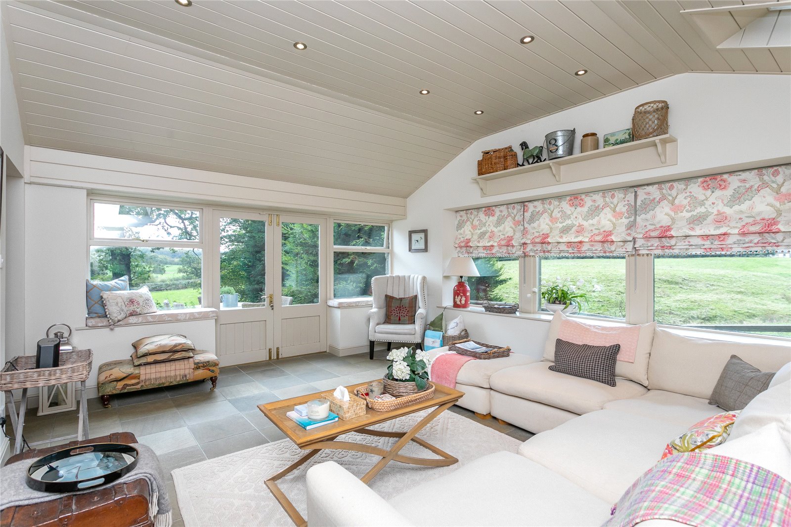 Stepping inside, a welcoming reception hallway sets the tone, with exposed timber panelling, striking trusses, and a stone-flagged floor leading into an exquisite sequence of inviting living spaces. The day room, with its beamed ceiling and dressed stone fireplace, flows effortlessly into a spacious sitting room, where a log-burning stove is nestled within a beautifully crafted brick hearth. The farmhouse kitchen is a showpiece of bespoke carpentry, featuring hand-painted cabinetry, solid marble work surfaces, and a central island, all complemented by a Falcon range oven and French doors that open onto the gardens. A stunning garden room, bathed in natural light, extends the living space, framed by stone mullioned windows and a vaulted ceiling, with direct access to a sun-drenched patio. Off the hallway, a stylish two-piece cloakroom and a highly practical utility room complete the ground floor accommodation.