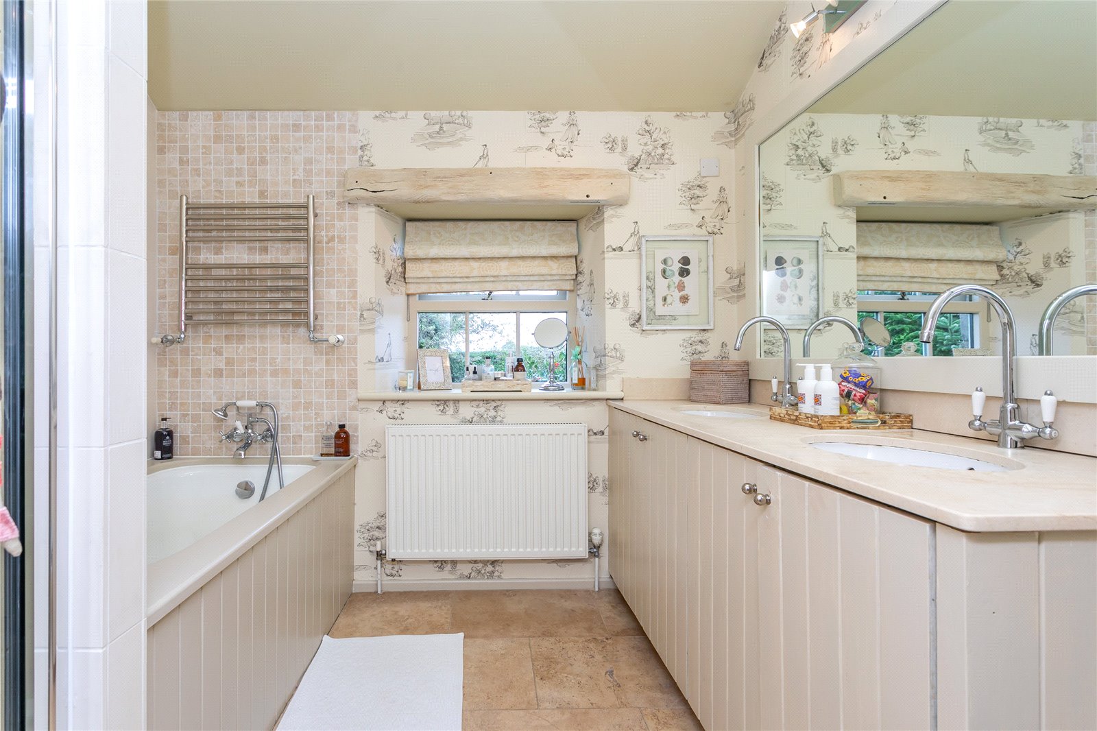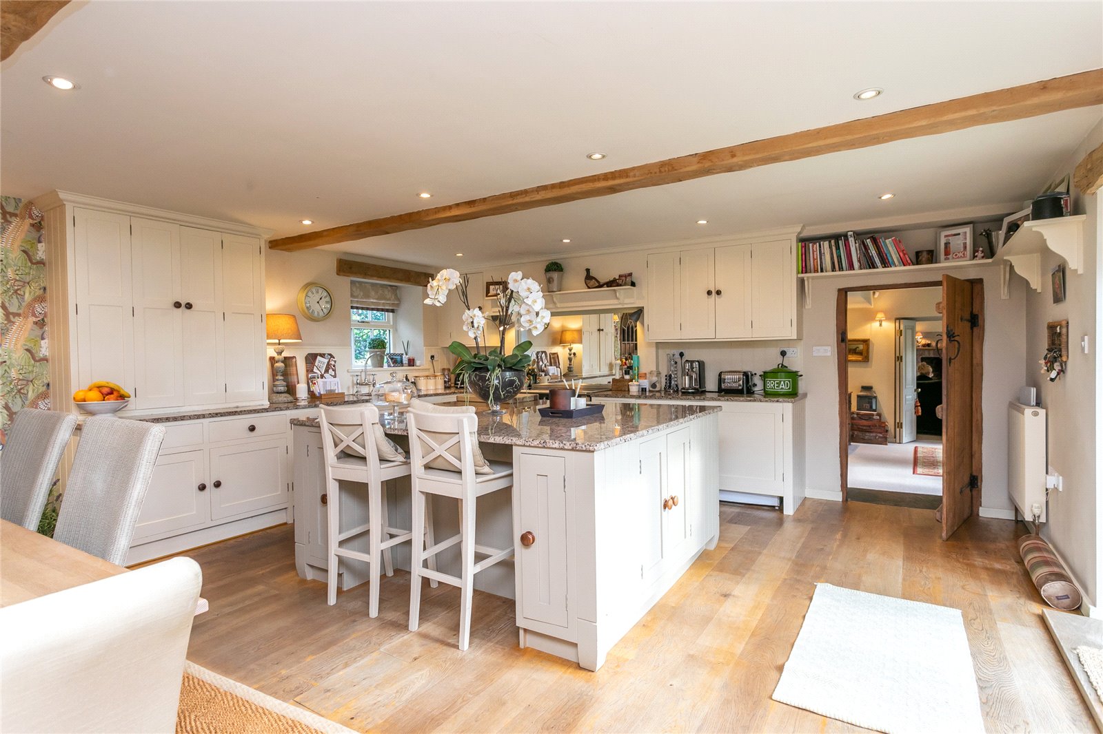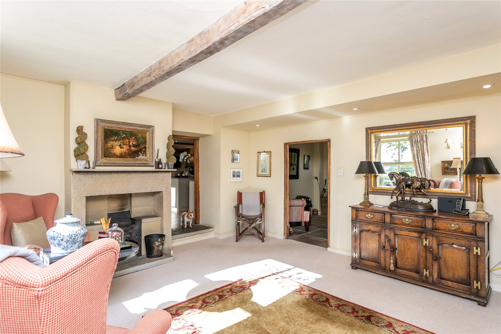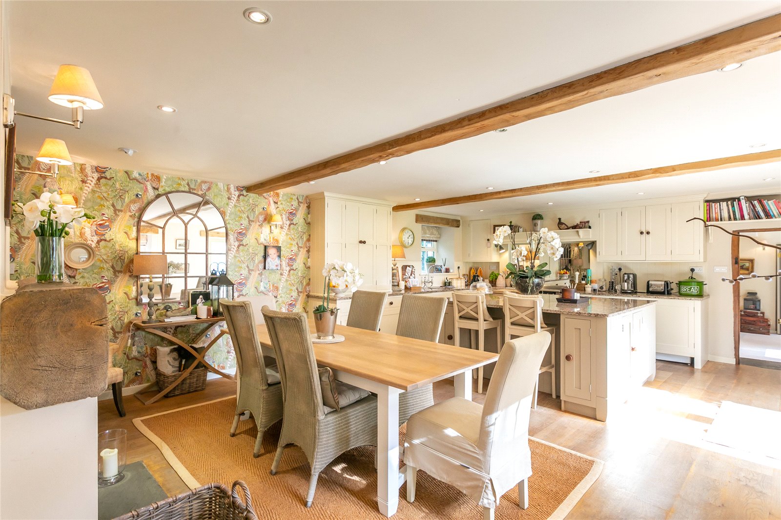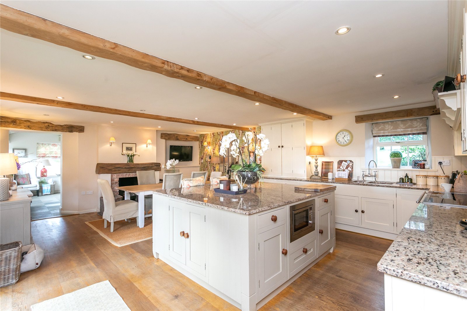 Stepping inside, a welcoming reception hallway sets the tone, with exposed timber panelling, striking trusses, and a stone-flagged floor leading into an exquisite sequence of inviting living spaces. The day room, with its beamed ceiling and dressed stone fireplace, flows effortlessly into a spacious sitting room, where a log-burning stove is nestled within a beautifully crafted brick hearth. The farmhouse kitchen is a showpiece of bespoke carpentry, featuring hand-painted cabinetry, solid marble work surfaces, and a central island, all complemented by a Falcon range oven and French doors that open onto the gardens. A stunning garden room, bathed in natural light, extends the living space, framed by stone mullioned windows and a vaulted ceiling, with direct access to a sun-drenched patio. Off the hallway, a stylish two-piece cloakroom and a highly practical utility room complete the ground floor accommodation.