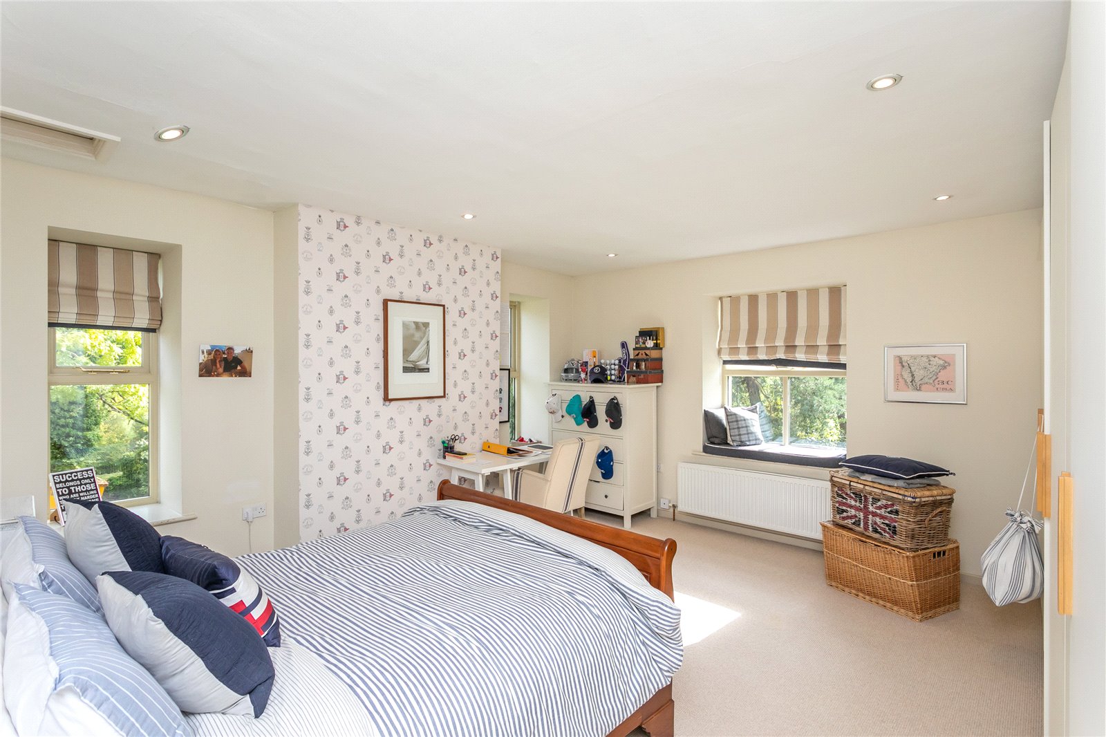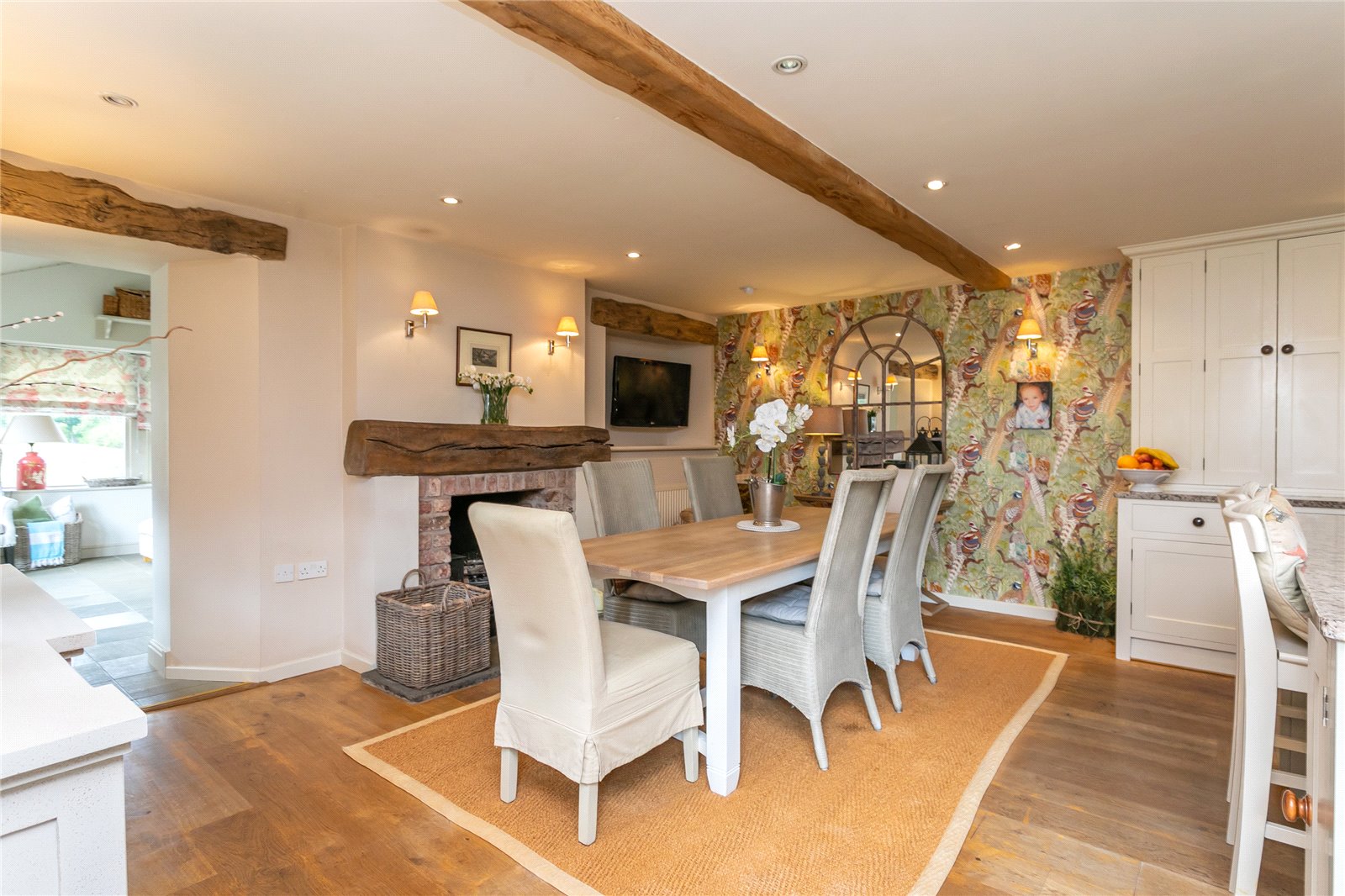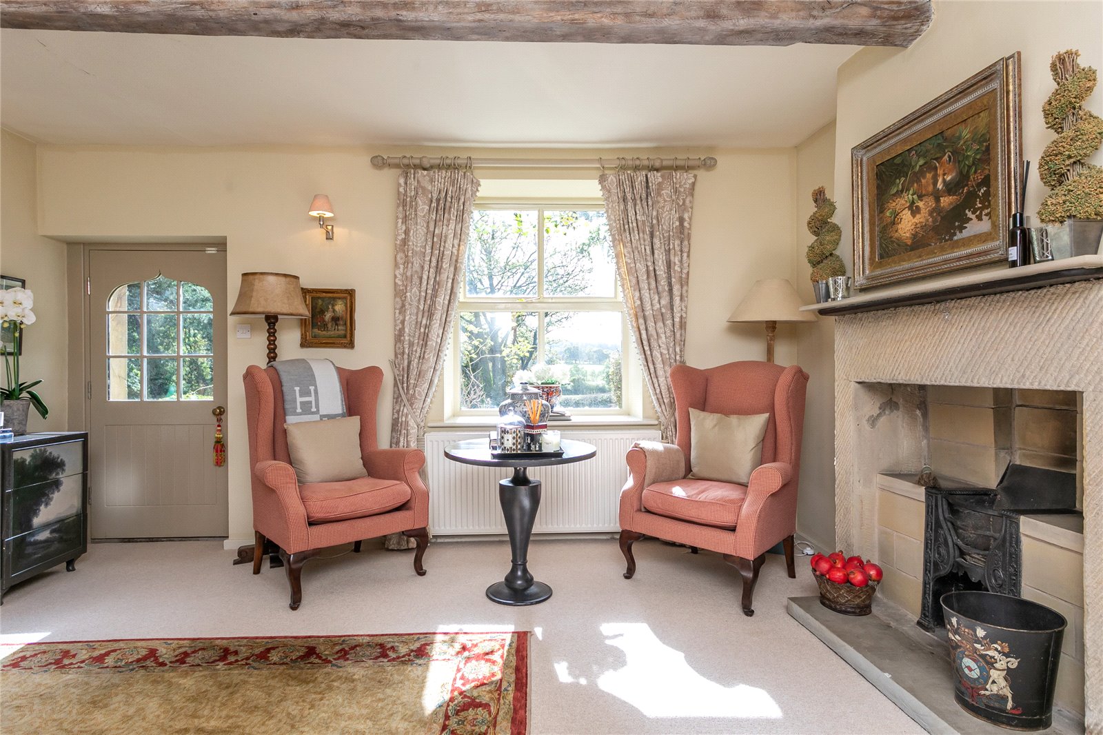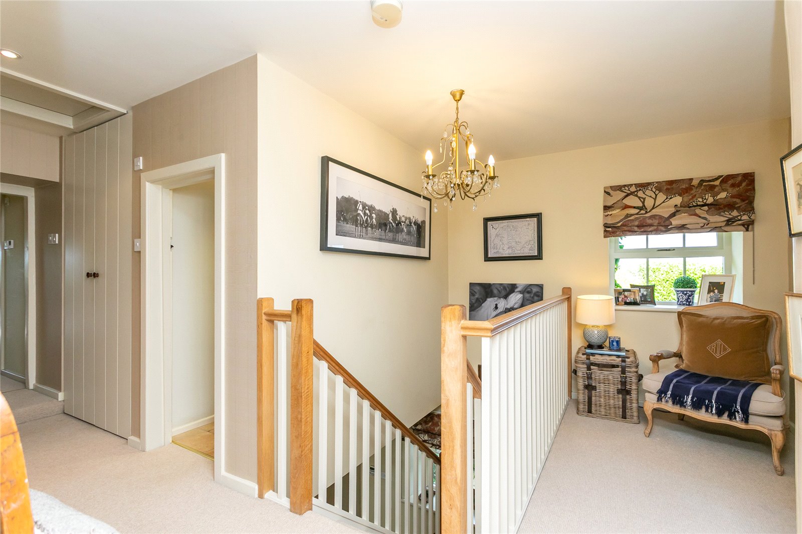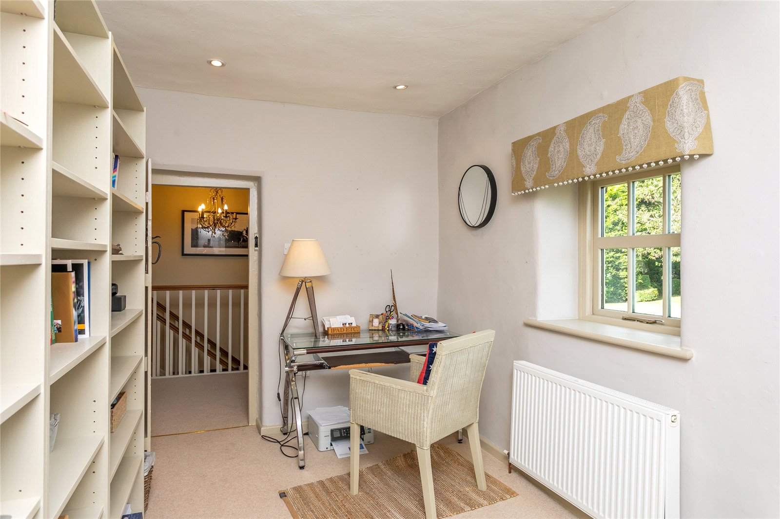 Stepping inside, a welcoming reception hallway sets the tone, with exposed timber panelling, striking trusses, and a stone-flagged floor leading into an exquisite sequence of inviting living spaces. The day room, with its beamed ceiling and dressed stone fireplace, flows effortlessly into a spacious sitting room, where a log-burning stove is nestled within a beautifully crafted brick hearth. The farmhouse kitchen is a showpiece of bespoke carpentry, featuring hand-painted cabinetry, solid marble work surfaces, and a central island, all complemented by a Falcon range oven and French doors that open onto the gardens. A stunning garden room, bathed in natural light, extends the living space, framed by stone mullioned windows and a vaulted ceiling, with direct access to a sun-drenched patio. Off the hallway, a stylish two-piece cloakroom and a highly practical utility room complete the ground floor accommodation.