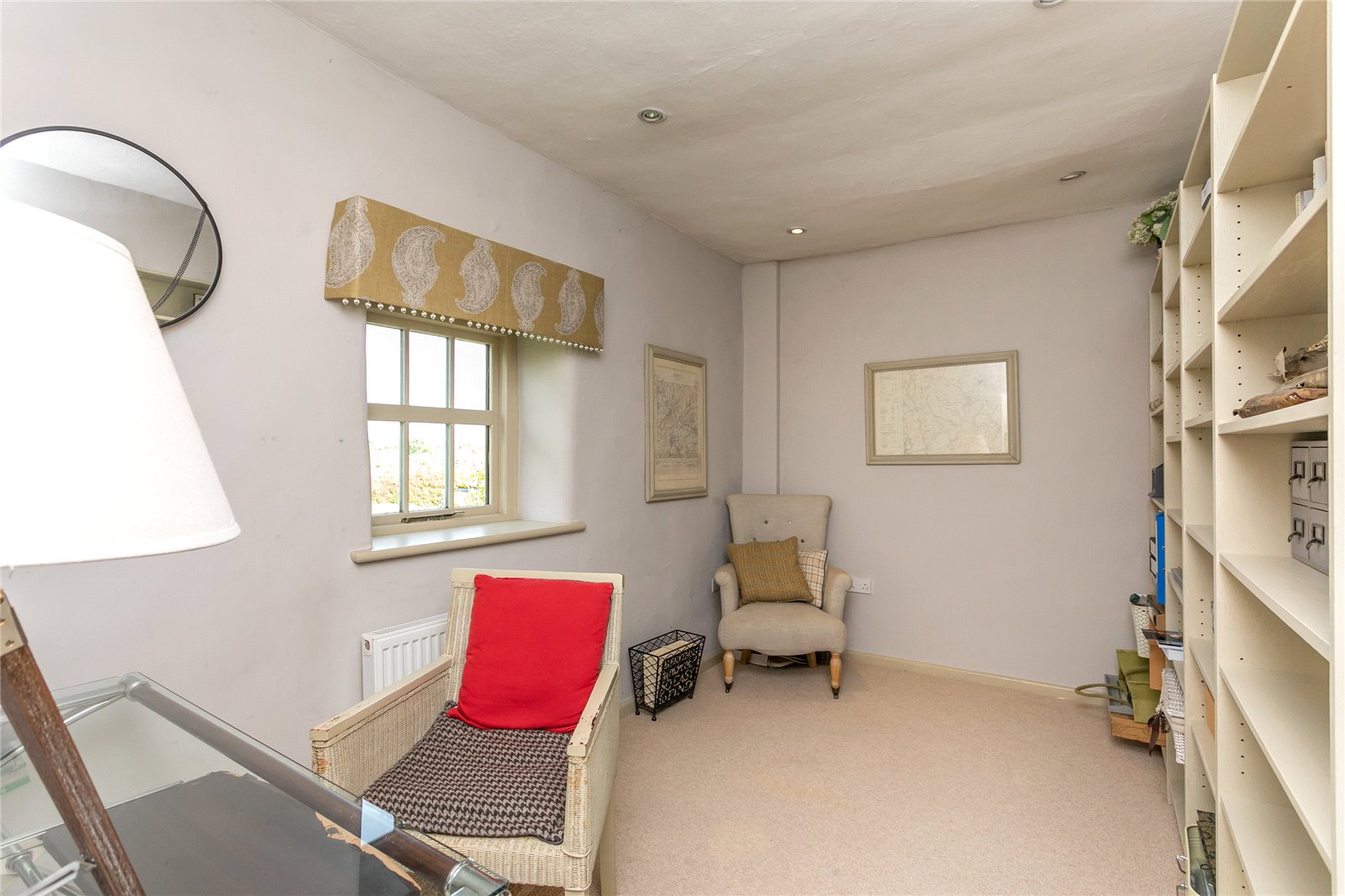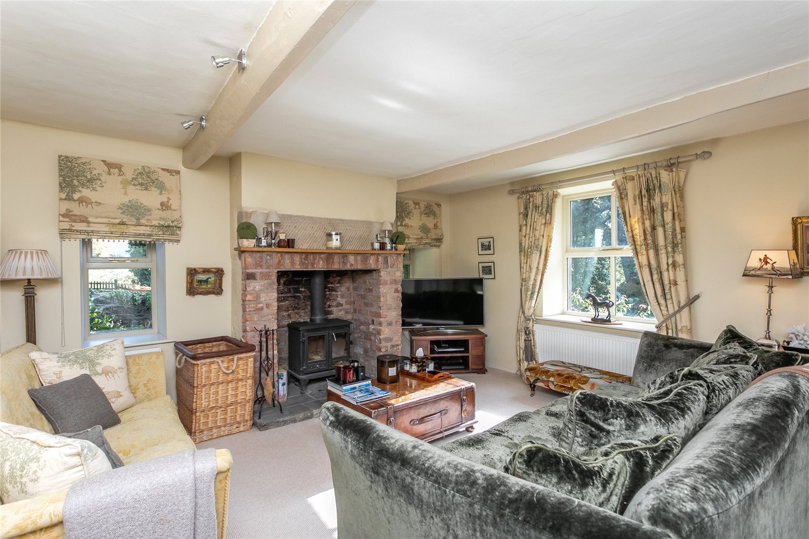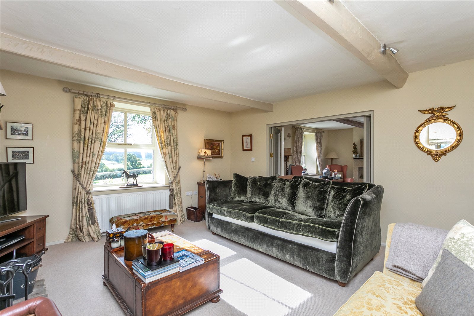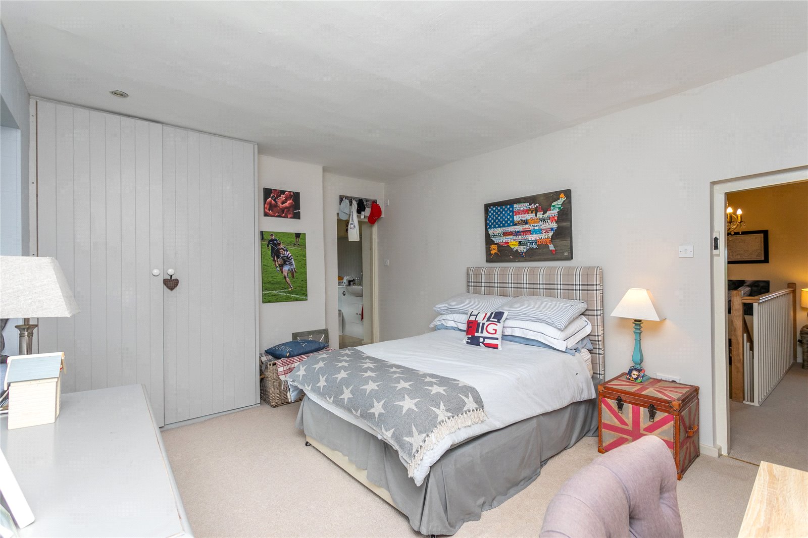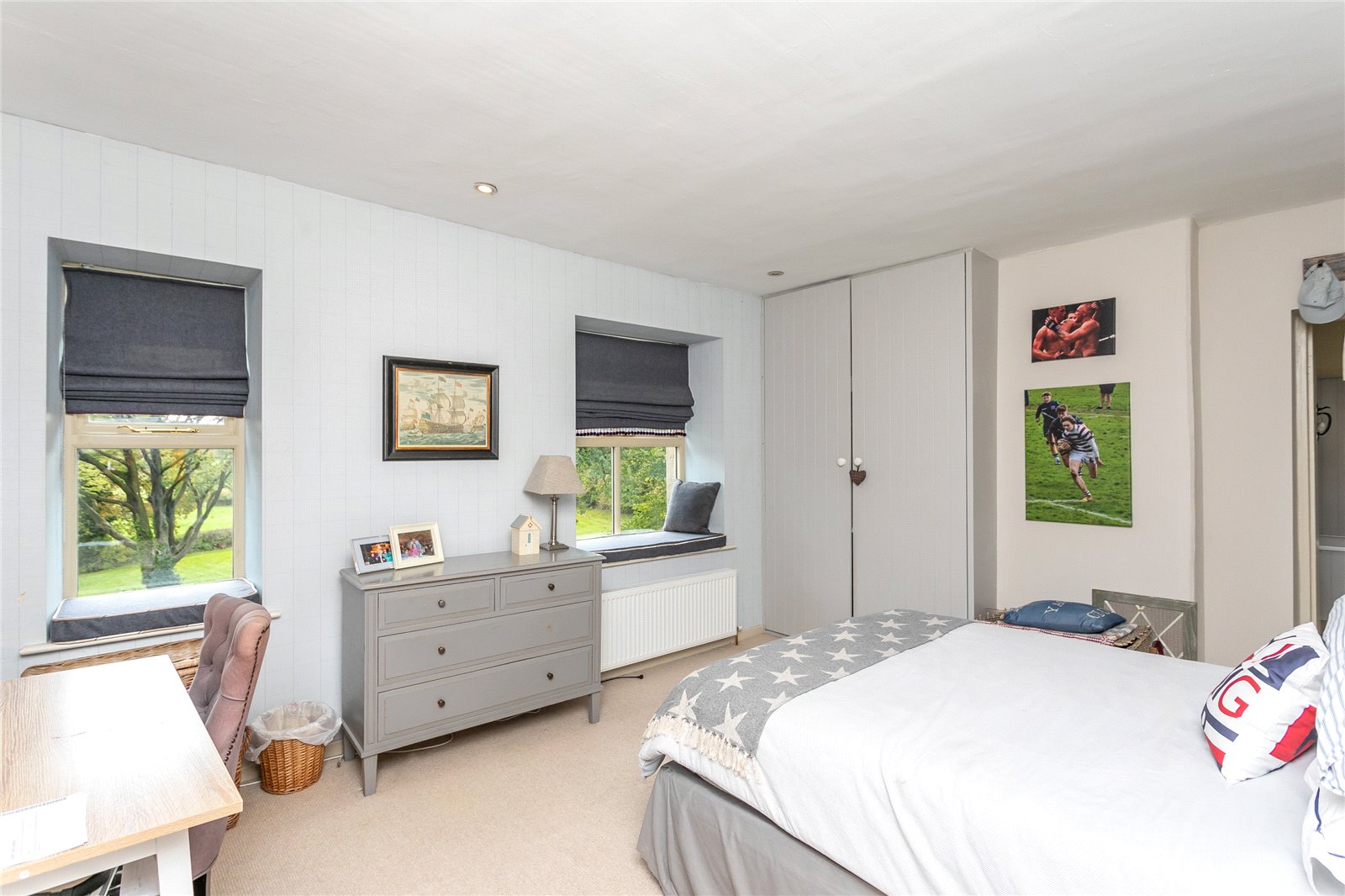 Stepping inside, a welcoming reception hallway sets the tone, with exposed timber panelling, striking trusses, and a stone-flagged floor leading into an exquisite sequence of inviting living spaces. The day room, with its beamed ceiling and dressed stone fireplace, flows effortlessly into a spacious sitting room, where a log-burning stove is nestled within a beautifully crafted brick hearth. The farmhouse kitchen is a showpiece of bespoke carpentry, featuring hand-painted cabinetry, solid marble work surfaces, and a central island, all complemented by a Falcon range oven and French doors that open onto the gardens. A stunning garden room, bathed in natural light, extends the living space, framed by stone mullioned windows and a vaulted ceiling, with direct access to a sun-drenched patio. Off the hallway, a stylish two-piece cloakroom and a highly practical utility room complete the ground floor accommodation.