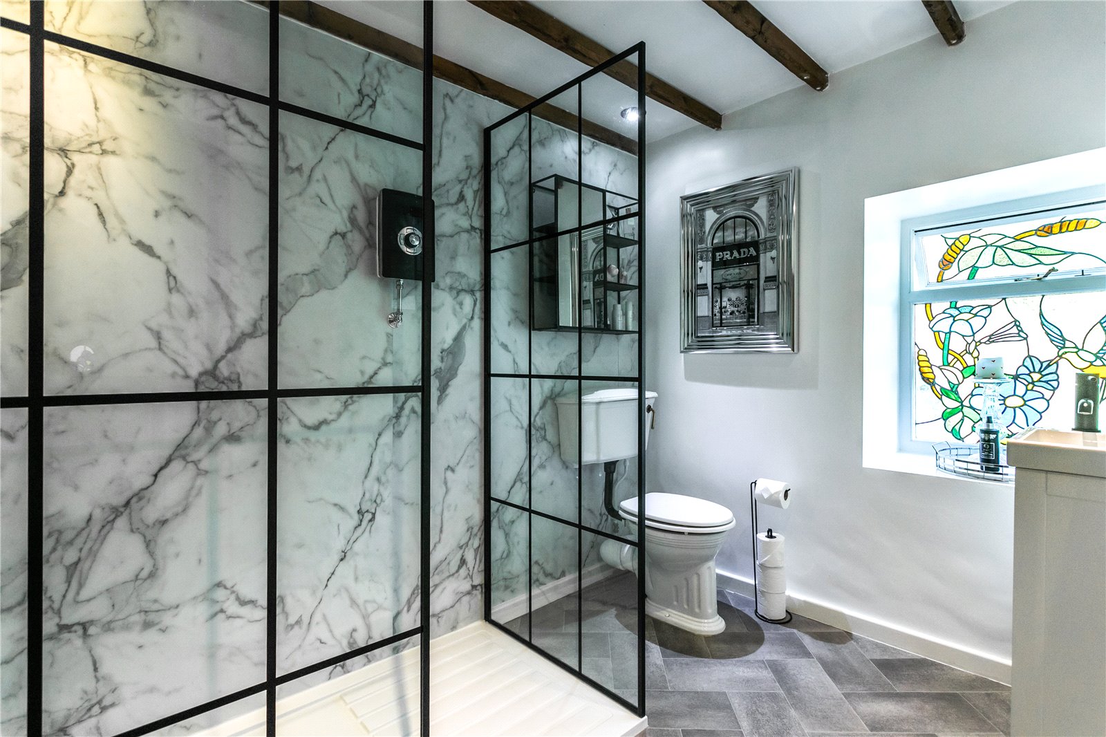 To the first floor is a fantastic and spacious Master bedroom with vaulted ceiling, exposed beams and Velux windows. French door to Juliet balcony. Ample space for large furniture, galleried area overlooking lounge, En suite comprising W.C.. with concealed cistern, vanity washbasin and shower enclosure with exposed beams.