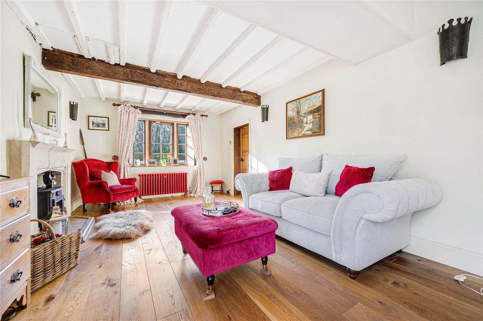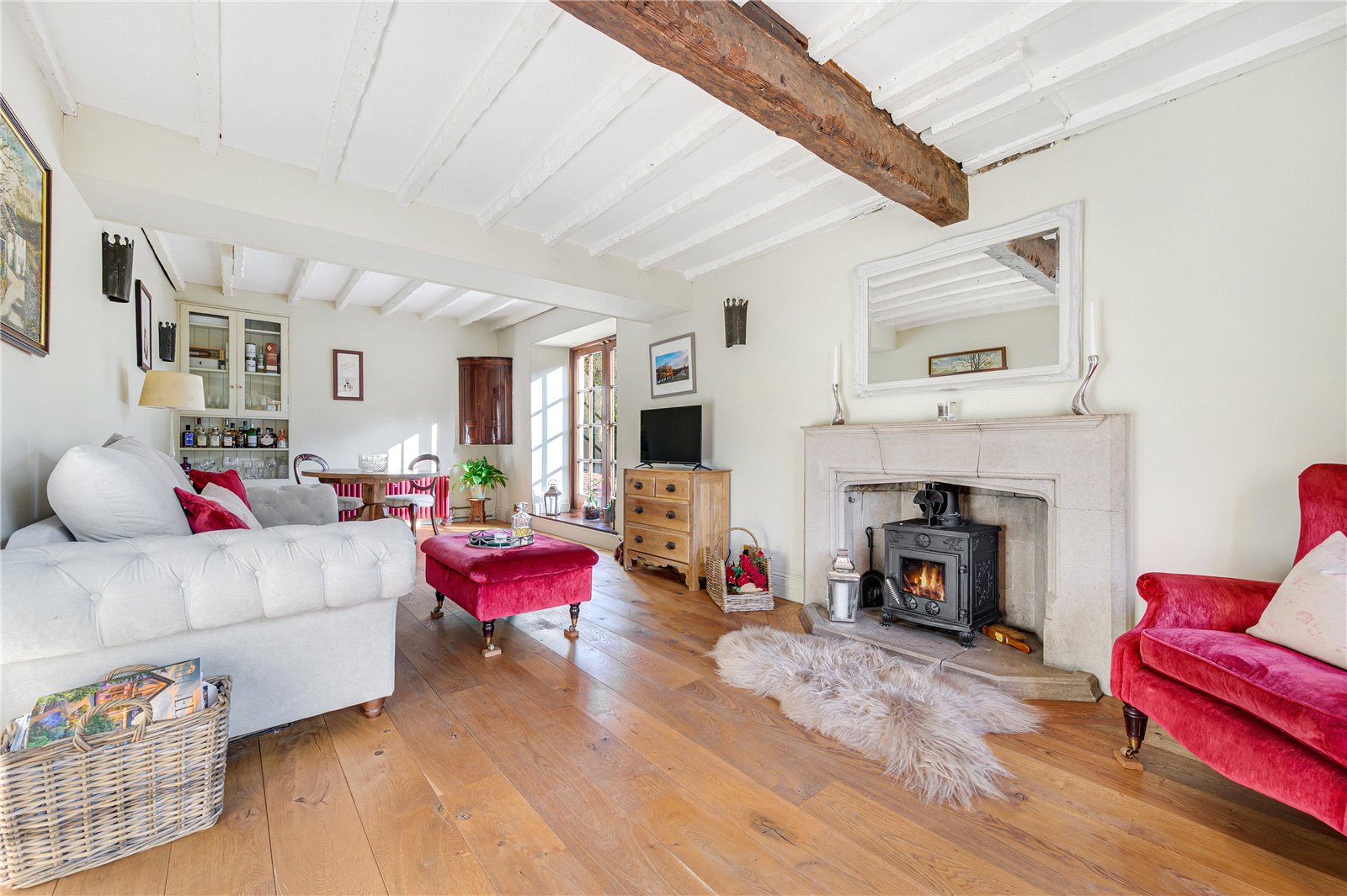 Snug with wood burning stove set into carved stone fireplace with matching hearth, exposed beamed ceiling, glazed French doors opening to side patio, stone mullion windows to front elevation solid Oak flooring.