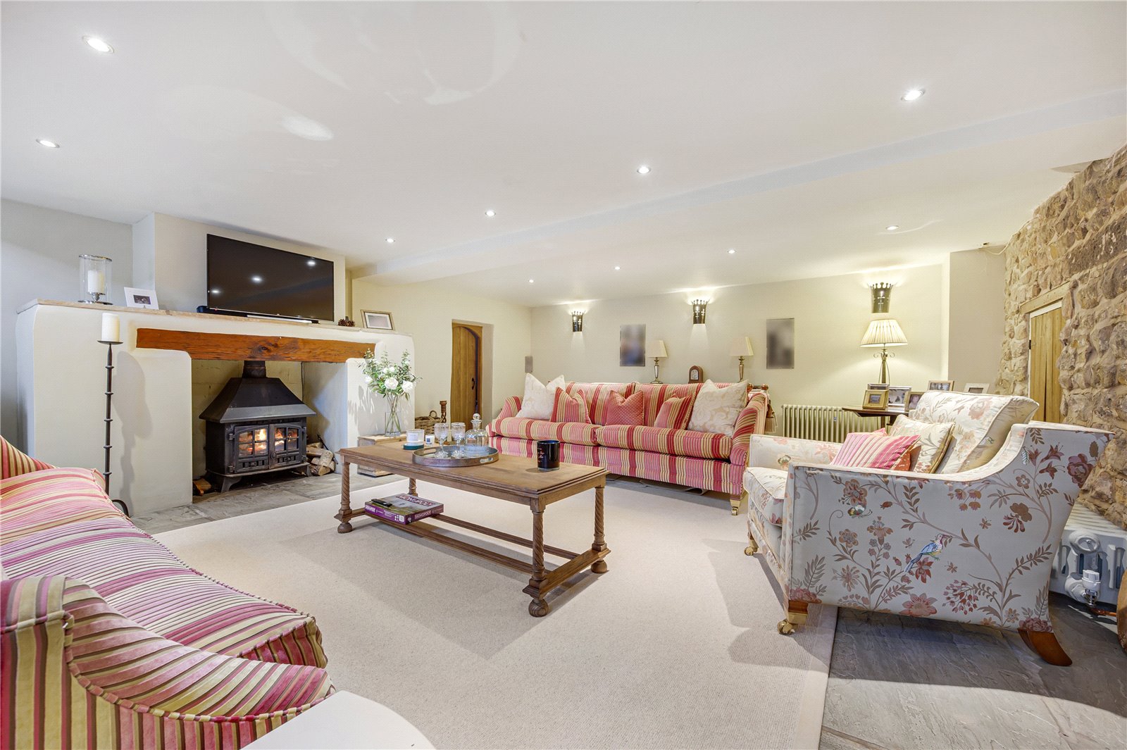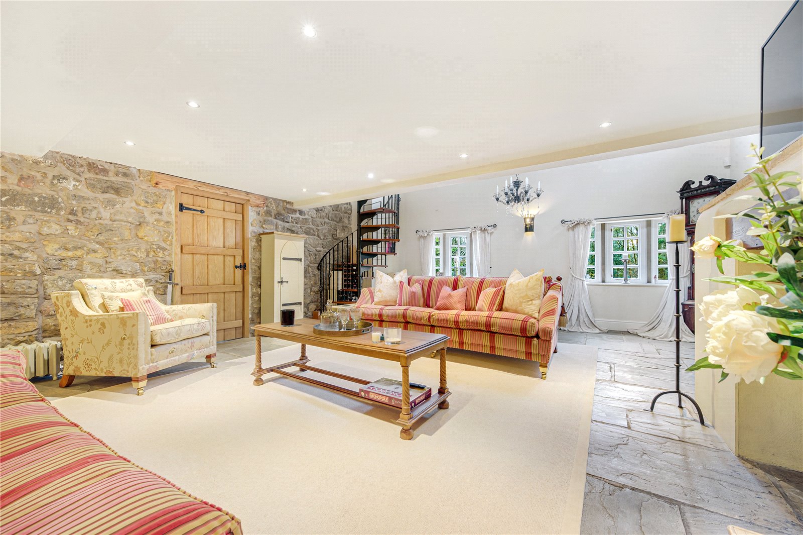 Lounge with a superb fireplace, wood burning stove, stone flagged floor, feature exposed wall, mullion windows, cast iron spiral staircase leading to master bedroom with galleried landing area.