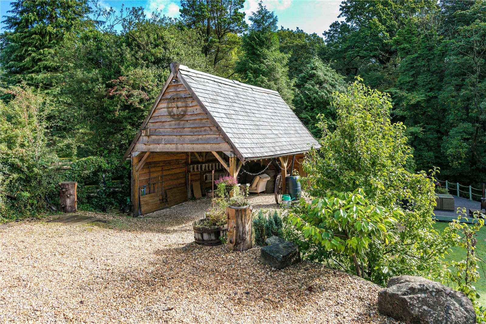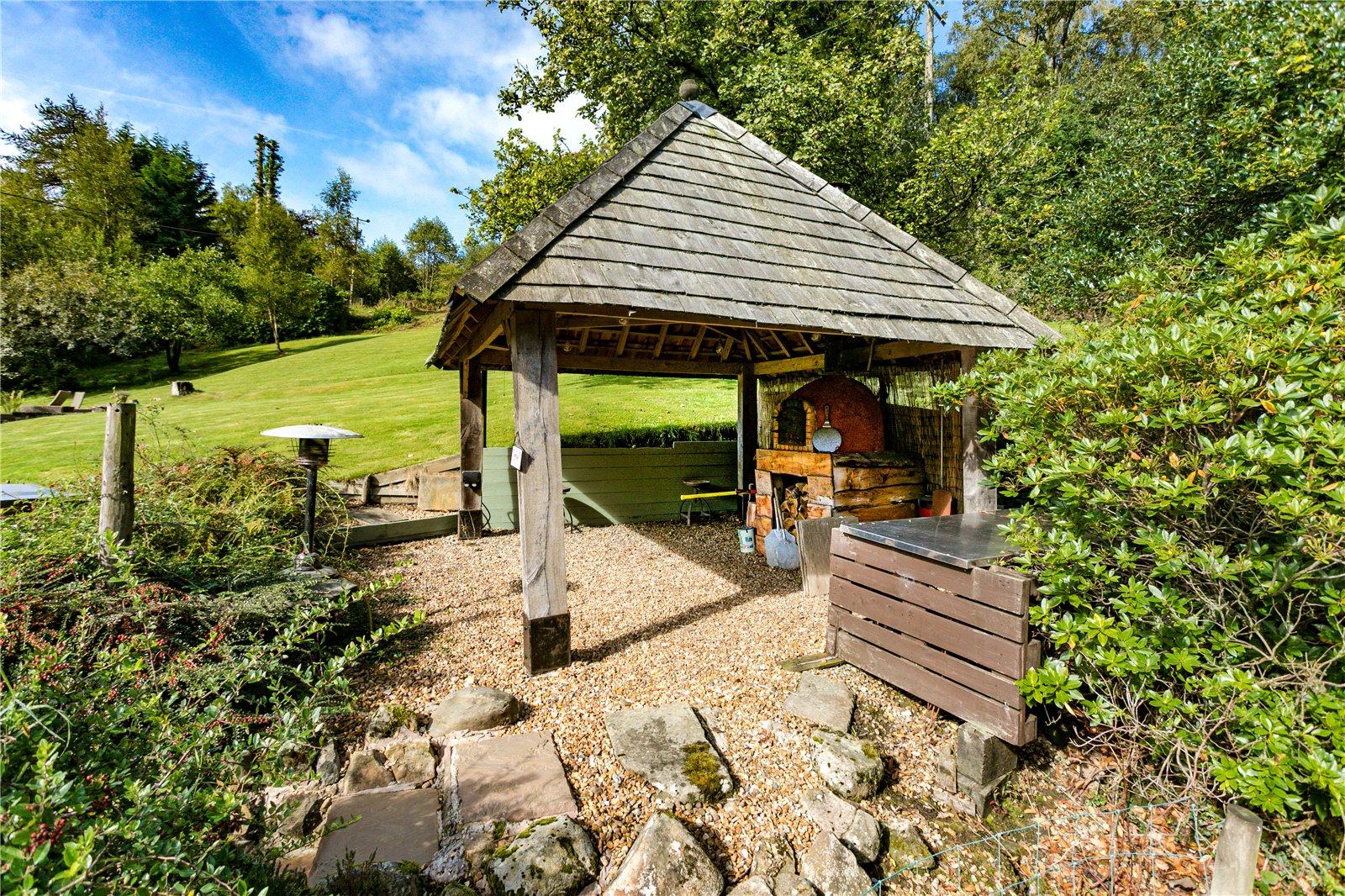 Outside is a substantial gravelled parking area providing ample parking for 8-10 cars. An Oak Framed carport provides additional covered parking and provides flexible outside entertaining space as this is adjacent to the decked area overlooking Bashall Brook. Throughout the gardens there are further patios and garden areas and timber storage shed. To the side of the house an Indian stone paved patio area connects with a mature lawned garden to the rear leading to a raised decked area with summer-house. with power and light.