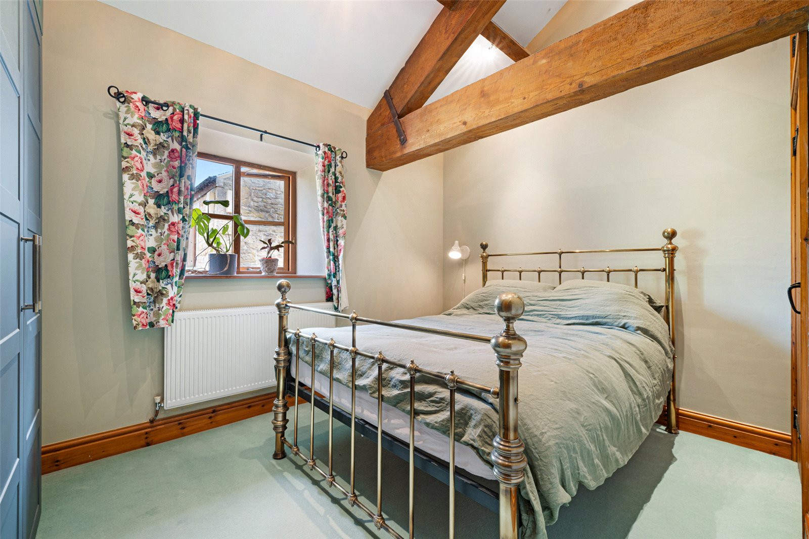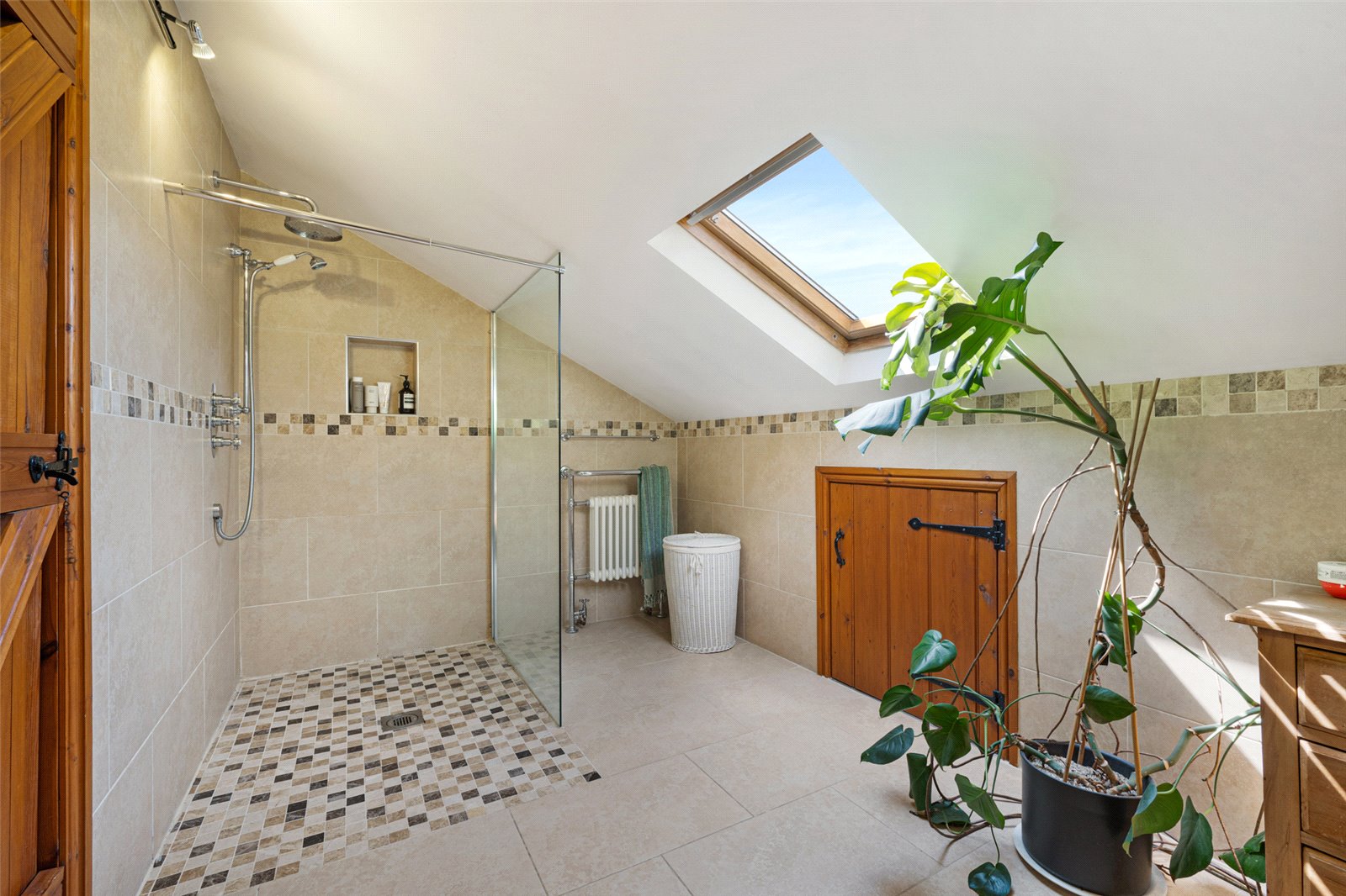 A staircase rises from the hallway to the first floor, where many rooms enjoy lofty semi-vaulted ceilings with exposed beams and roof timbers, enhancing the sense of charm and space. The landing houses an airing cupboard, and there are four well-proportioned bedrooms, three of which – including the principal suite – feature fitted wardrobes. The principal bedroom also benefits from a stylish 3pc en-suite shower room. The luxurious 4pc family bathroom is finished to an exceptional standard, comprising a freestanding bath with shower attachment, a walk-in shower with overhead rainfall fitting and side spray, a vanity wash basin, low-suite WC, heated towel rail, and feature radiator.