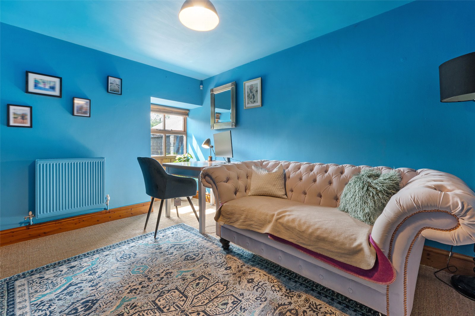 An L-shaped hallway, laid with handsome stone-flagged flooring, sets the tone for the property’s refined interior. From here, there is a 2pc cloakroom, a well-appointed office with bespoke fitted shelving, and a graceful flow into the main reception rooms. The elegant living room, centred around a wood-burning stove, opens into a dining area with bi-fold doors leading onto the rear terrace. Beyond lies the sitting room, complete with an ornate stone fireplace, which in turn connects to the breakfast kitchen. This superbly appointed kitchen features a generous array of oak-fronted units, an AGA with two hot plates and two ovens, a 1.5-bowl ceramic sink, integrated fridge, and an island unit with granite breakfast bar and storage beneath. Additional features include oak work surfaces, a stone-flagged floor, and open-plan access from the sitting room. The adjoining utility room offers further storage, a ceramic sink, plumbing for laundry appliances, an integrated freezer, a concealed wall-mounted boiler, a pantry, and a stable door to the front.