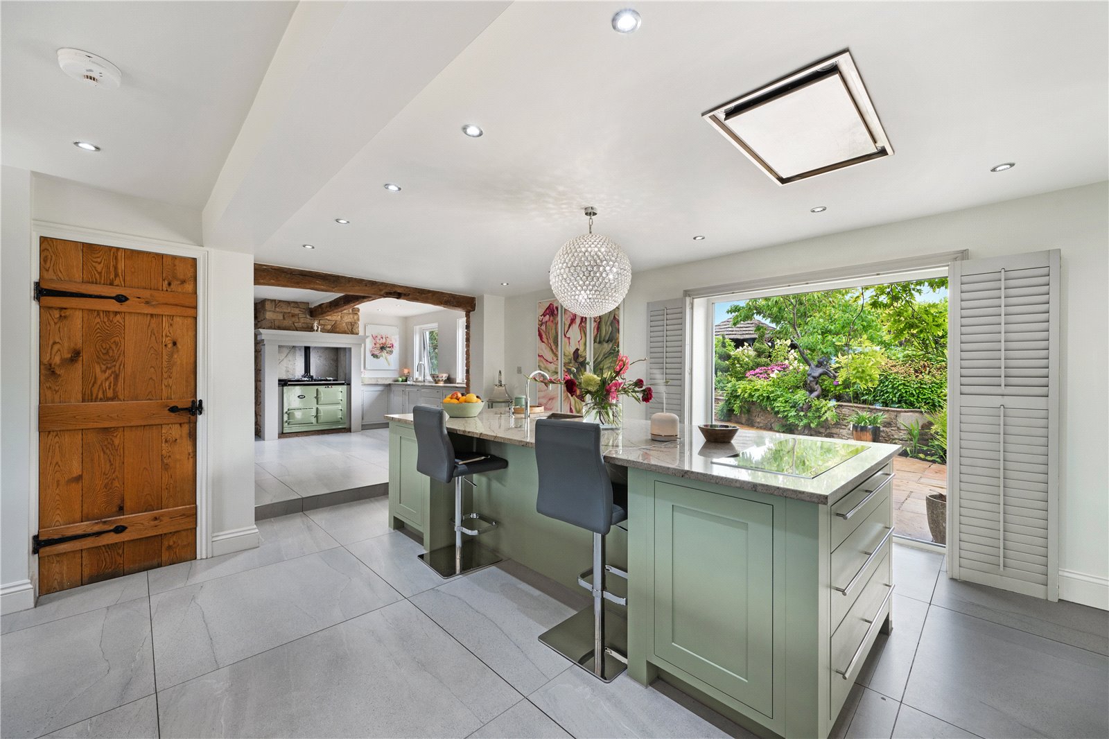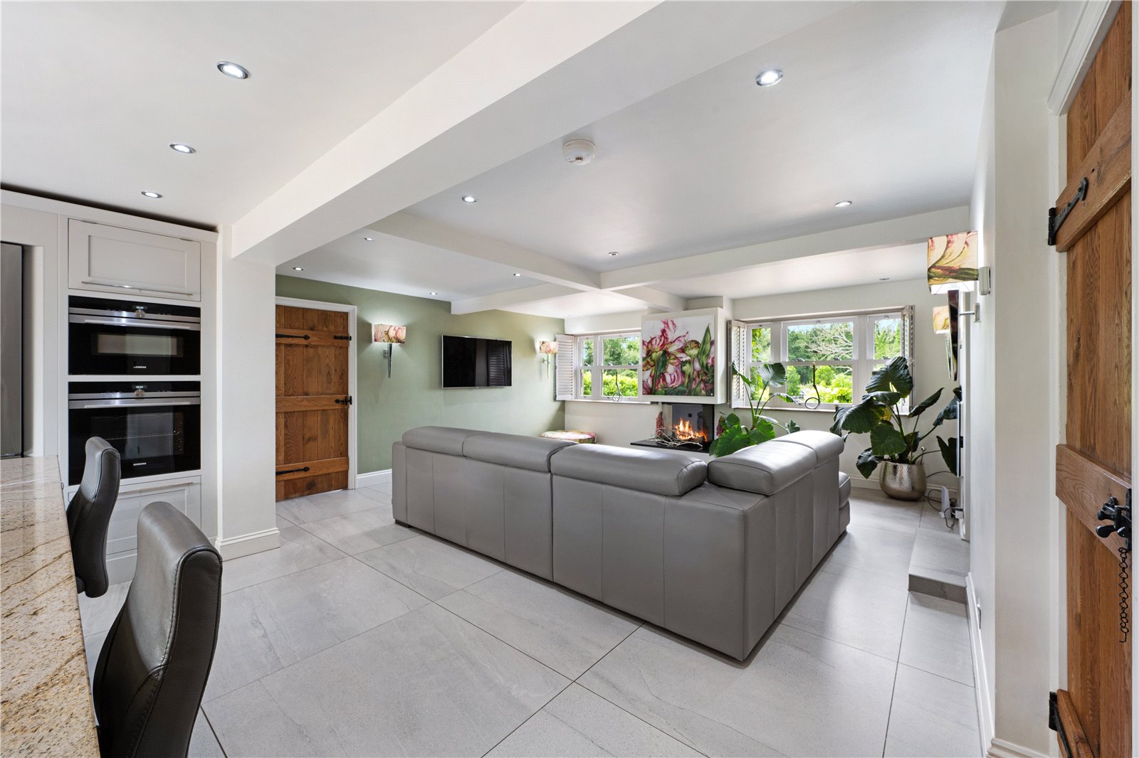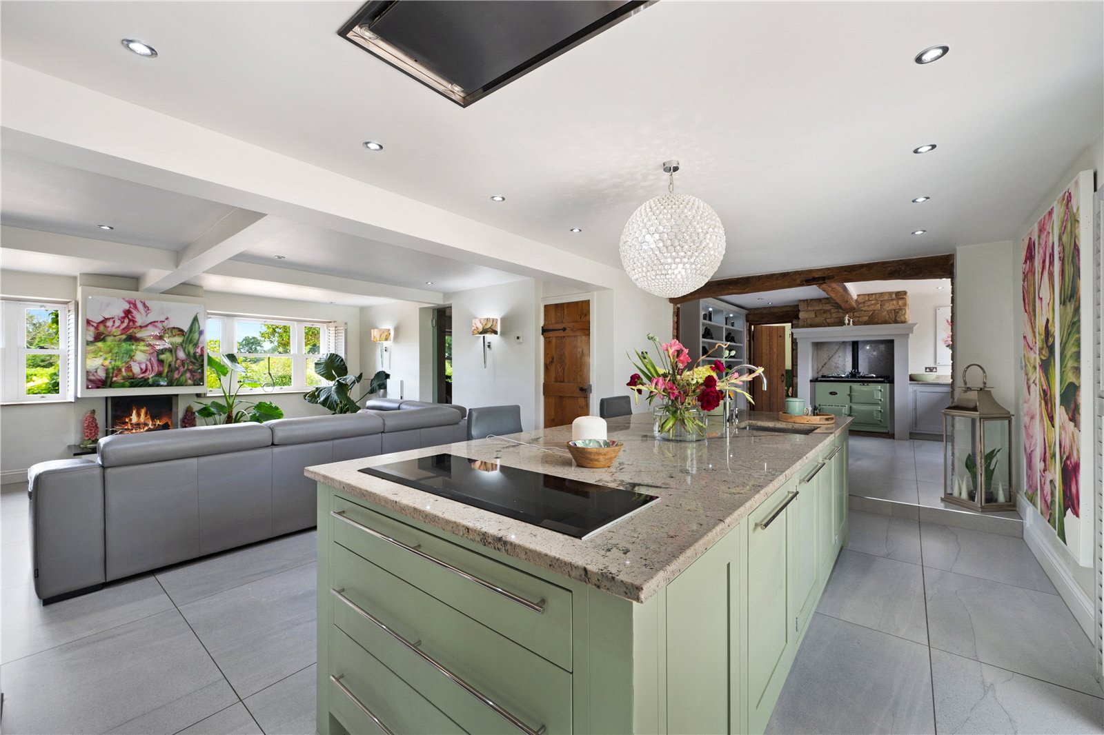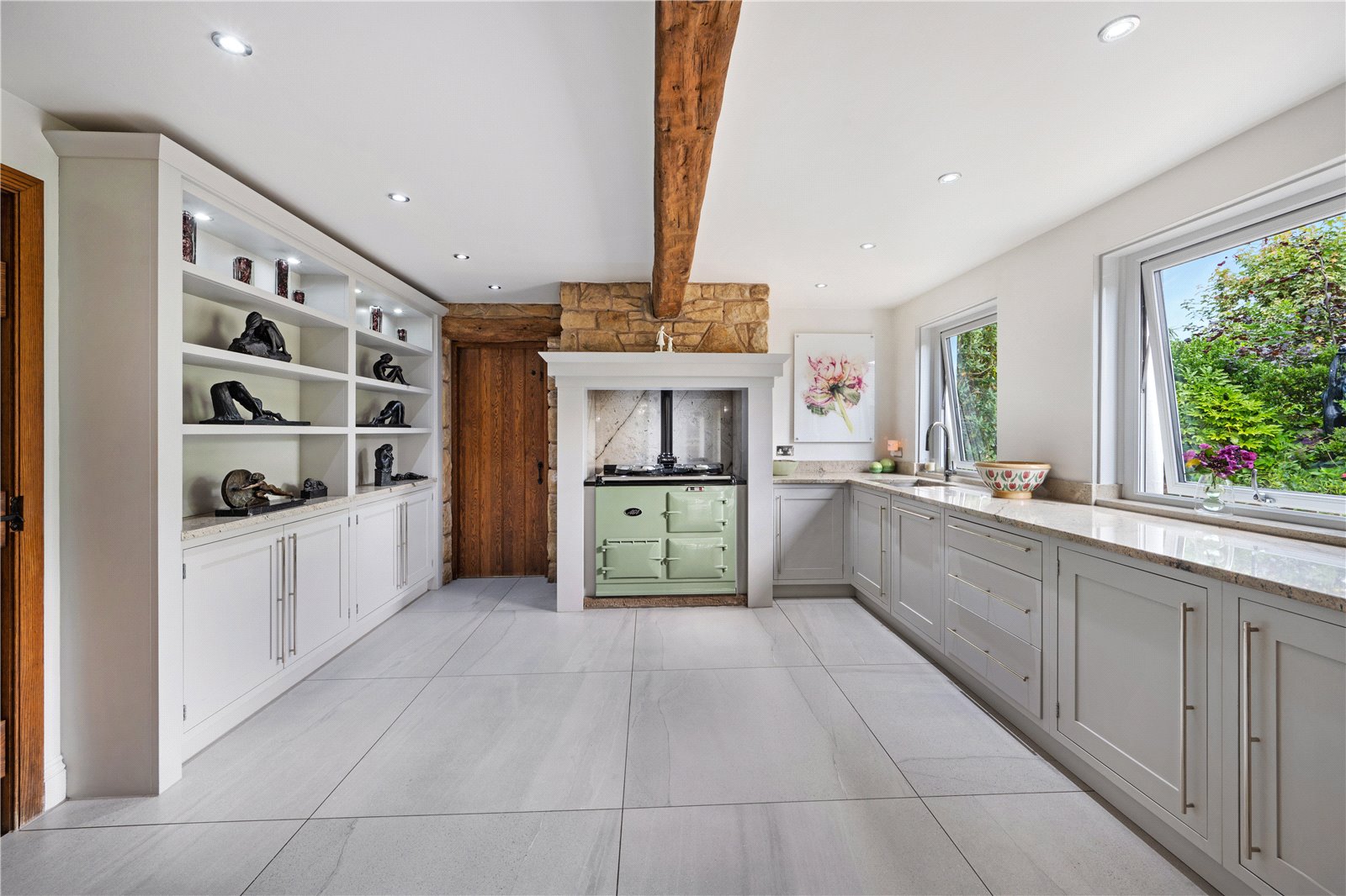 On the raised level, bespoke base units and shelving frame a classic AGA cooker (can fire the hot water) with two ovens and hotplates, alongside an integrated dishwasher and granite worktops with matching upstands. This upper area then steps down to a stunning lower kitchen space, where a large central island with granite surfaces incorporates a breakfast bar. Here, you’ll also find a Siemens induction hob with extractor, a second sink with a Quooker hot tap and soap dispenser, an electric oven and microwave combination, space for an American-style fridge-freezer, and underfloor heating beneath the porcelain tiled floor. This space opens into a relaxed family area with a feature wood-burning stove and twin shuttered windows to the front.