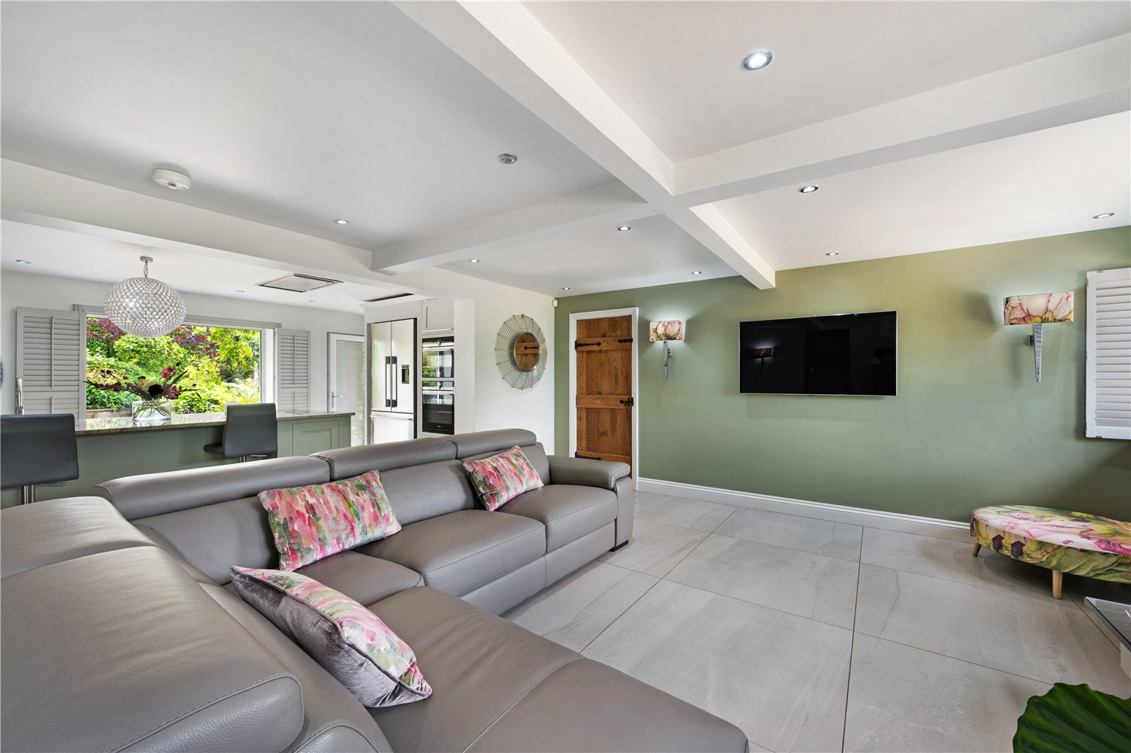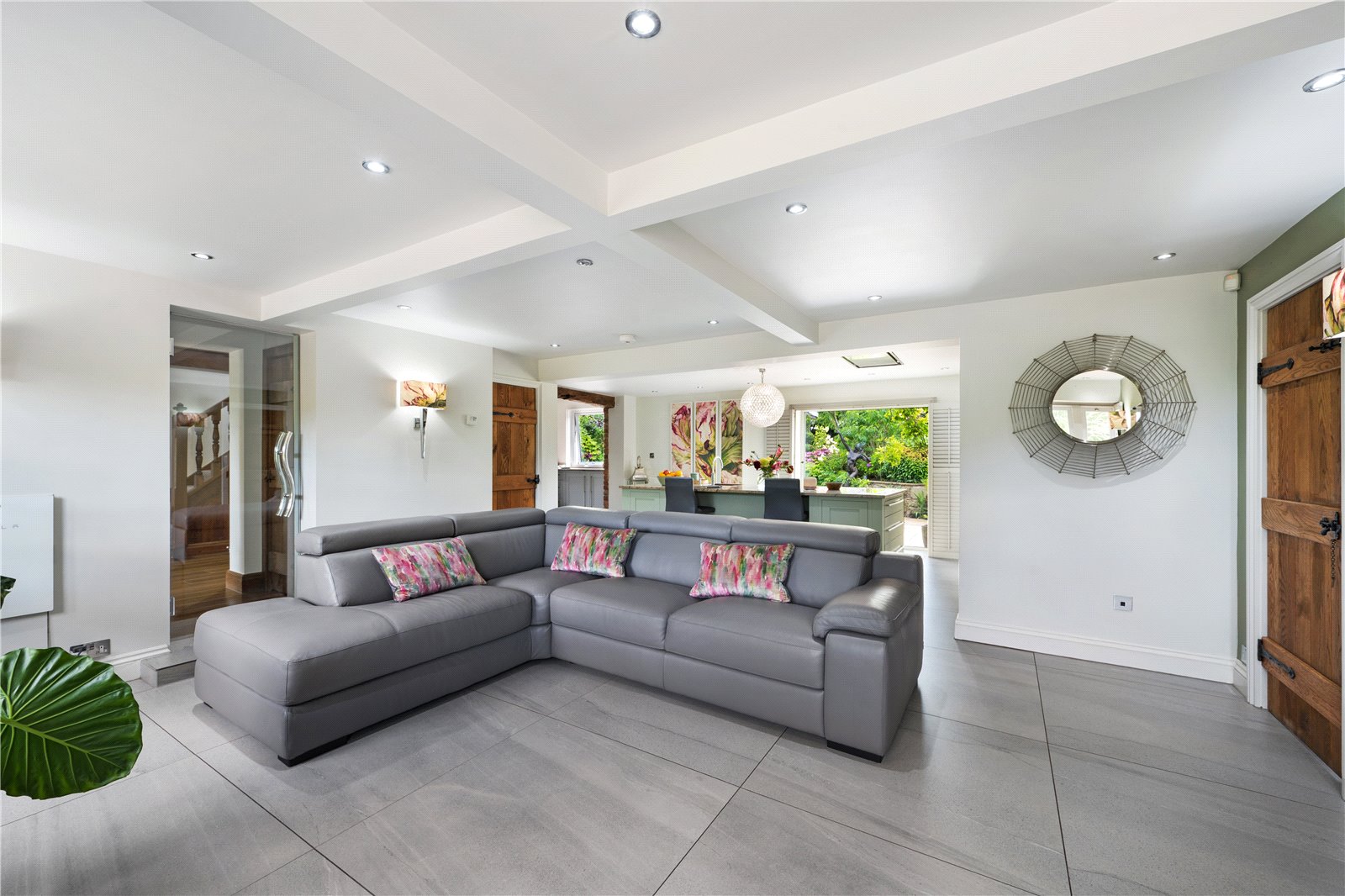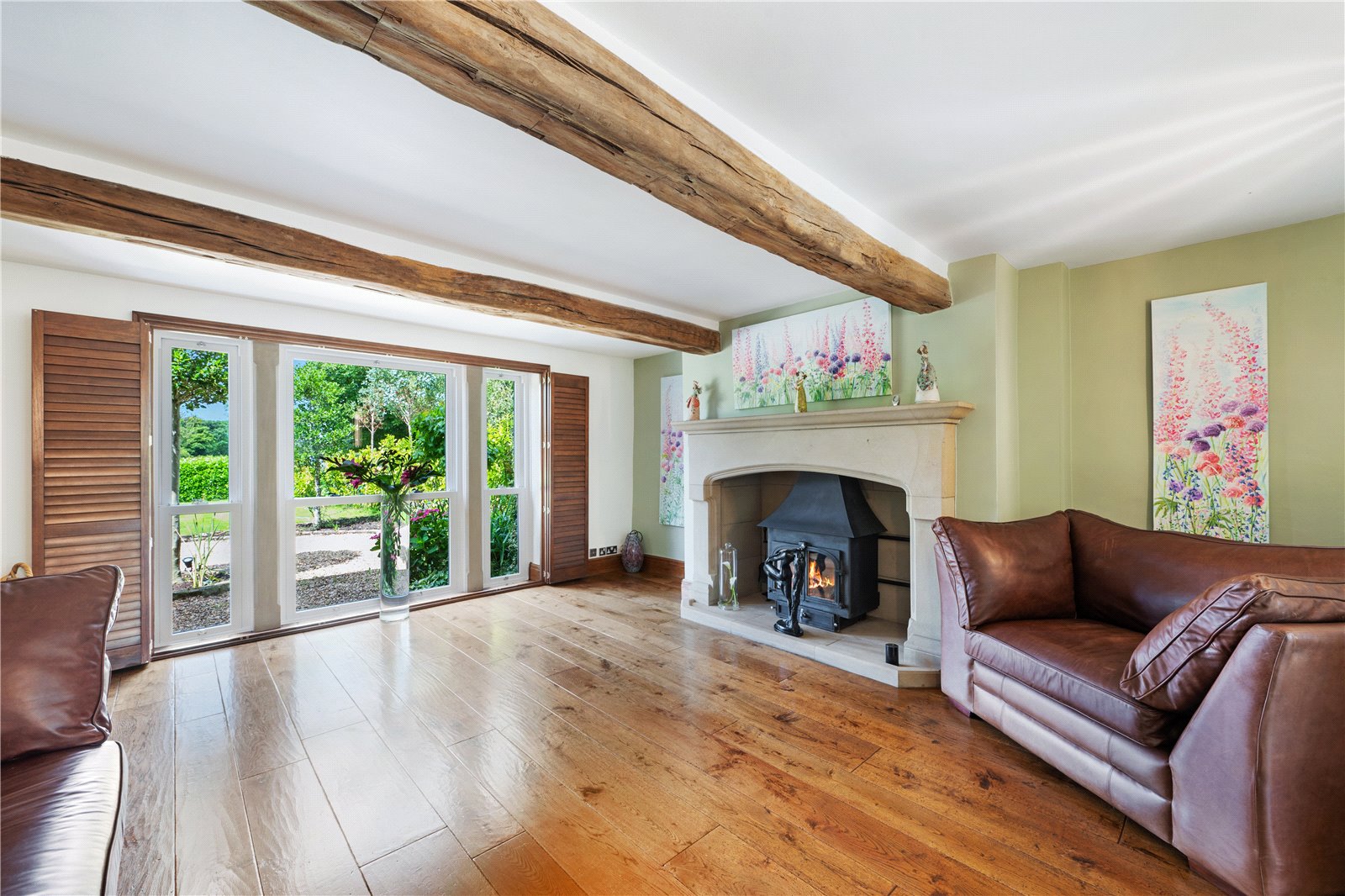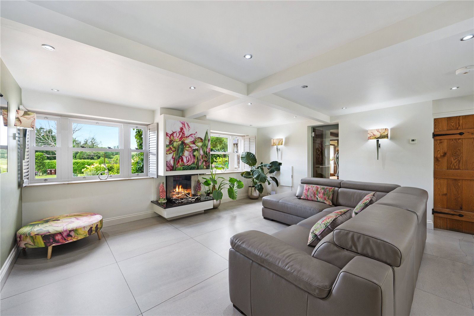On the raised level, bespoke base units and shelving frame a classic AGA cooker (can fire the hot water) with two ovens and hotplates, alongside an integrated dishwasher and granite worktops with matching upstands. This upper area then steps down to a stunning lower kitchen space, where a large central island with granite surfaces incorporates a breakfast bar. Here, you’ll also find a Siemens induction hob with extractor, a second sink with a Quooker hot tap and soap dispenser, an electric oven and microwave combination, space for an American-style fridge-freezer, and underfloor heating beneath the porcelain tiled floor. This space opens into a relaxed family area with a feature wood-burning stove and twin shuttered windows to the front.