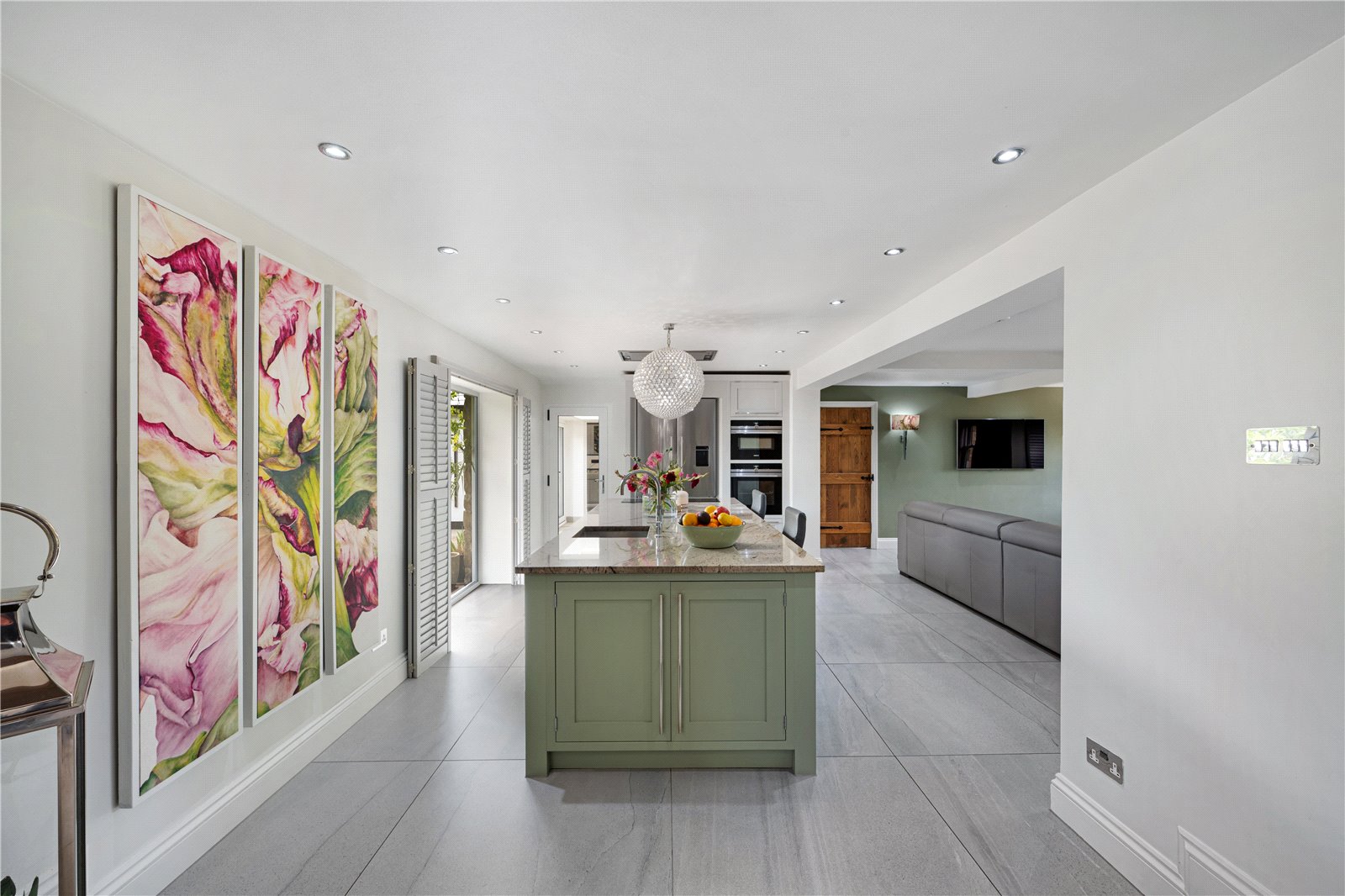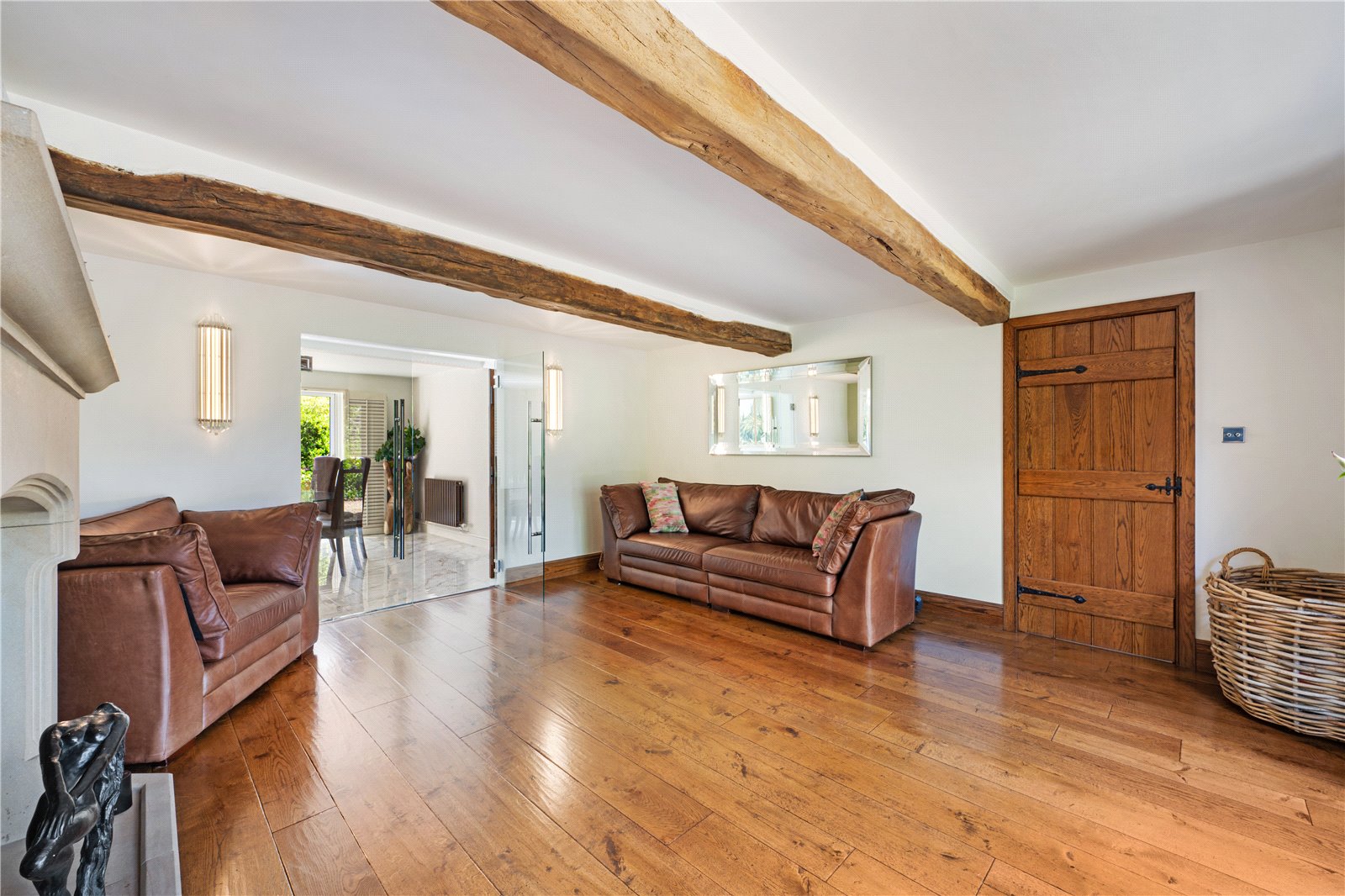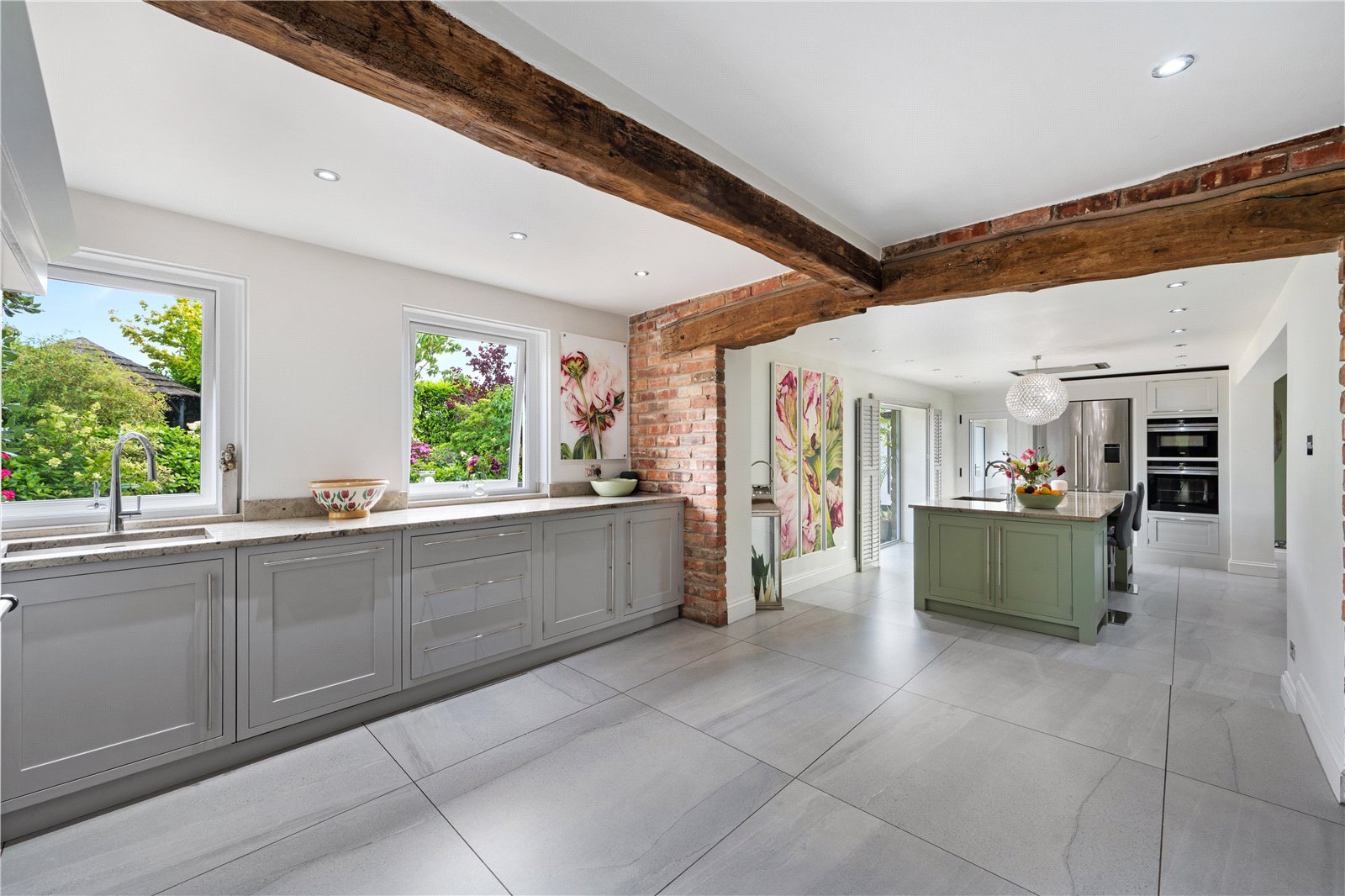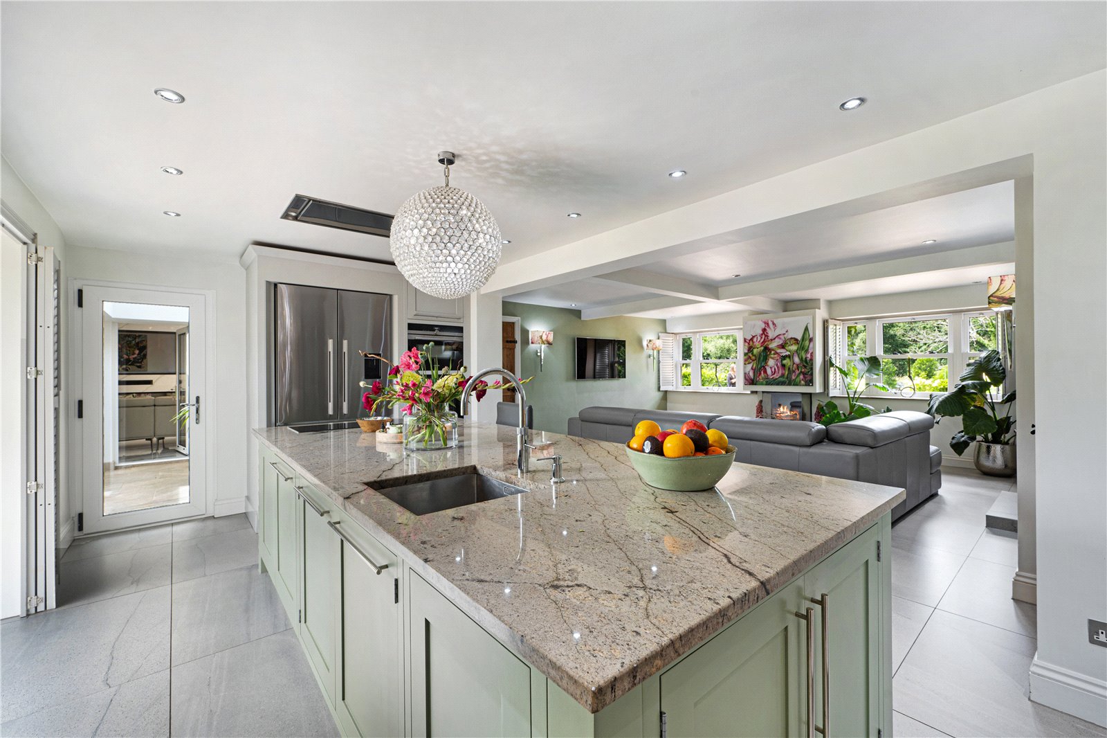On the raised level, bespoke base units and shelving frame a classic AGA cooker (can fire the hot water) with two ovens and hotplates, alongside an integrated dishwasher and granite worktops with matching upstands. This upper area then steps down to a stunning lower kitchen space, where a large central island with granite surfaces incorporates a breakfast bar. Here, you’ll also find a Siemens induction hob with extractor, a second sink with a Quooker hot tap and soap dispenser, an electric oven and microwave combination, space for an American-style fridge-freezer, and underfloor heating beneath the porcelain tiled floor. This space opens into a relaxed family area with a feature wood-burning stove and twin shuttered windows to the front.