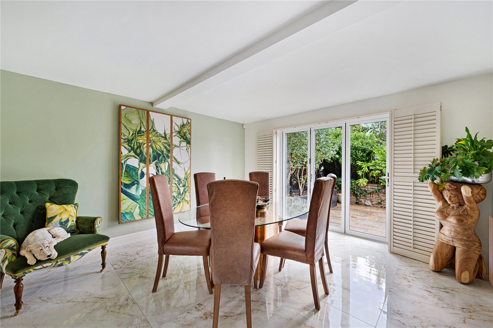 The living room is an inviting and atmospheric space, centred around a magnificent stone fireplace housing a multi-fuel stove (can fire the central heating), flanked by full-height sliding sash windows with elegant shutters - a theme that runs through a large proportion of the house. Solid oak flooring and a glazed internal door lead gracefully into the dining room, where porcelain tiles and bi-folding doors open out to the rear garden, creating a seamless indoor-outdoor experience. An internal door flows through to the striking split-level Tom Howley kitchen, designed in two distinct zones to balance functionality with style.
