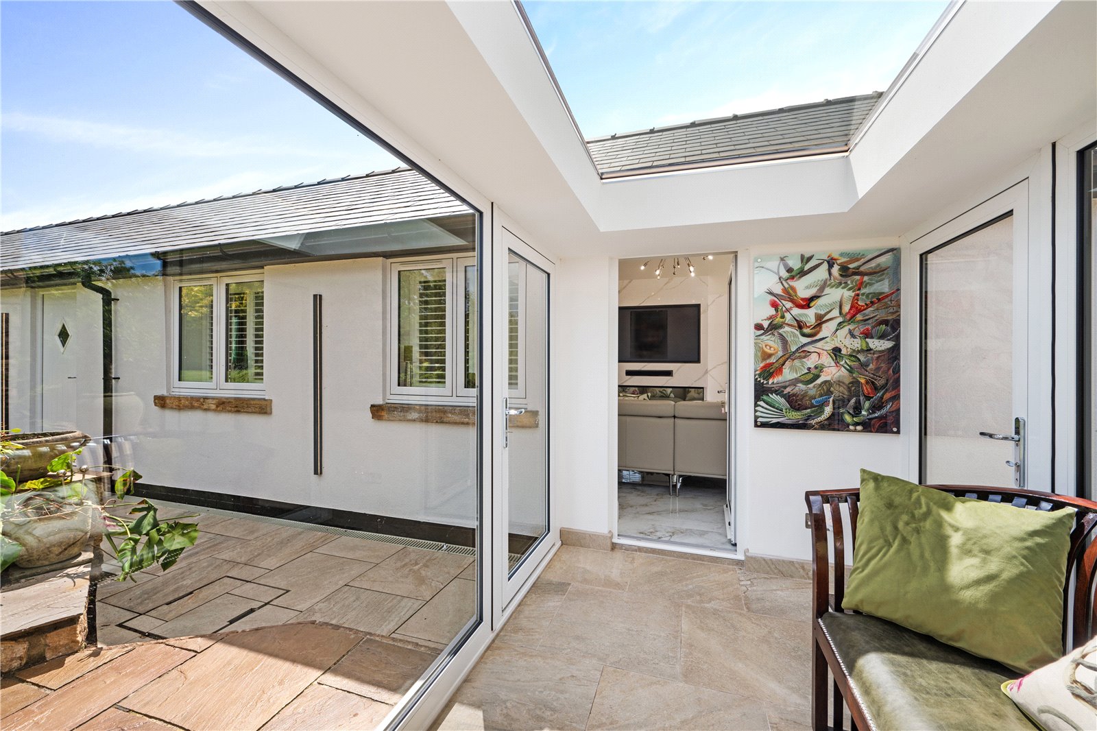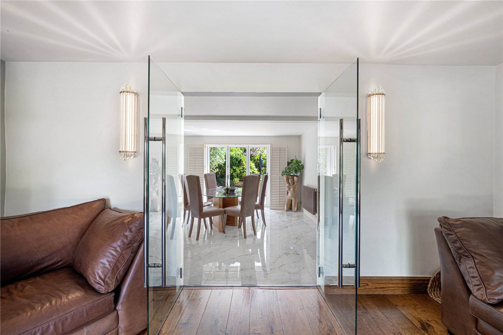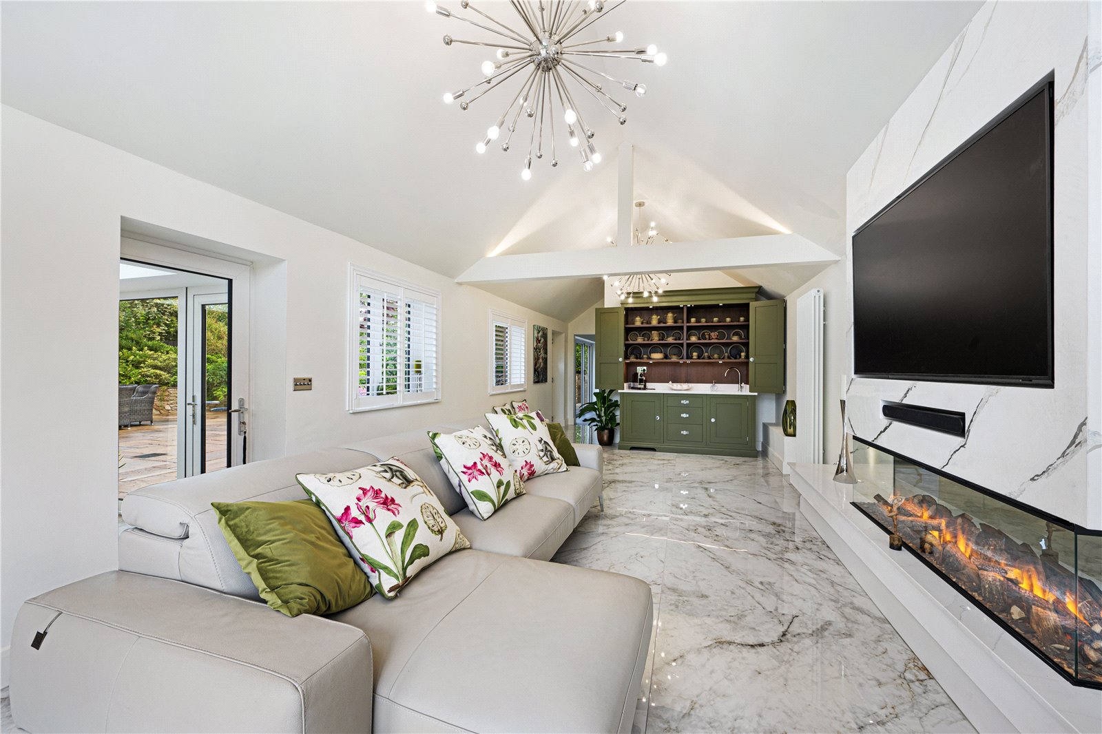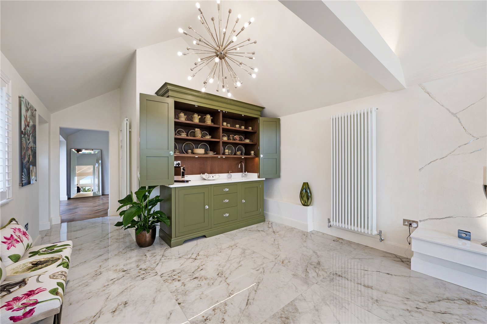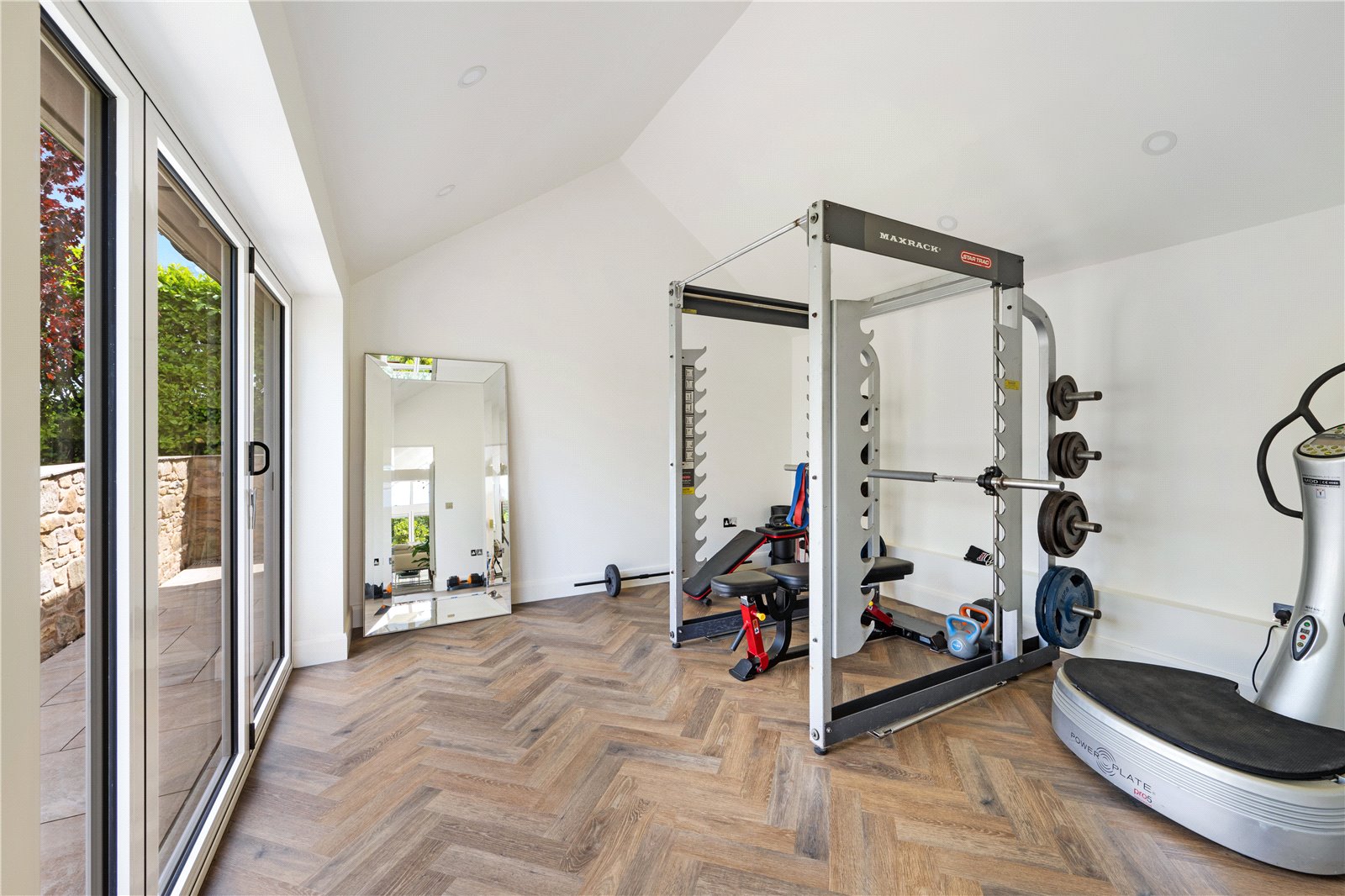 From the lower kitchen, a glazed atrium-style passage with front and rear access leads into a flexible additional living space, ideal as an annexe. This superbly designed area includes a vaulted-ceiling sitting room with a fully glazed front elevation, bi-fold doors, remote-control blinds, bespoke Tom Howley cabinetry with integrated sink and fridge, and a feature media wall with remote control electric fire. A stylish 3pc shower room and a gym that is easily adaptable as an additional bedroom complete this space, with bi-fold doors leading to the garden.