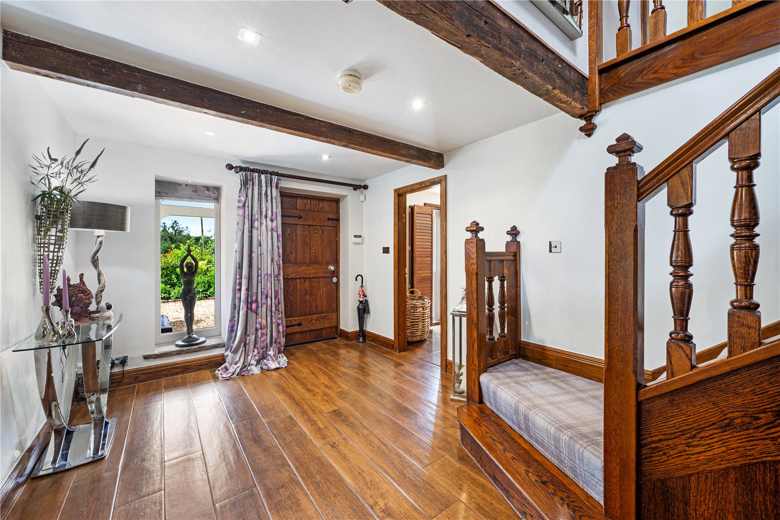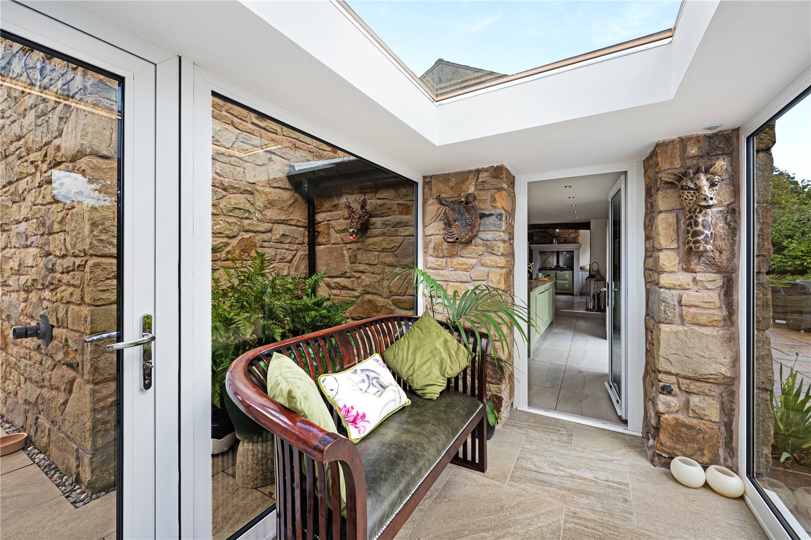 From the moment you arrive, the character and quality are evident - step beneath the charming pitched-roof open porch, laid with traditional flagstones, and pass through a solid oak front door into a welcoming entrance hall, complete with oak-effect tiled flooring, built-in storage, and a cloaks cupboard. A stylish two-piece cloakroom is accessed directly from the hallway.