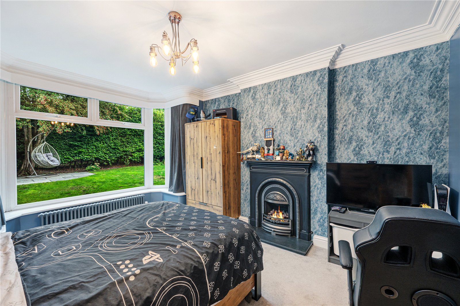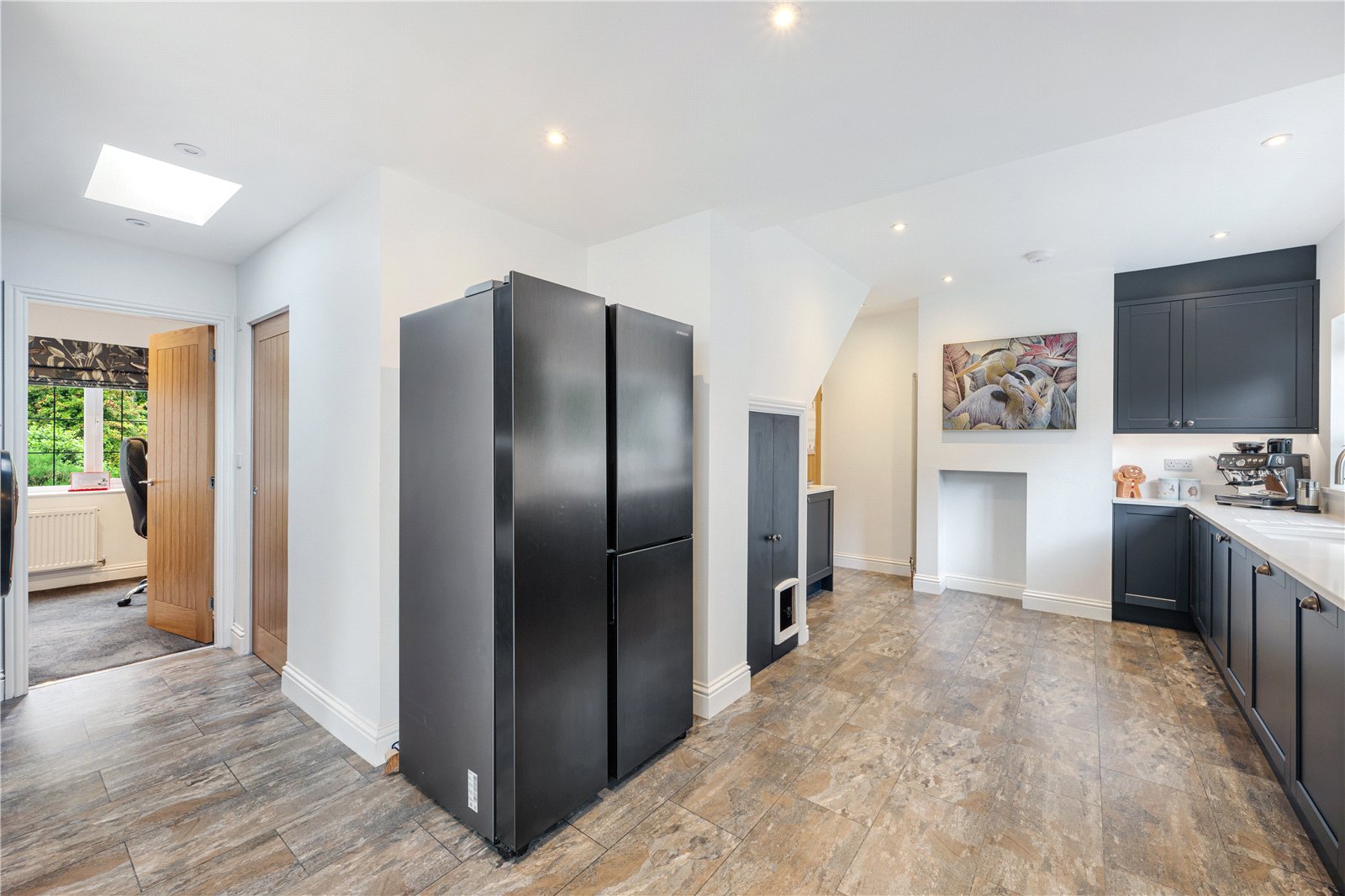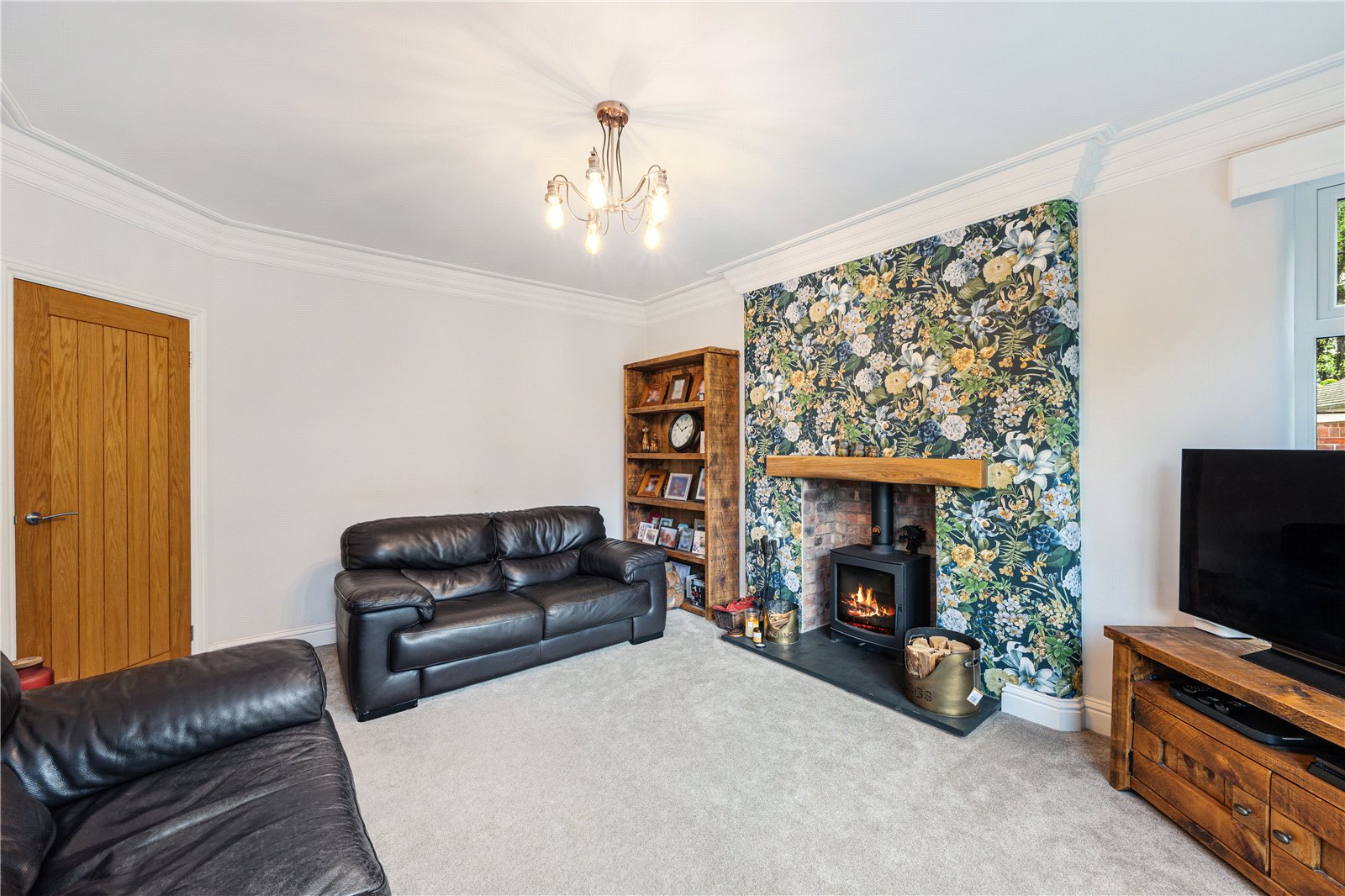 A newly fitted composite door opens from the porch into a welcoming hallway with bespoke coat and boot storage and wood-effect flooring. The sitting room is an elegant family space, centred around a wood-burning stove set on a slate hearth, with a bay window overlooking the front garden and tree-lined road. Across the hall, the former dining room now serves as a fourth bedroom, complete with a cast-iron inset gas fire on a granite hearth and views across the rear lawn.