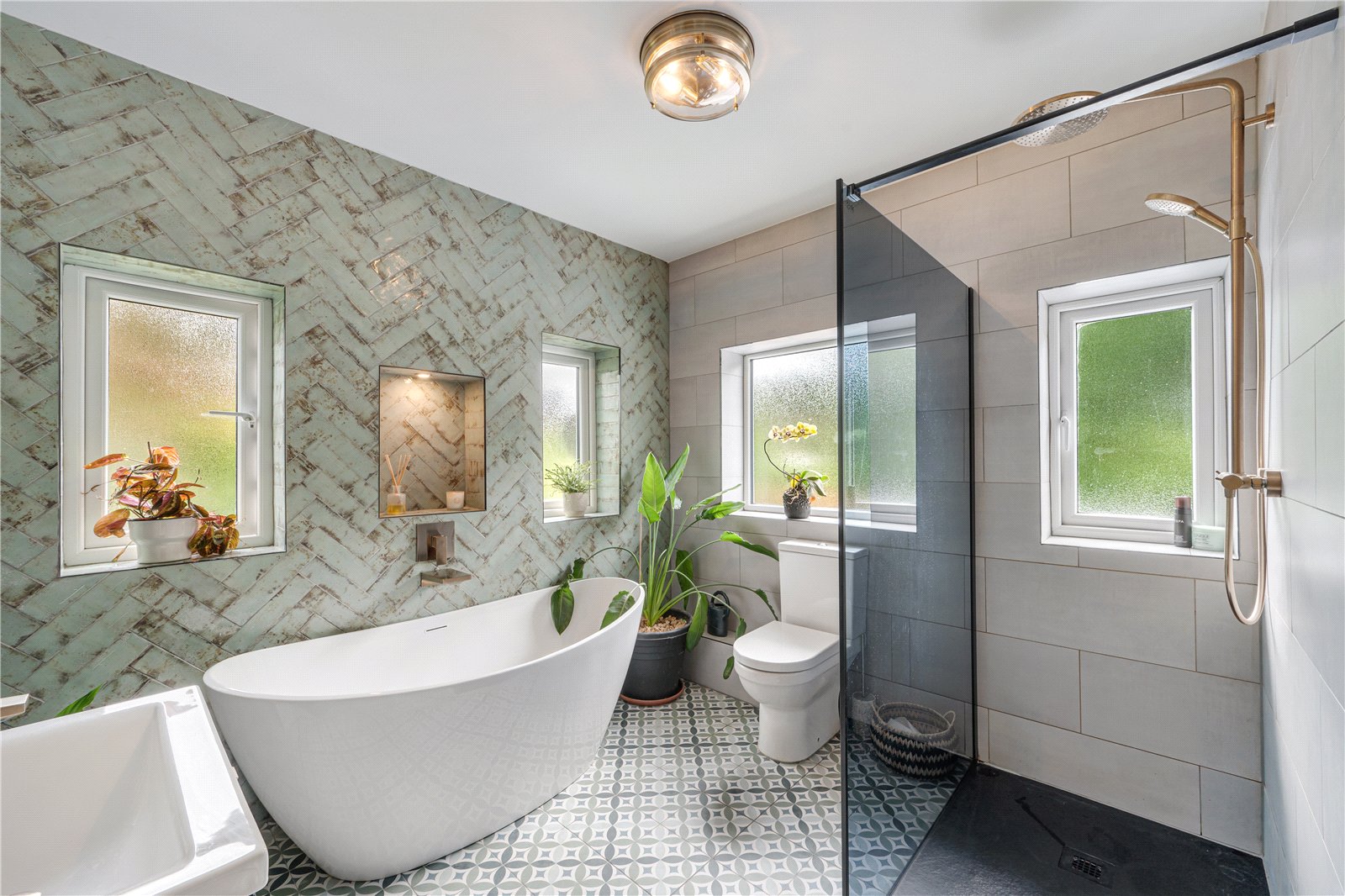 The first floor offers three well-proportioned bedrooms, including two generous doubles. From the rear bedroom, a drop-down ladder gives access to a fully boarded and insulated loft. The family bathroom is a beautifully appointed luxury 4pc suite, comprising a large walk-in shower, bath, wash basin and WC, complemented by inset shelving with feature lighting, full tiling, and electric underfloor heating.