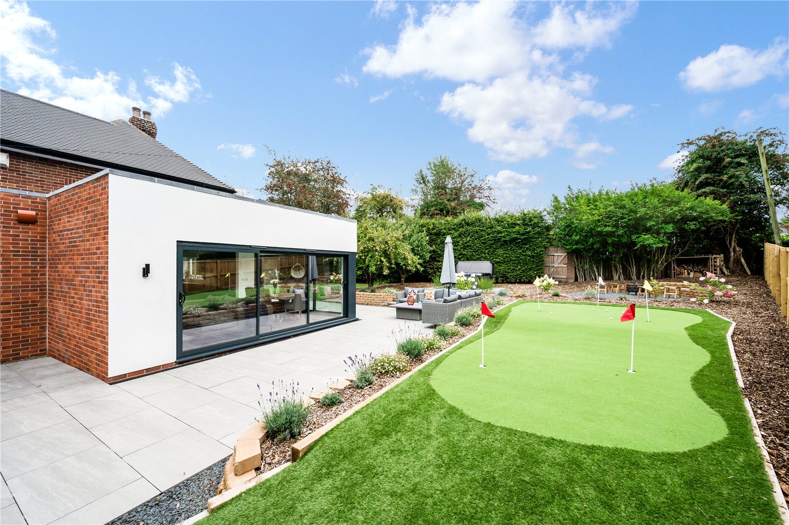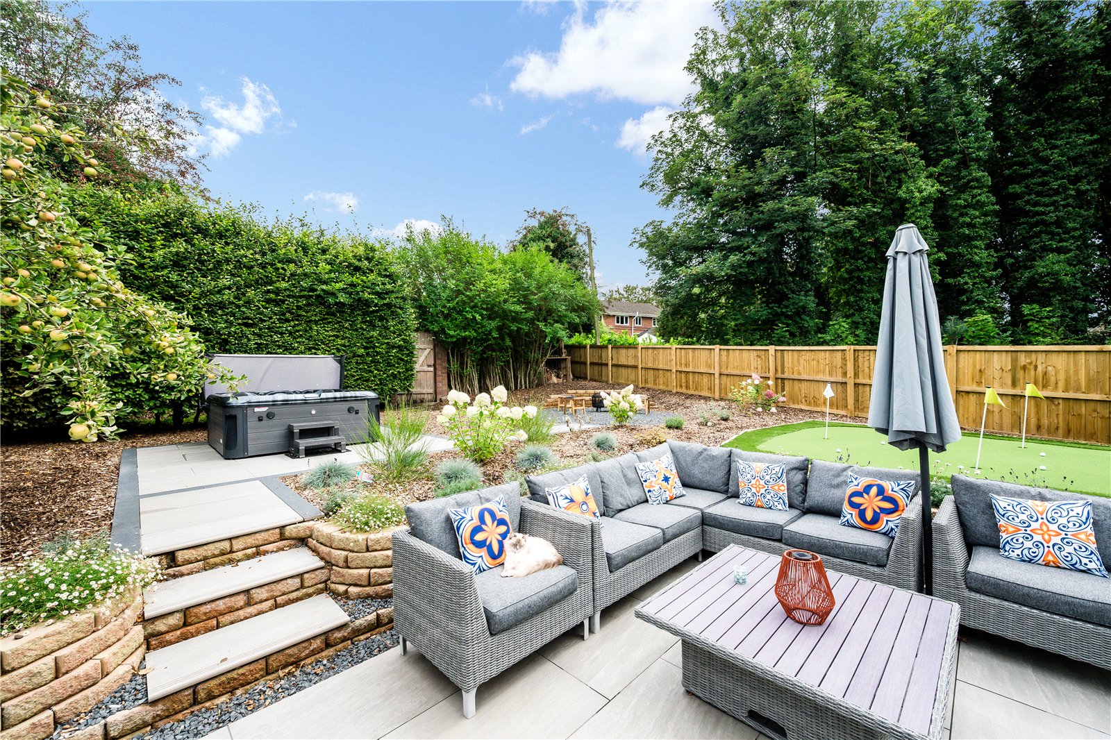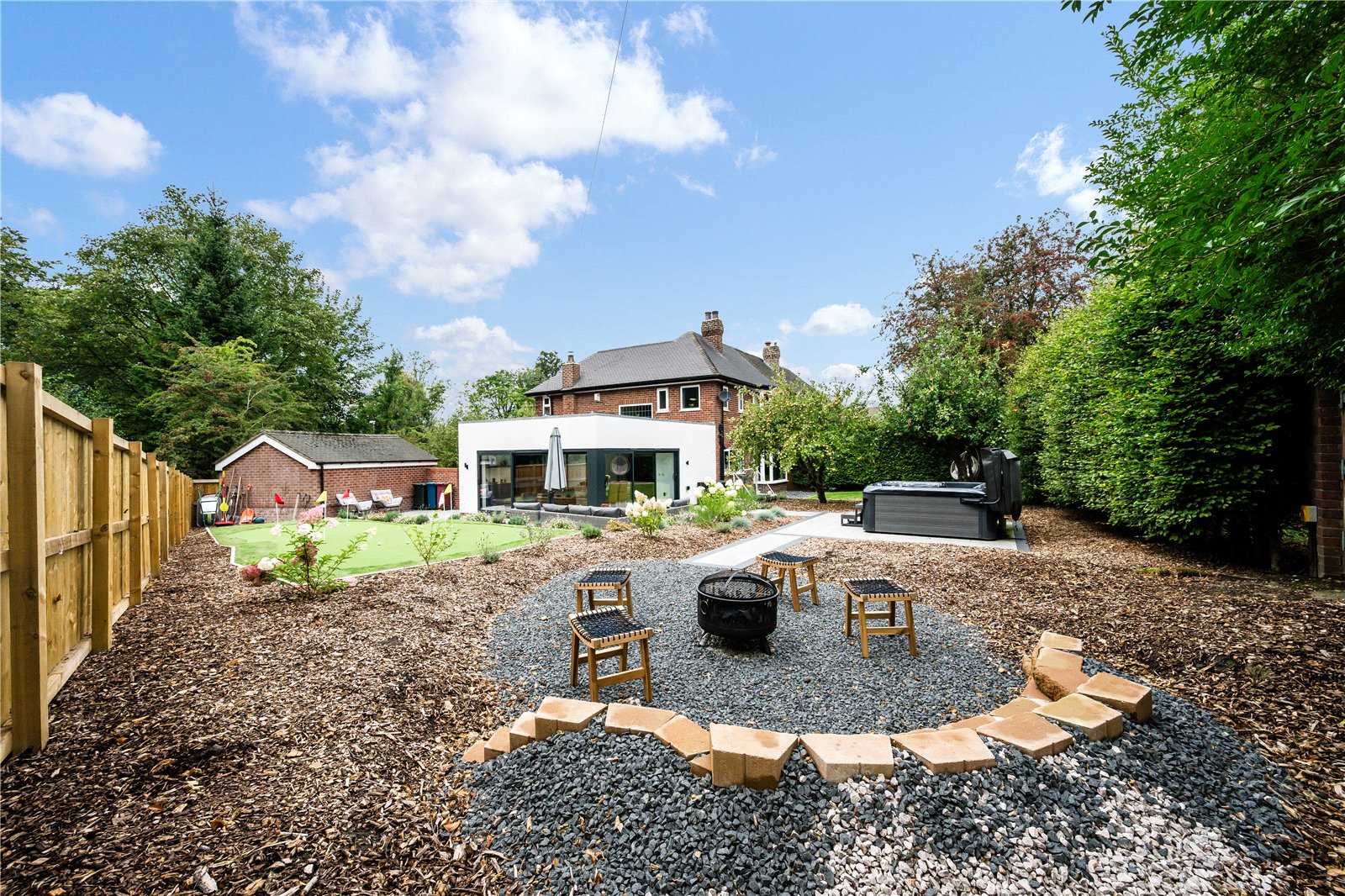 Externally, the property is approached via a wide block-paved driveway with lawned frontage and landscaped borders, together with a detached garage with electric door and vehicle charging point. The rear garden has been thoughtfully designed and landscaped with porcelain-tiled patio, lawned and stone-chipped areas, mature screening hedges, and an artificial Mackenzie style putting green. A hot tub is available by separate negotiation.