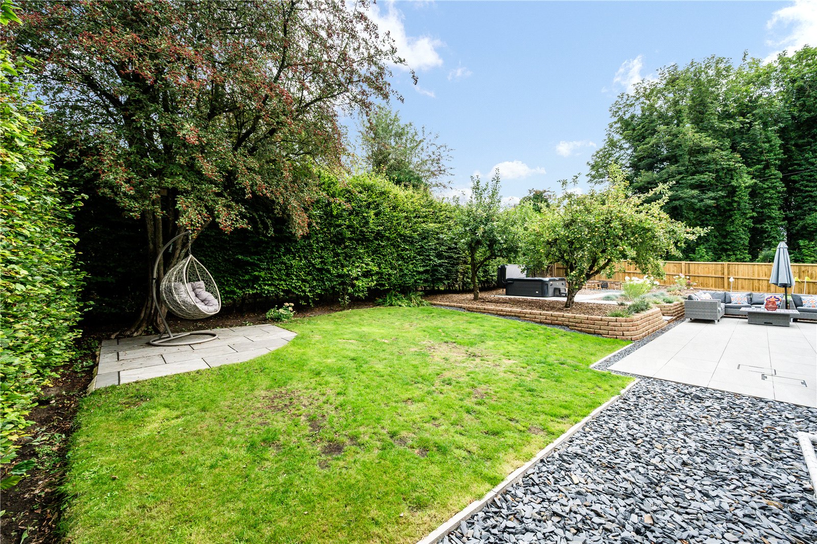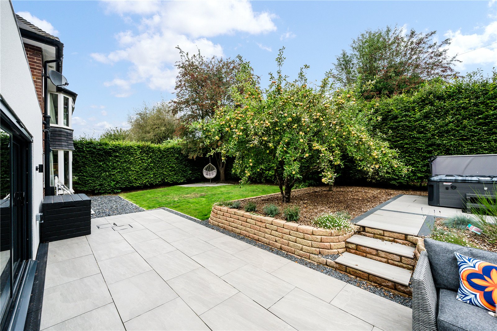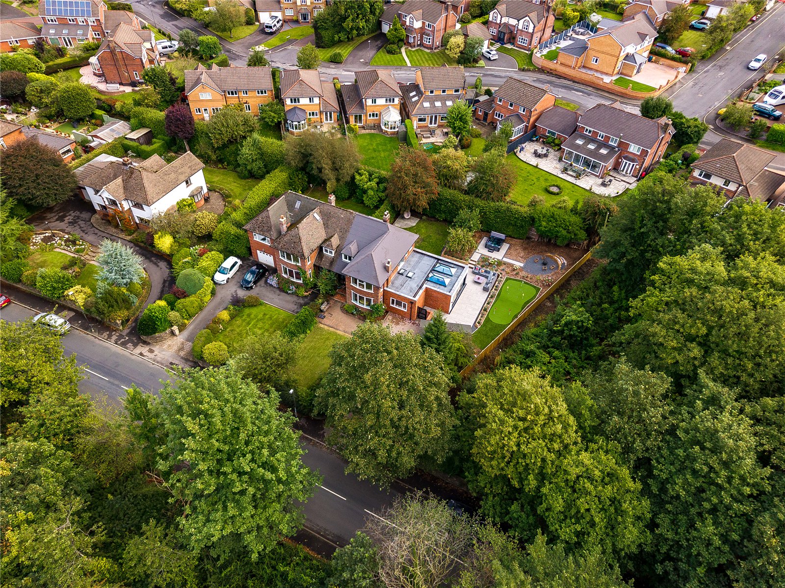 Externally, the property is approached via a wide block-paved driveway with lawned frontage and landscaped borders, together with a detached garage with electric door and vehicle charging point. The rear garden has been thoughtfully designed and landscaped with porcelain-tiled patio, lawned and stone-chipped areas, mature screening hedges, and an artificial Mackenzie style putting green. A hot tub is available by separate negotiation.