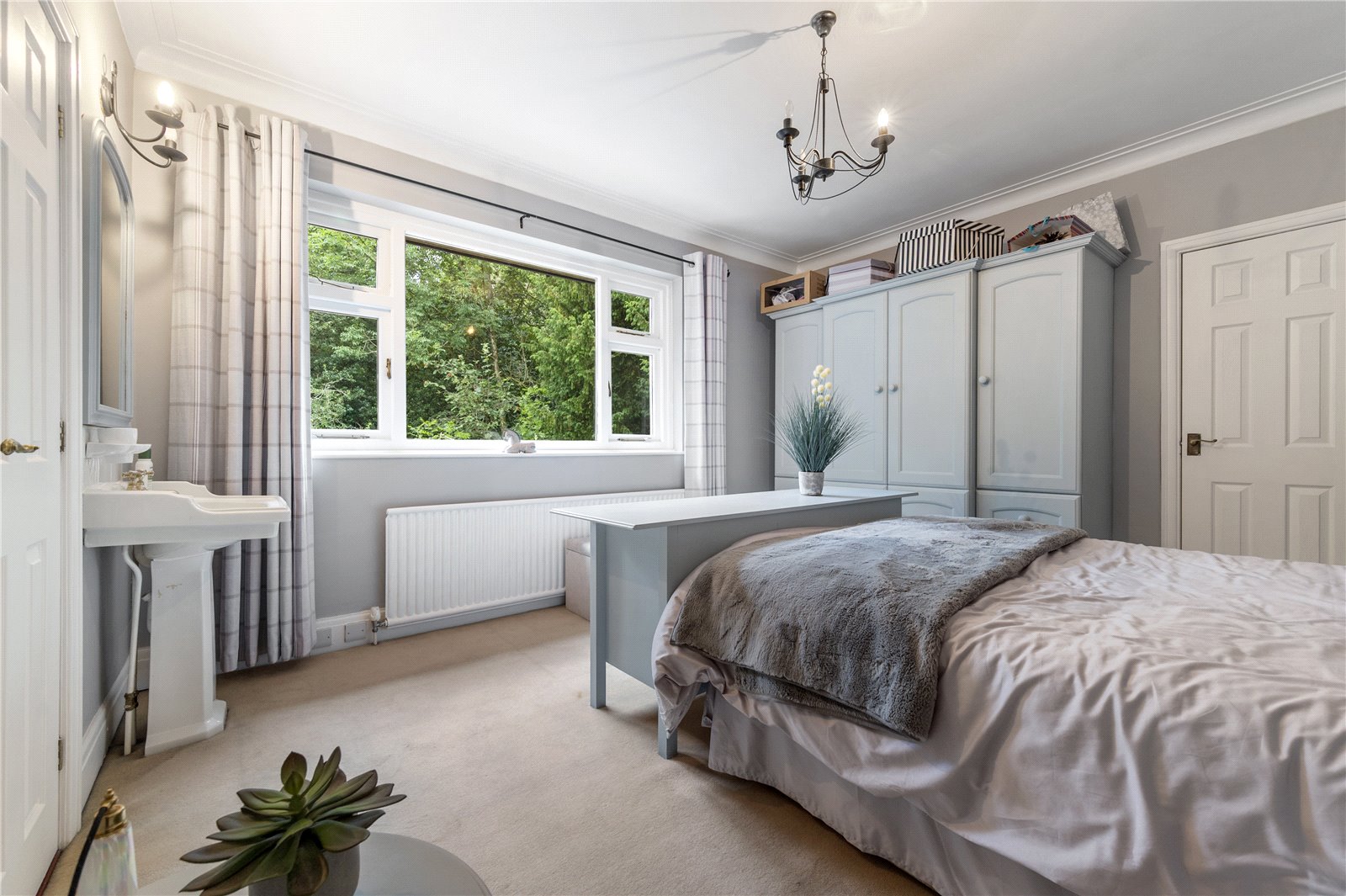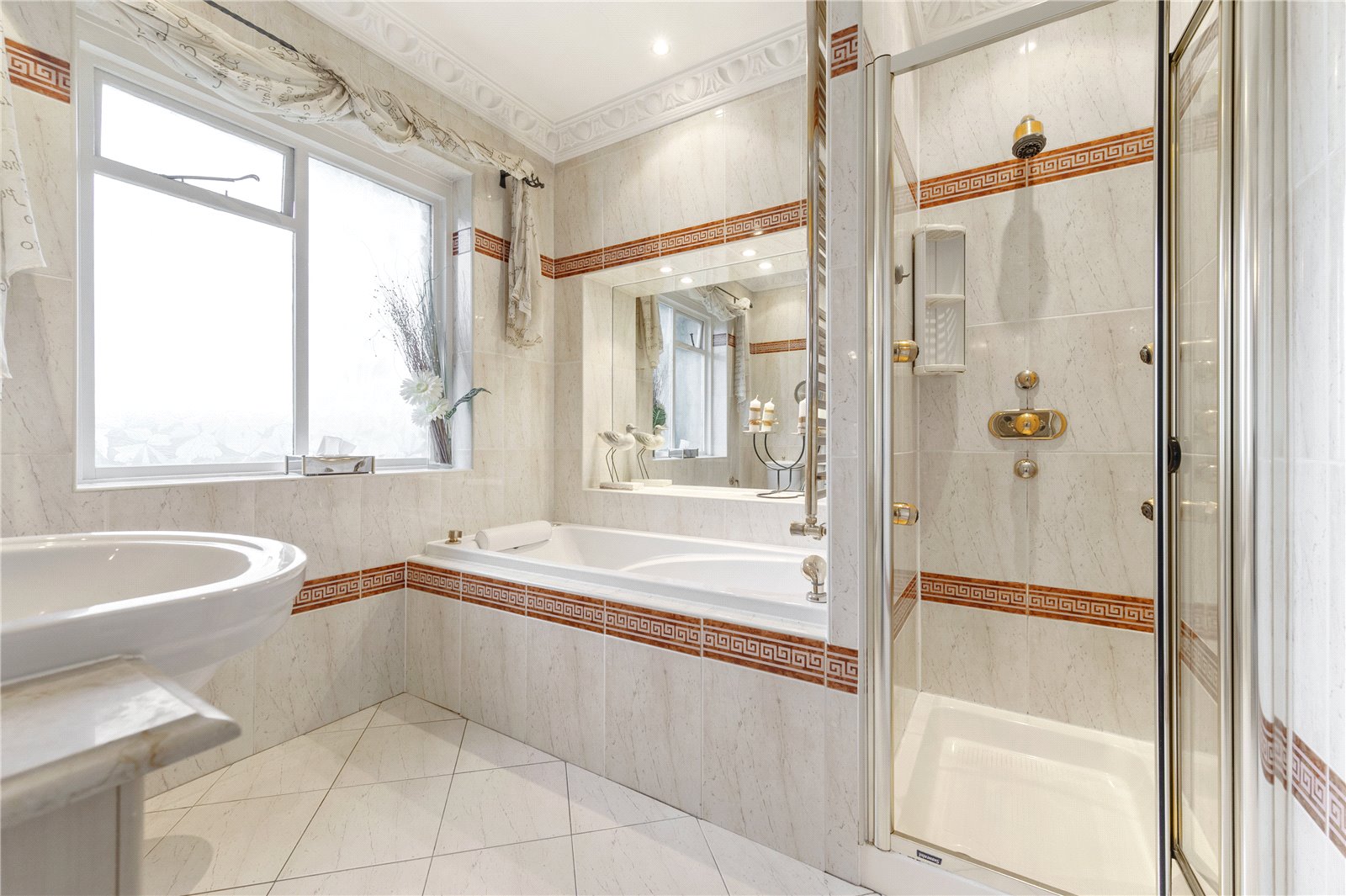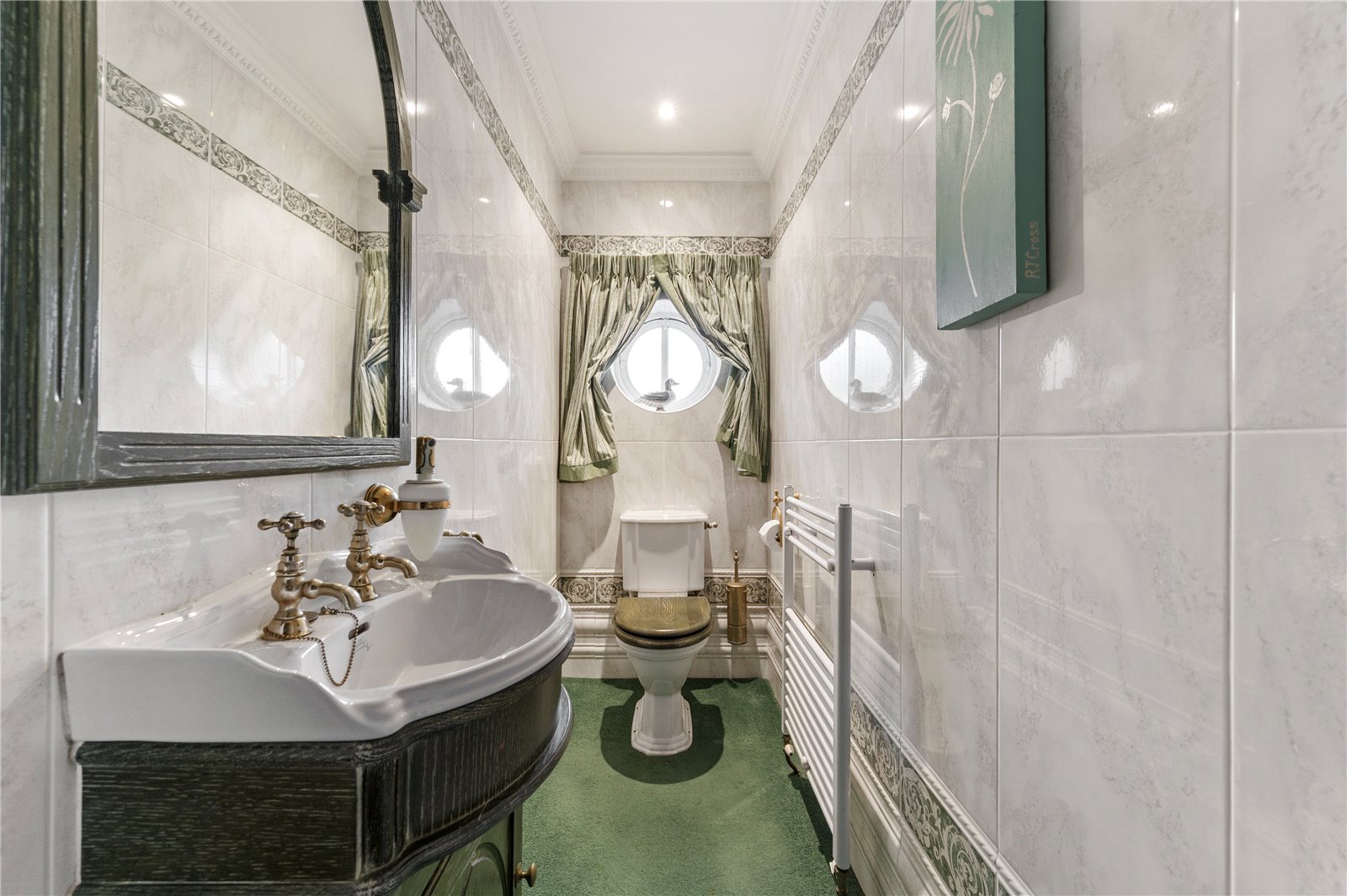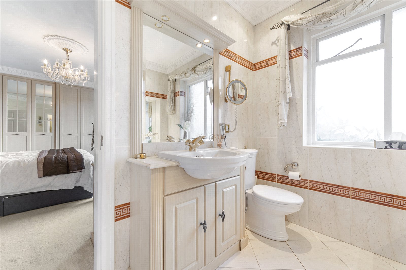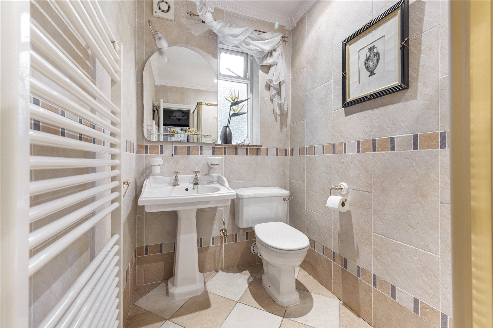 The first-floor landing, accessed via a feature staircase from the entrance hall, leads to five generously sized double bedrooms, two of which have en-suite facilities. A family shower room with a low-level WC, hand wash basin, and shower unit completes the upstairs accommodation.