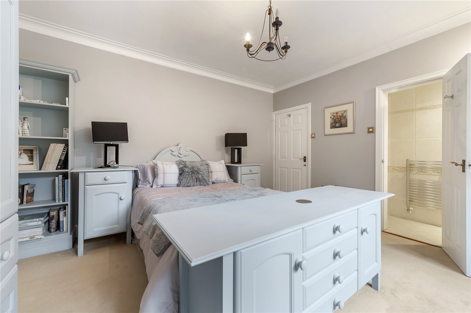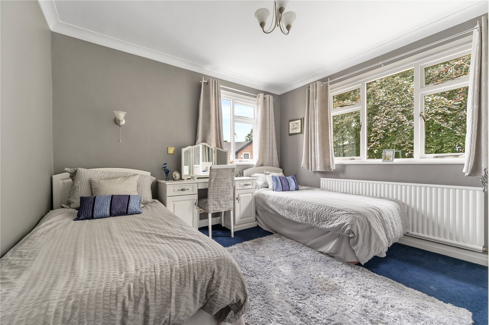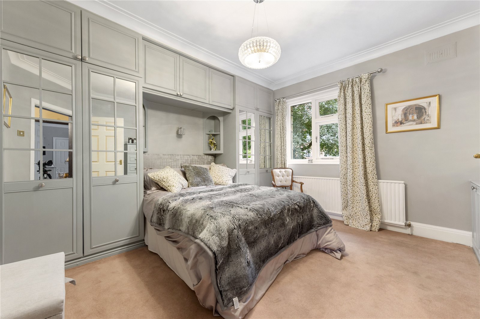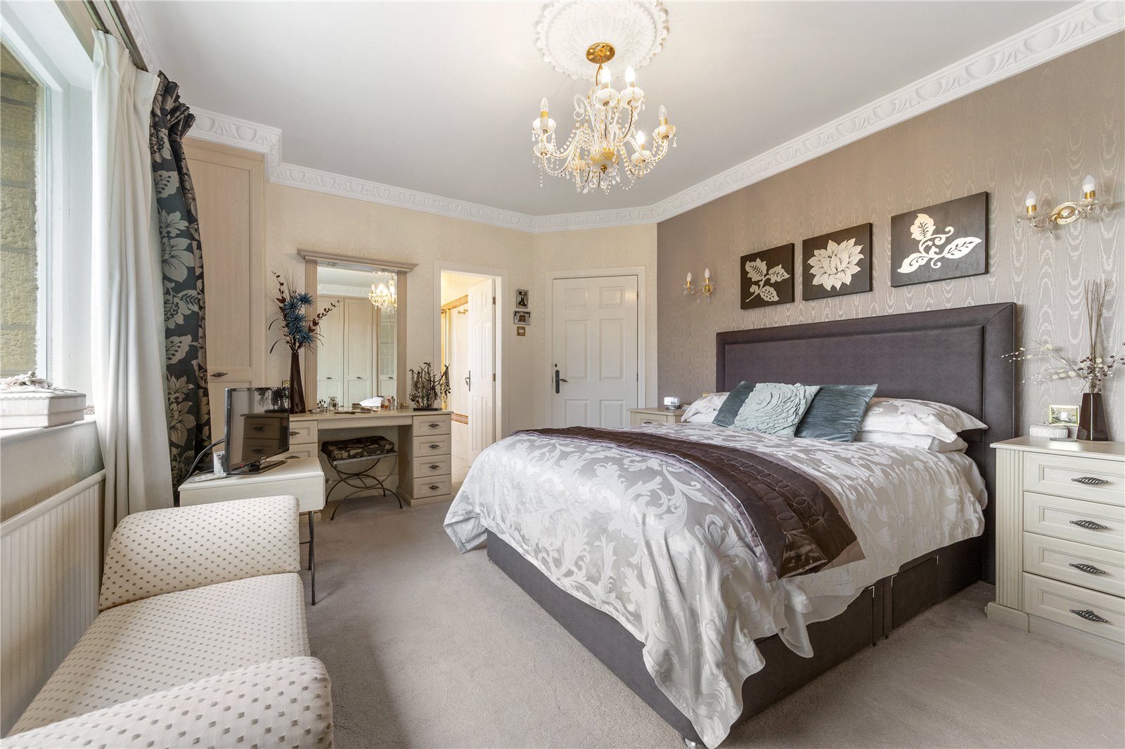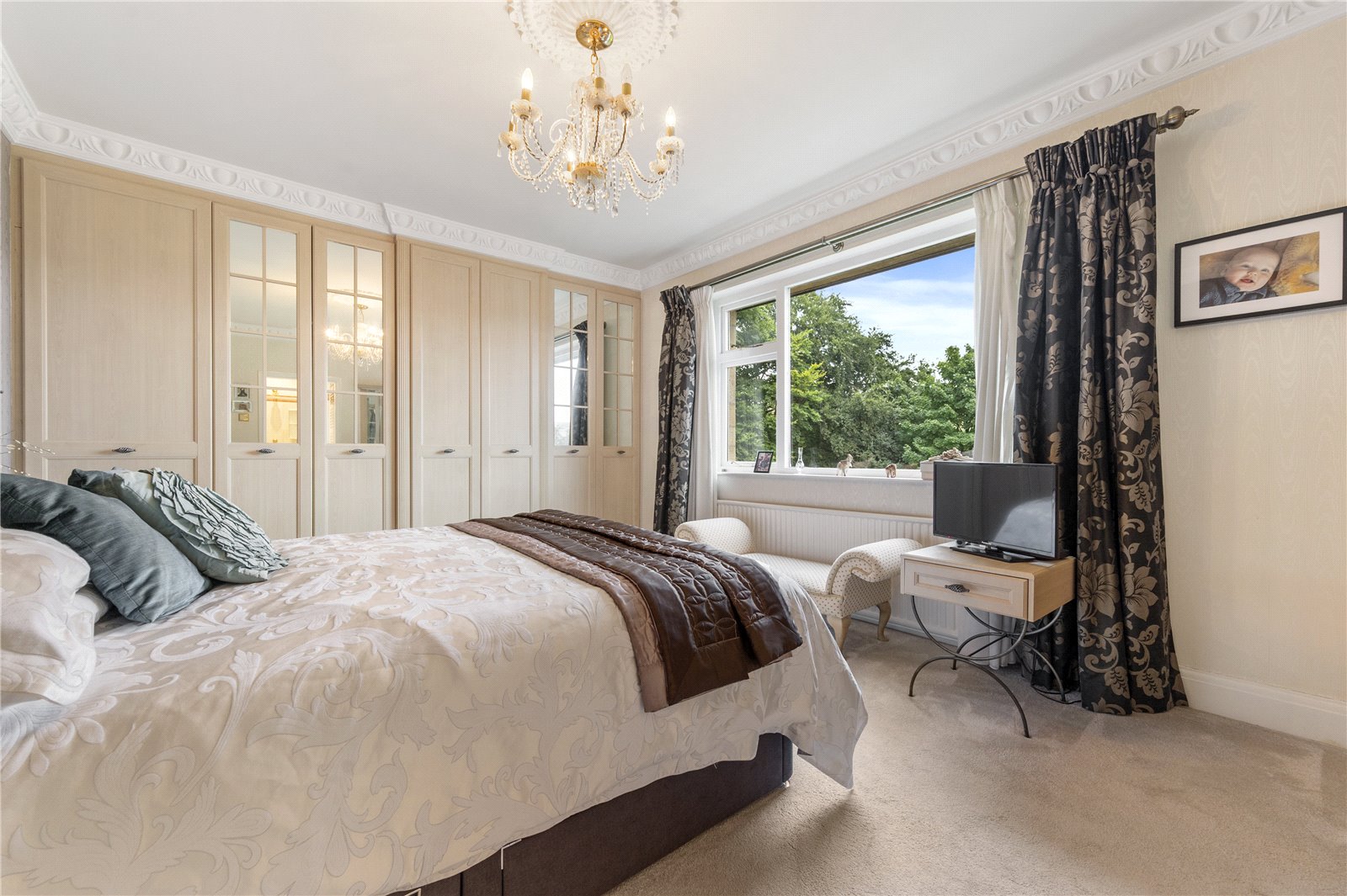 The first-floor landing, accessed via a feature staircase from the entrance hall, leads to five generously sized double bedrooms, two of which have en-suite facilities. A family shower room with a low-level WC, hand wash basin, and shower unit completes the upstairs accommodation.