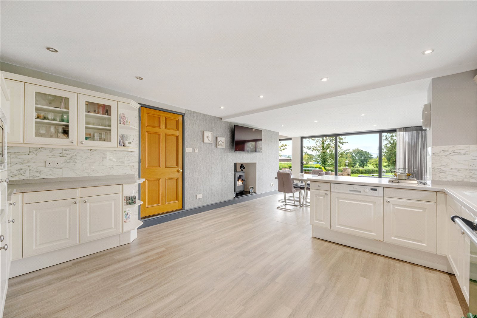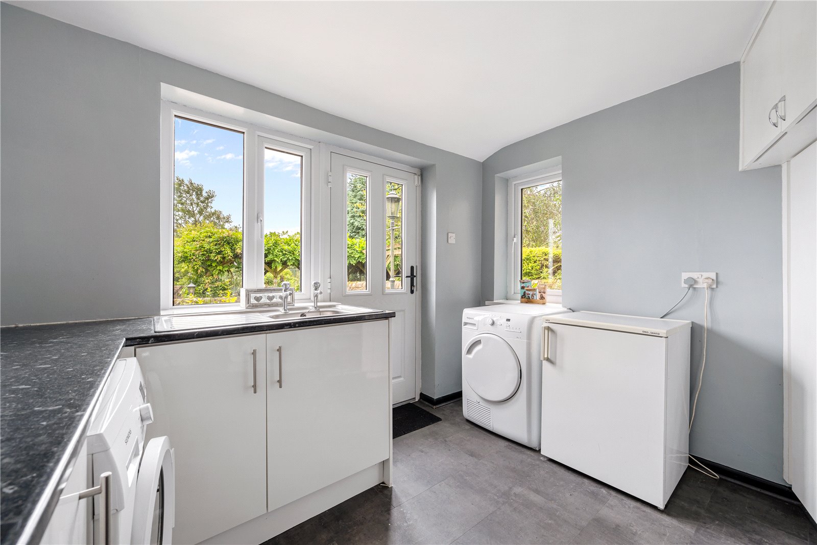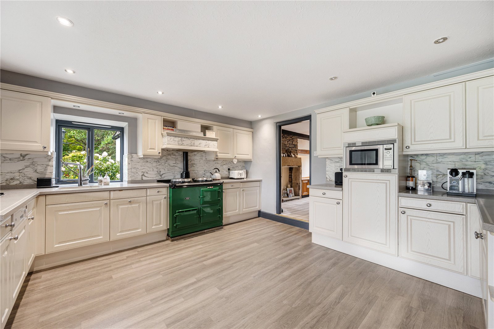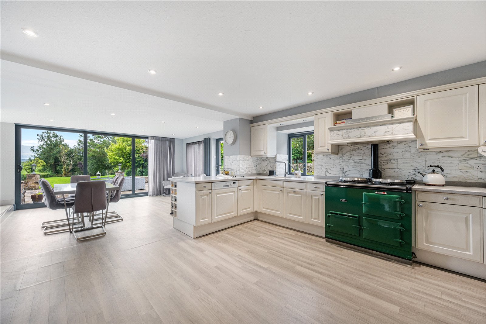 The property offers well-planned accommodation of Circa 3412 Sq Ft, and features an inviting entrance hall with a barn arch entrance, double doors at the front, and Amtico flooring throughout much of the ground floor. The dining room includes a decorative fire place and there is a hatch leading to a cellar with a flagged floor, perfect for wine storage. The snug is a cosy retreat with windows on both the front and side, while the living room centres around a dual-room multi-fuel stove, complemented by sliding patio doors that open to the rear. The dining kitchen is Siematic and is both stylish and functional, equipped with a range of units, an Aga with a two-ring hot plate and double oven, integrated dishwasher, Corian worktops with matching upstands, and additional sliding doors that lead to the rear garden. Adjacent to the kitchen, a side hall offers practical storage space and connects to a two-piece cloakroom with a marble plinth wash basin and dual flush WC. The utility room is well-appointed with a single-bowl sink, ample work surfaces, plumbing for a washing machine, space for a dryer, an external door, and more storage.