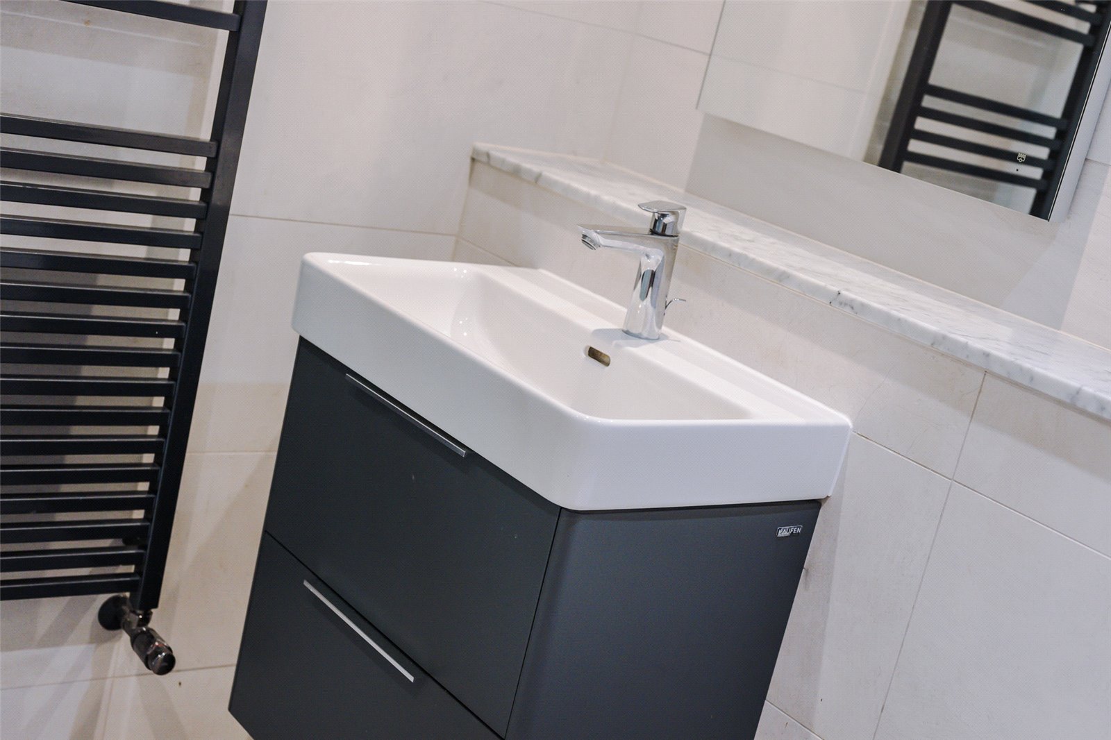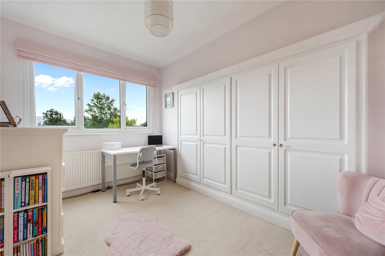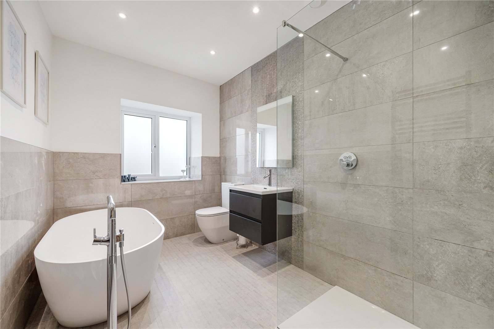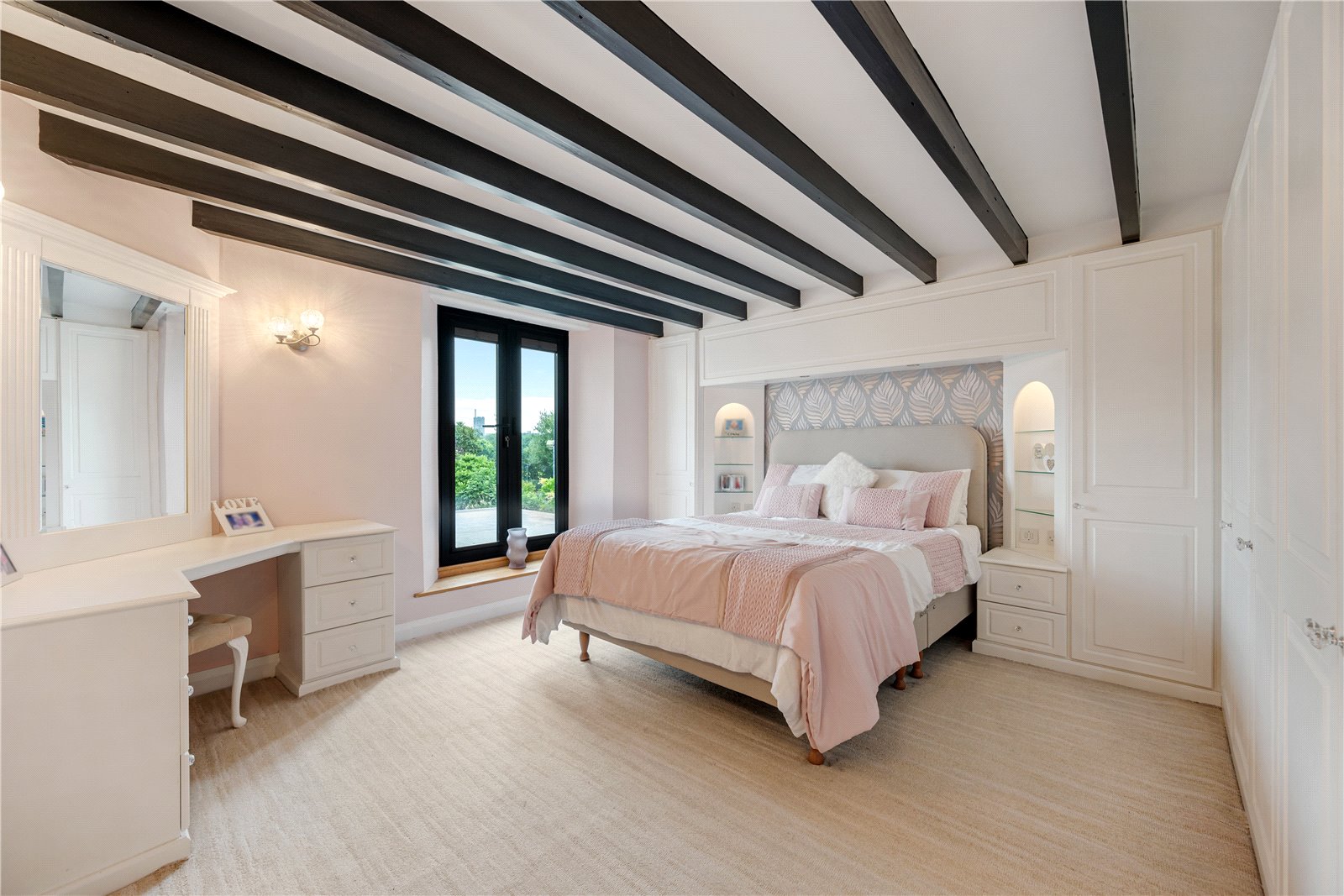 Upstairs, the first floor houses five well-proportioned bedrooms. The main bedroom features built-in wardrobes, a dressing table, and bedside tables, with French doors opening onto a roof extension, offering the possibility of a private balcony or terrace. The en-suite shower room is a 3pc suite includes a walk-in shower with overhead and side attachments, a wash basin, and a dual flush WC. Another bedroom is currently used as an office, showcasing the versatility of the home. The 4pc family bathroom offers a touch of luxury with a freestanding bath, a walk-in rainfall shower, a wash basin, and a dual flush WC. A space-saving staircase leads to a loft area, ideal for use as a sixth bedroom, complete with built-in wardrobes and a convenient 2pc WC.