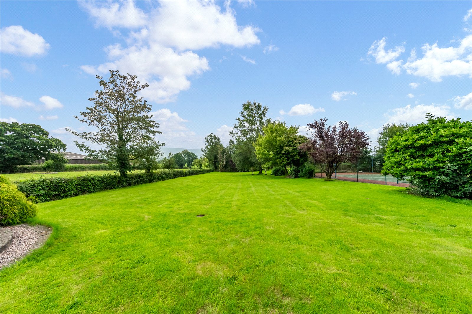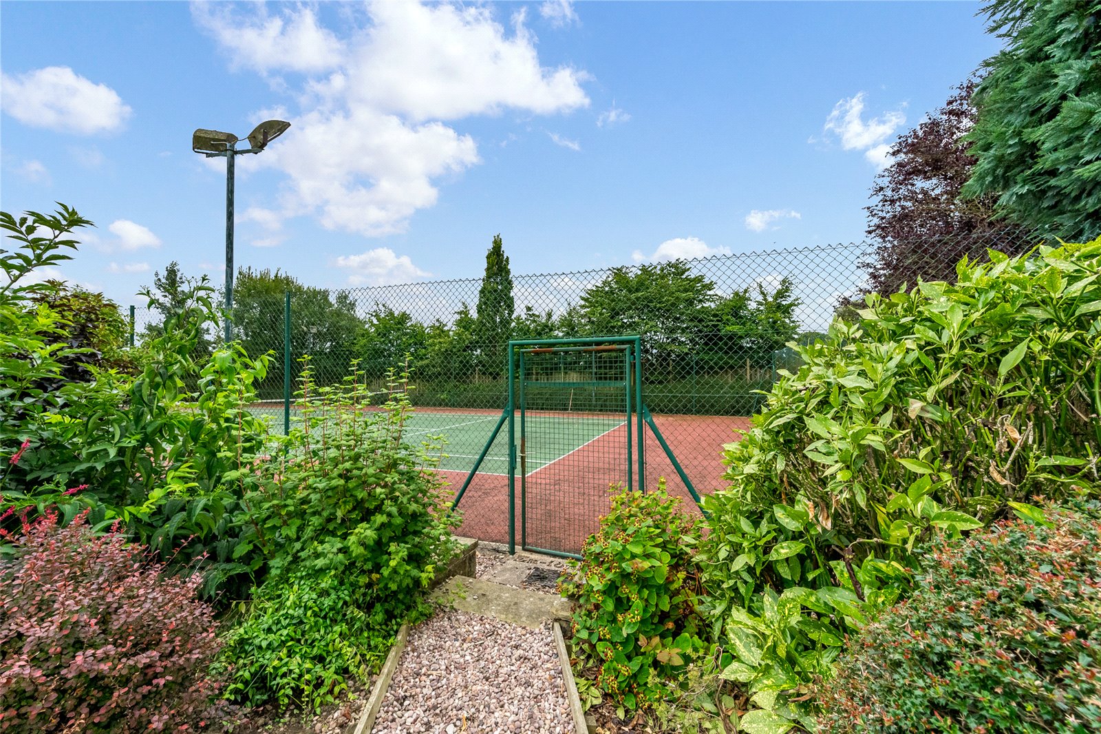 The outdoor space is equally impressive. Electric gates open to a spacious area providing ample parking, leading to two detached garages. The rear garden is a highlight, with a large flagged patio featuring a water feature and well-tended bedding area, extending to a lush lawn bordered by mature trees, shrubs and hedging. A floodlit tennis court adds to the appeal. One of the garages, has an electric up and over door, both equipped with power and lighting, and other outbuildings include a boiler room with wall mounted Worcester boiler and garden store.