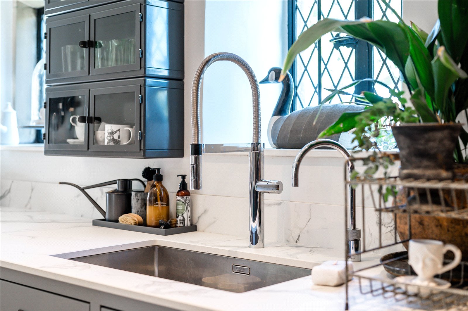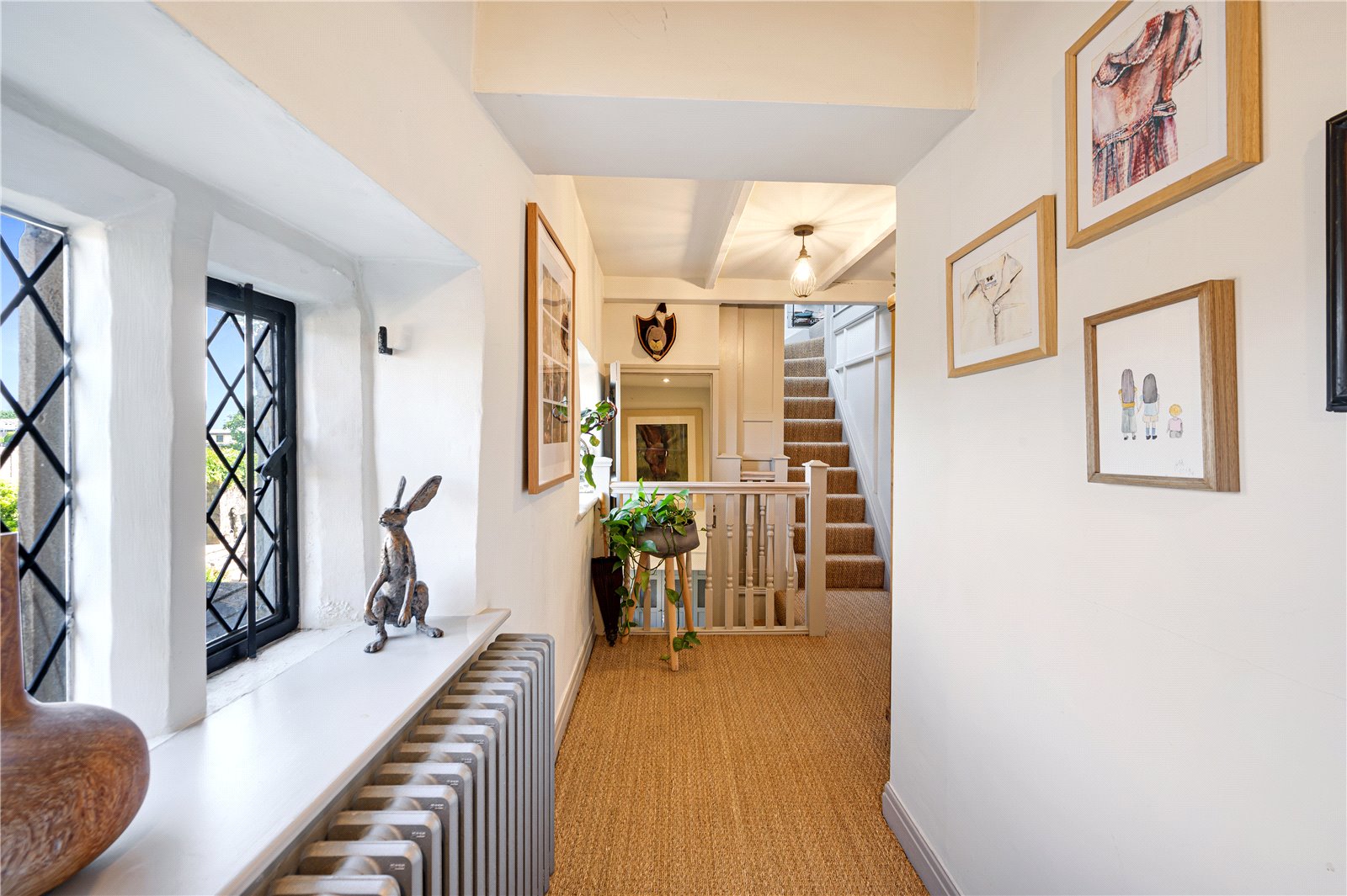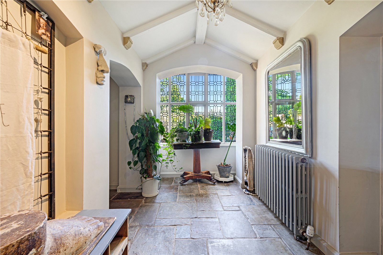 Stepping into the entrance hall, you'll be bathed in natural light, courtesy of the stunning leaded glass window that overlooks the decorative pond at the rear of the property. The hall exudes elegance with its beautiful flagstone flooring and cast iron radiators, setting the tone for the rest of the home. A few steps lead you into the fabulous and spacious family kitchen, the heart of the house.