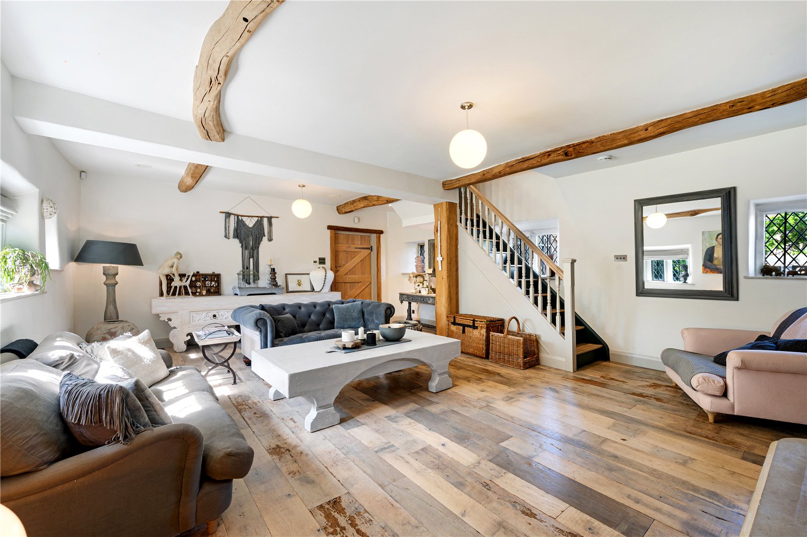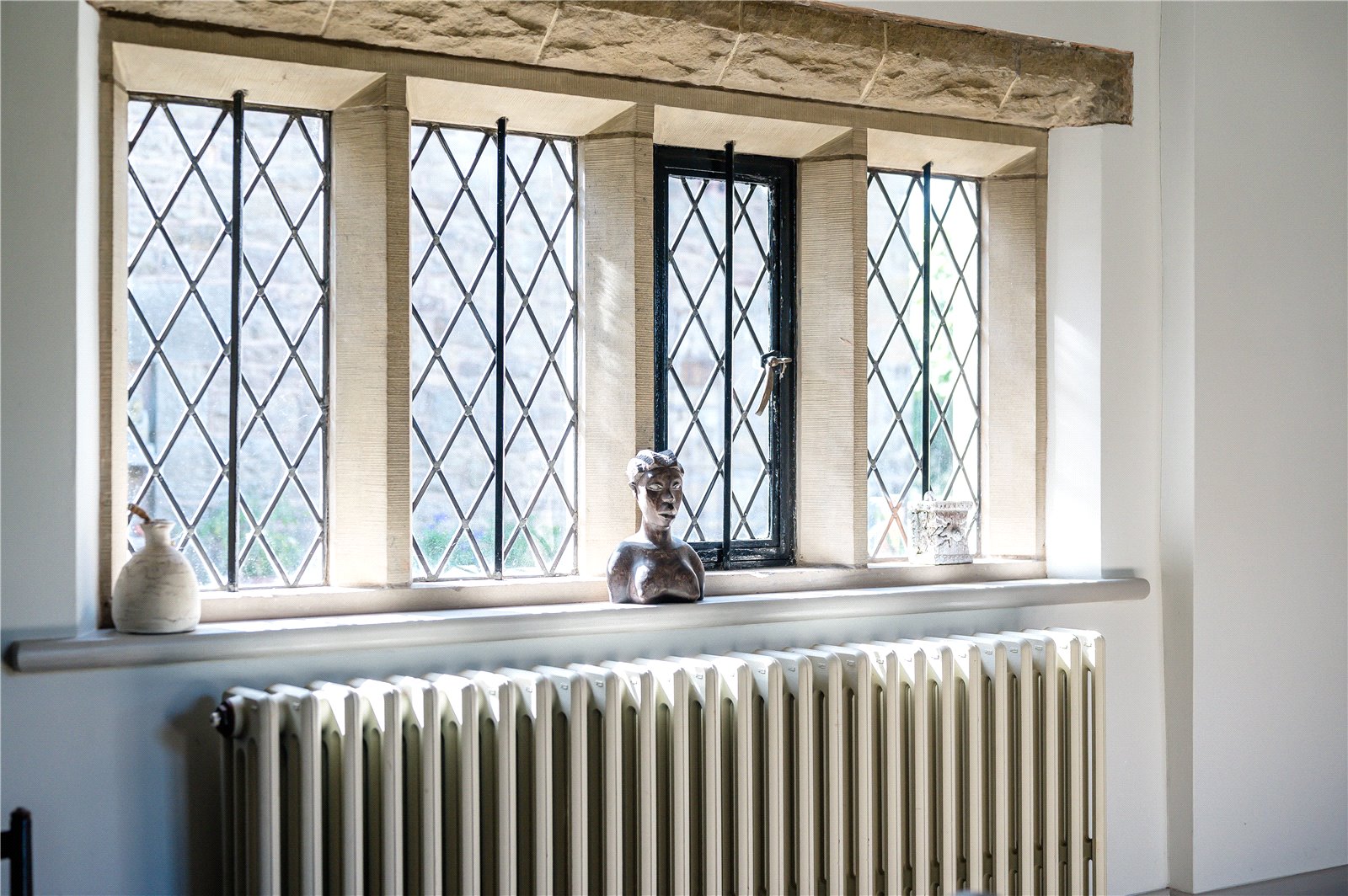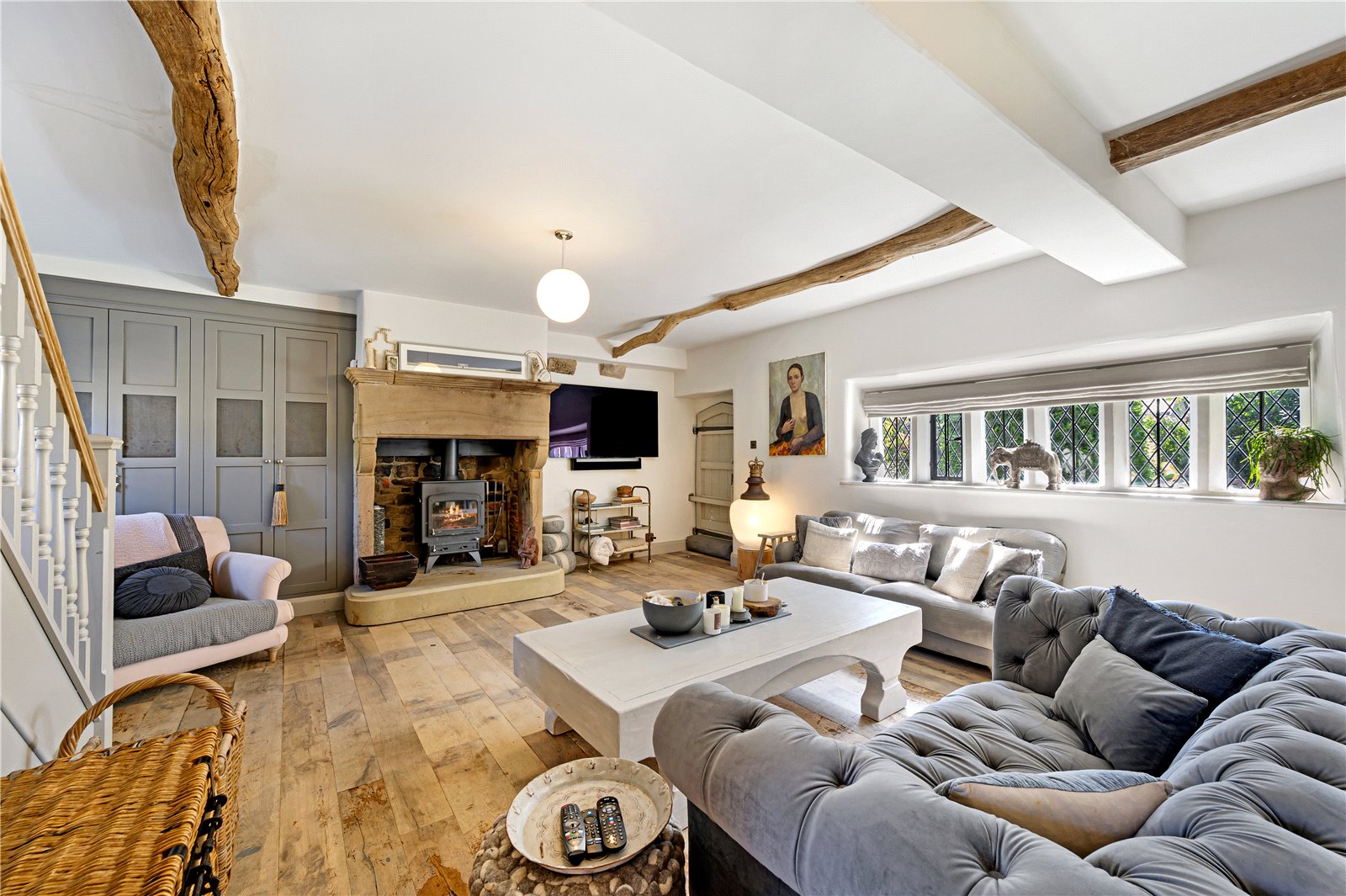 Continuing the seamless flow of luxury, the underfloor heating extends into the sitting room, where Ted Todd engineered boards adorn the floor, creating a delightful ambiance. This room occupies the oldest part of the house and features a charming wood-burning stove, dual aspect mullion windows, and the original front door of the property, proudly displaying the carved date of 1616 on the lintel, along with the initials AH, believed to be Adam Hoghton.