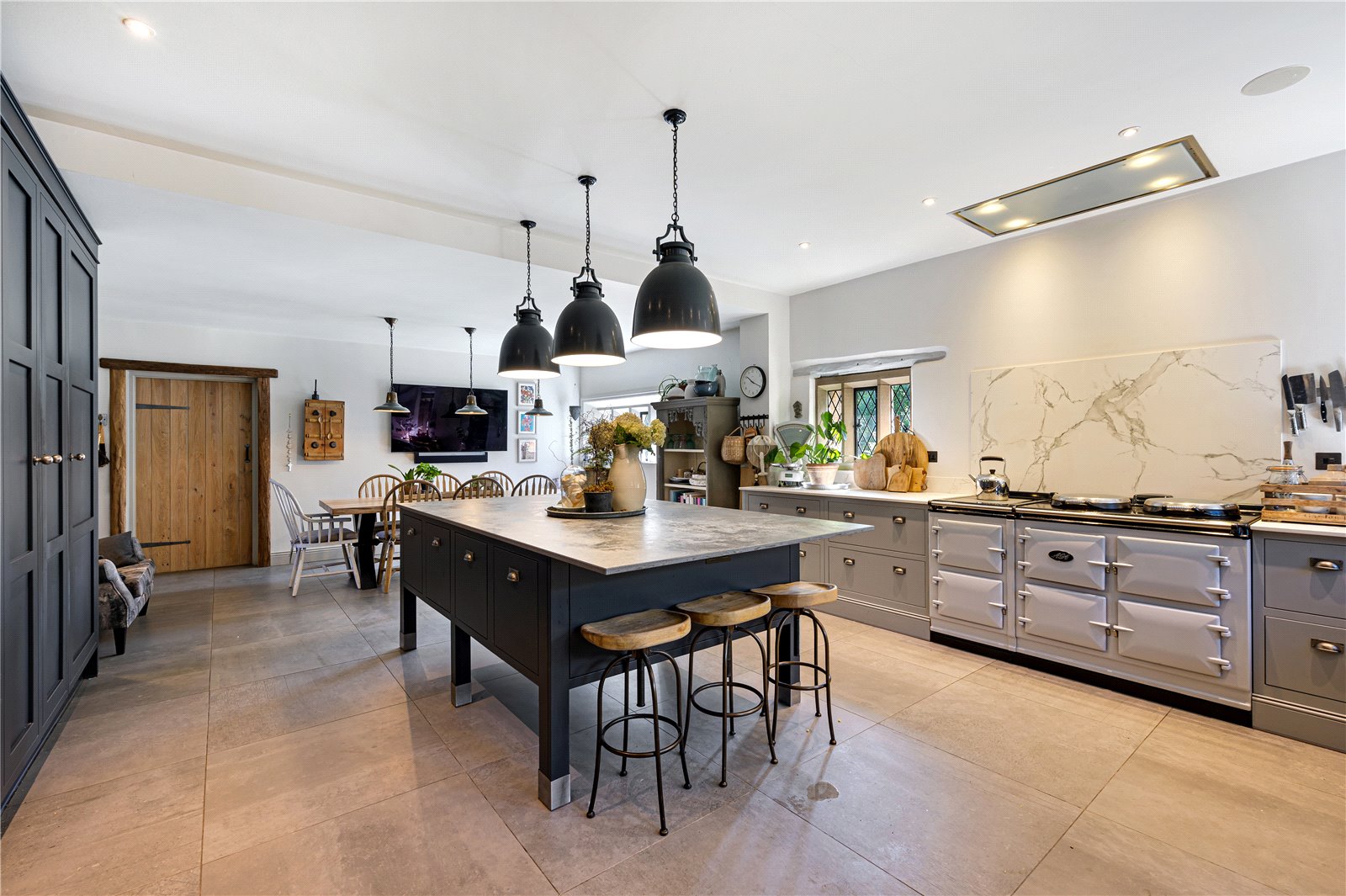 The kitchen is a chef's dream, centered around a large island featuring luxurious Dekton work surfaces. The culinary capabilities are enhanced by a three-oven electric Aga, adding character and convenience to this exceptional space. The kitchen also boasts two dishwashers, an integrated fridge and freezer, pantry cupboard, as well as a wine fridge and drinks cupboard, making it perfect for entertaining. With six sets of mullion windows, natural light cascades into the kitchen and dining area, which comfortably accommodates an eight-seater country kitchen-style table. The tiled floor with underfloor heating ensures absolute comfort throughout the space.