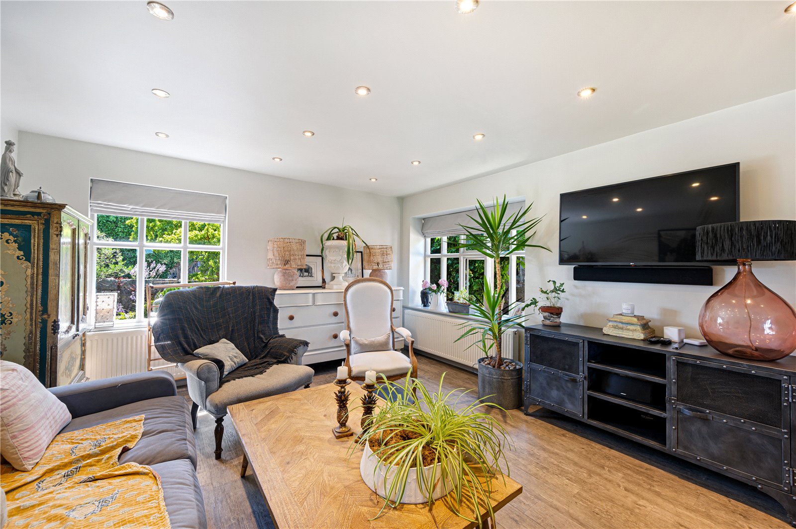 On the other side of the entrance hall, you'll find a second reception area, partially floored with engineered boards and a herringbone sea grass carpet, providing a warm and inviting space during the winter months. Cast iron radiators and a wood-burning stove add to the cozy atmosphere. Double French doors open into a small courtyard nestled between the main house and the bungalow annexe, offering a peaceful retreat.